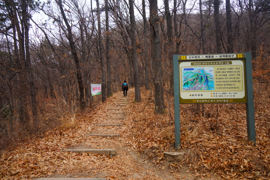 산허리를 도는 편안한 길을 20여분 걸어 개울에 걸린 나무다리를 건넙니다. 앞서 거쳤던 체육공원에서 왔던 길을 되짚어 만덕역에 도착합니다.
