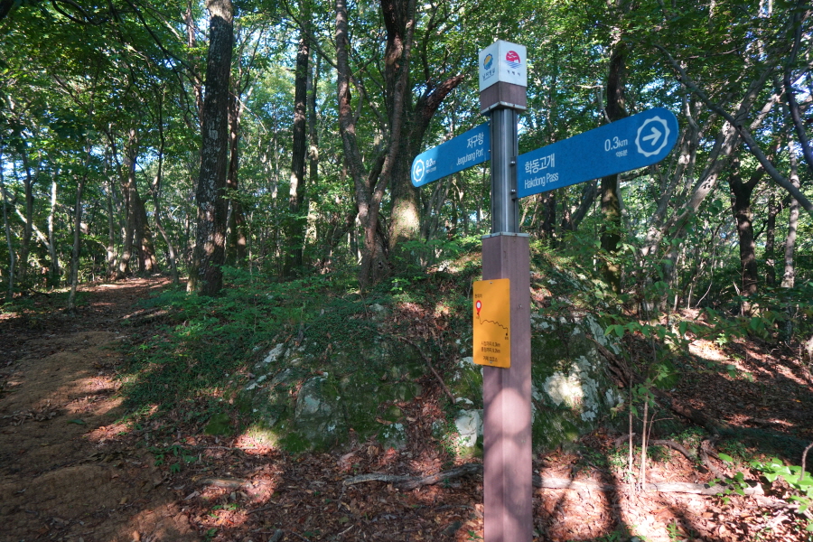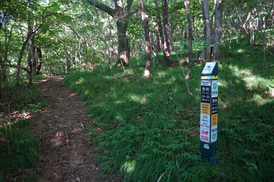 계수대를 빠져나가면 저구 삼거리(8.8㎞)·가라산(5.2㎞) 이정표가 길안내를 합니다. 당연히 있어야 할 노자산 방향 이정표는 안 보입니다. 국립공원 경계를 알리는 노란 표석이 서 있고. 현위치 번호 표지목이 일정한 거리를 두고 길 안내를 합니다.