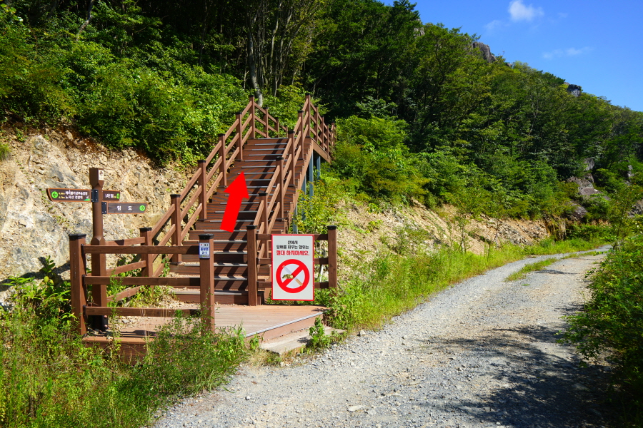 10분이면 임도를 벗어나 왼쪽 노자산으로 덱 계단을 오릅니다.