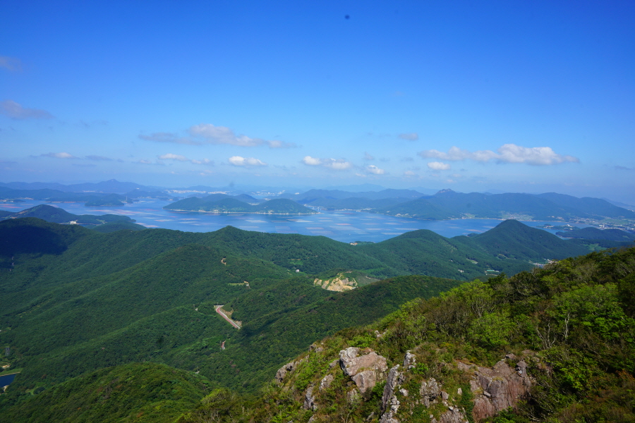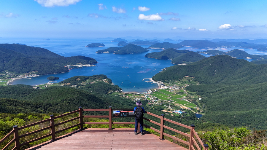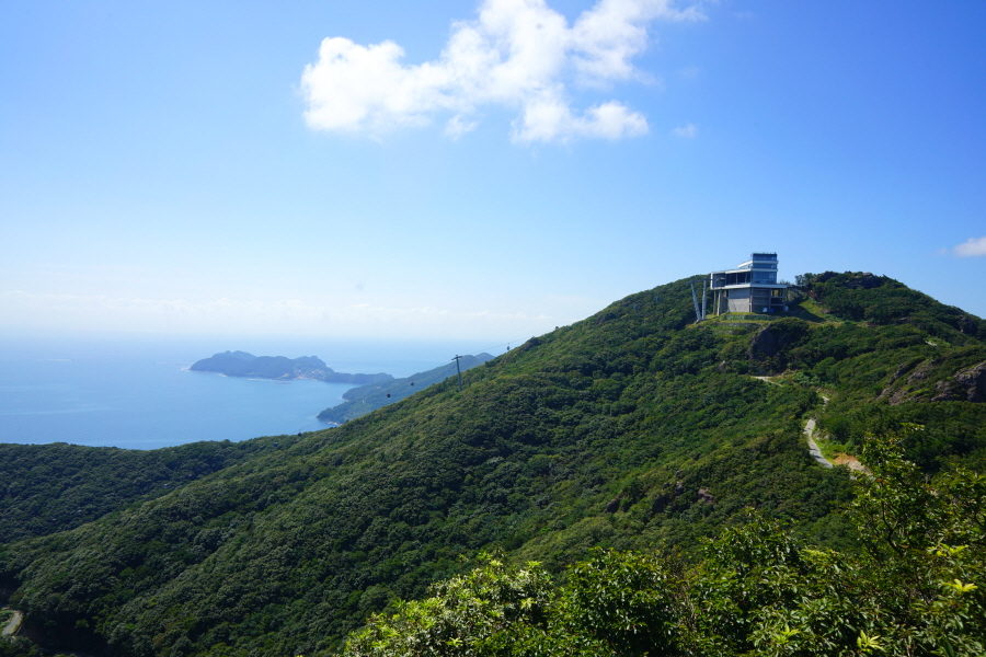 동서남북으로 장쾌한 조망이 열립니다. 남쪽 윤슬케이블카정류장에서 시계방향으로 망산 매물도 왕조산 연화도 욕지도 추봉도 두미도 한산도 남해도 미륵산 산달도 산방산 계룡산 선자산 대금산 국사봉 옥녀봉 북병산 공곶이 해금강 등이 파노라마로 펼쳐지는 조망 맛집입니다. 서쪽 발아래 탑포항과 율포항이 하트 모양을 했습니다.