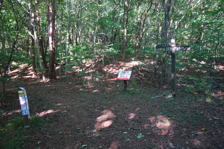 차단기를 거쳐 5분이면 임도 삼거리가 나옵니다. 왼쪽 등산로(0.2㎞)방향으로 능선을 내려갑니다. 직진은 자연휴양림으로 가는 임도이며. 오른쪽은 노자산으로 향합니다.