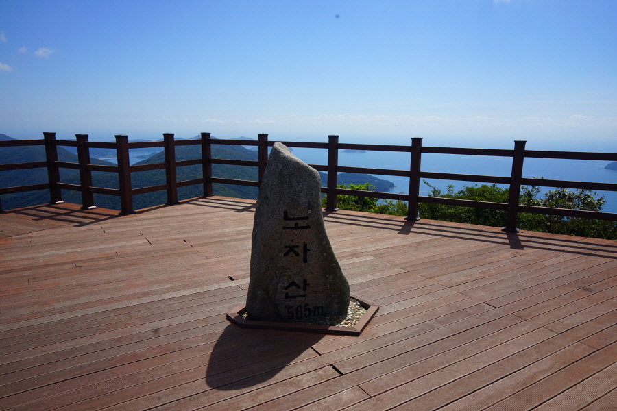300m 거리인데 두 곳의 덱 전망대를 거쳐 약 10분이면 나무 덱이 넓게 깔린 노자산 상봉에 섭니다.