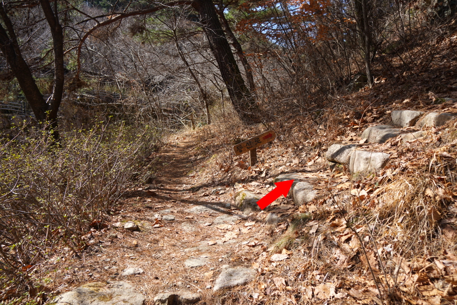 계곡을 왼쪽에 끼고 돌계단을 올라가면 갈림길입니다. 등산로 팻말이 가리키는 오른쪽으로 틀어 능선을 오릅니다.