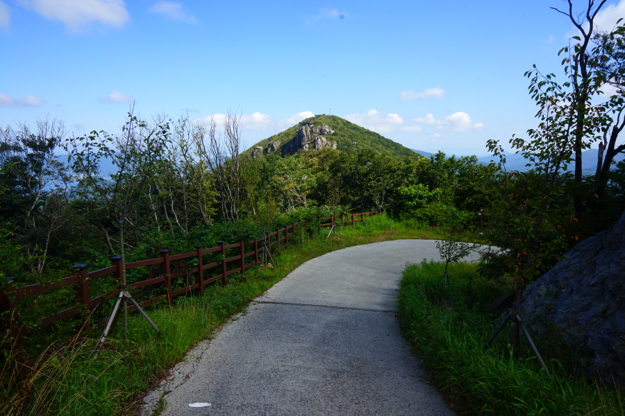 봉우리에 서면 동서남북 조망이 열립니다. 북쪽으로 가야할 노자산과 전망대, 케이블카상부승강장인 윤슬정류장이, 남쪽에는 힘차게 뻗은 능선이 가라산을 연결하고 그 뒤로 망산이 펼쳐집니다.