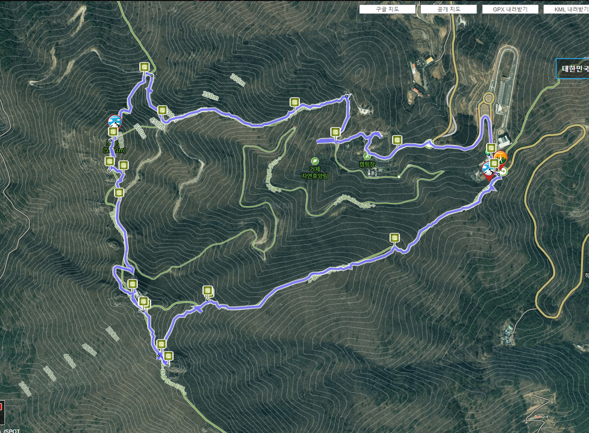 산행경로는 다음과 같습니다. 노자산등산로주차장~학동고개~노자산·거제휴양림 갈림길~약수터~벼늘 바위 삼거리~가라산·노자산 주능선 삼거리~마늘바위~가라산·노자산 주능선 삼거리~덱 전망대~케이블카상부 윤슬정류장~임도~노자산정상·임도 갈림길~두 곳의 댁 전망대~노자산 정상~산불초소~임도~노자산정상·자연휴양림(임도)·해양사 갈림길~임도 삼거리~자연휴양림 (노자산 2 코스 입구)~산림문화휴양관~거제자연휴양림매표소~휴양림 입구 도로~케이블카 입구 회전교차로를 거쳐 노자산등산로주차장으로 되돌아오는 원점회귀 산행입니다. 산행 거리는 약 6㎞이며. 3시간30분 안팎 걸립니다. 마늘바위에서 노자산에 이르는 능선의 조망이 워낙 빼어나 산행 시간은 큰 의미가 없습니다.