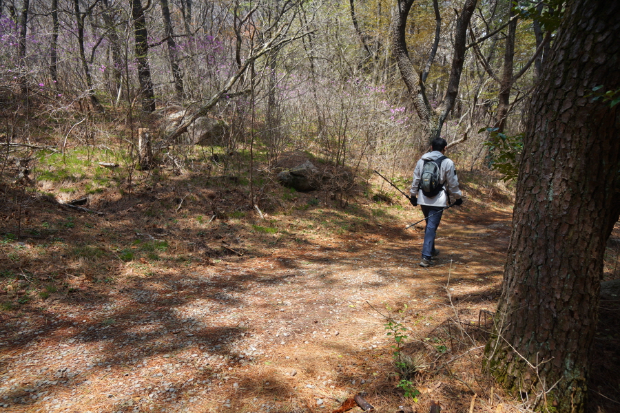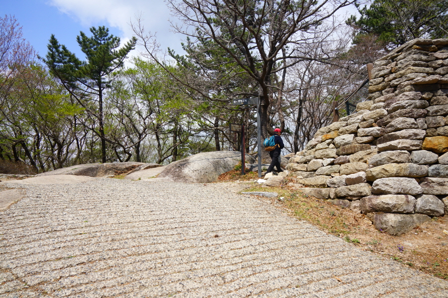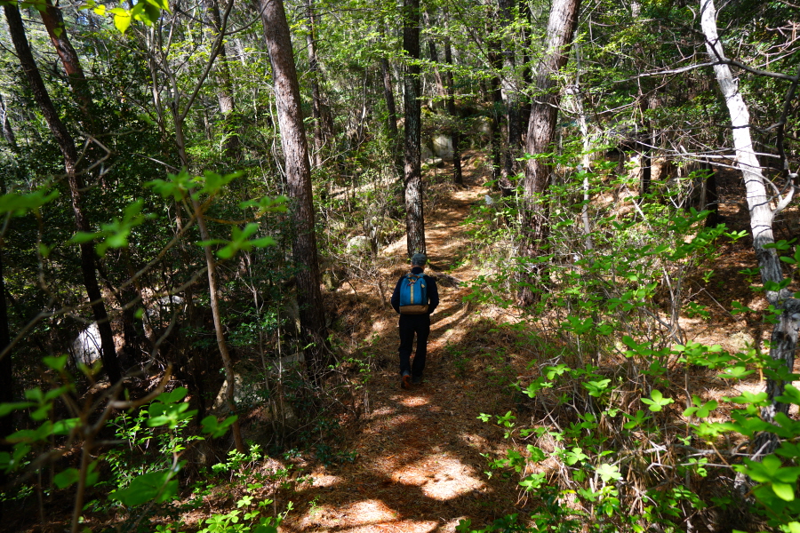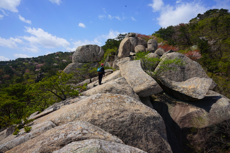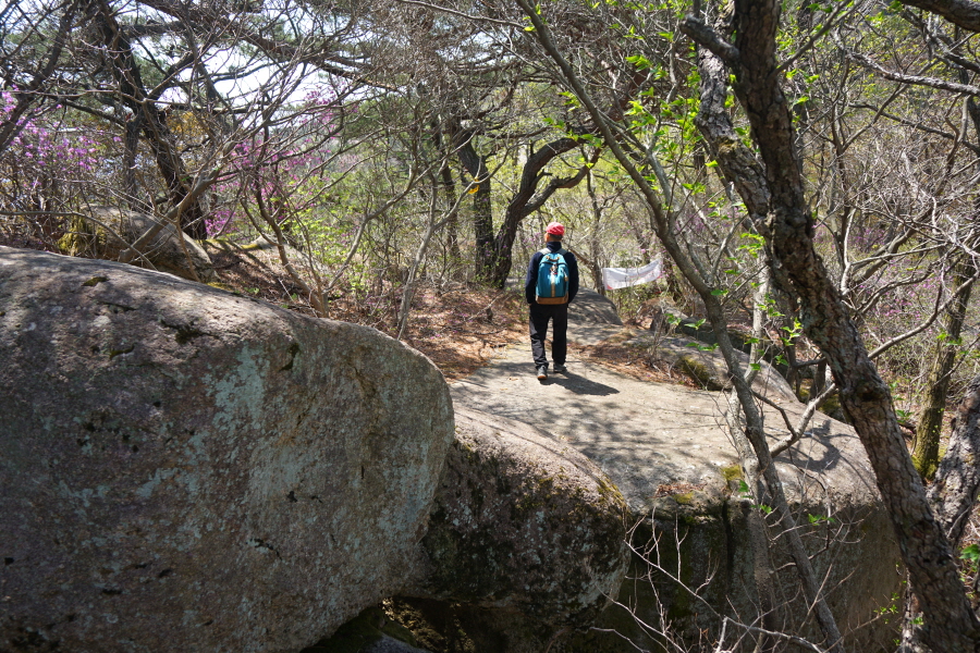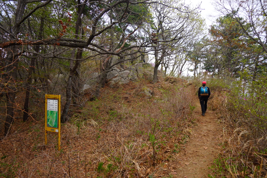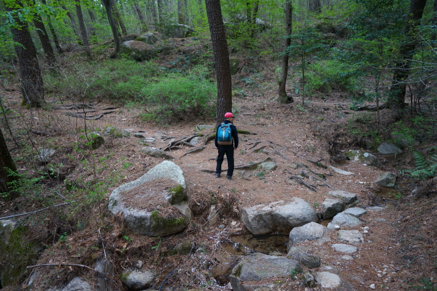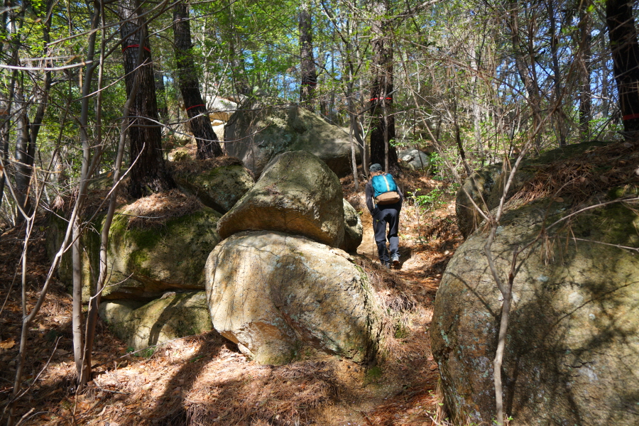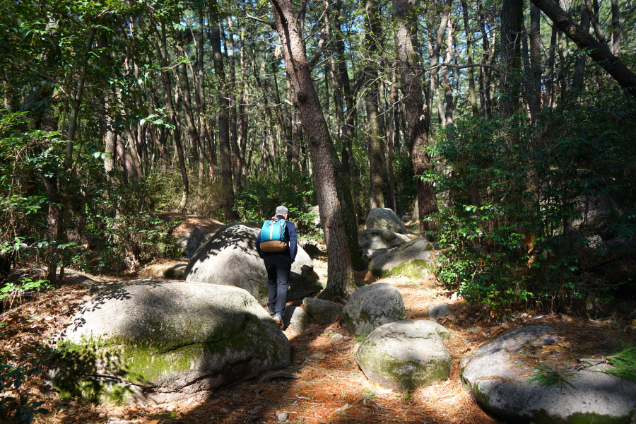 바로 나오는 갈림길에서 왼쪽이며, 능선에 올라섭니다. 초반은 여느 산과 마찬가지로 마사에 소나무 숲길이 완만하게 이어지며, 크고 작은 바위가 나타나고 그 사이로 산길이 이어집니다.
