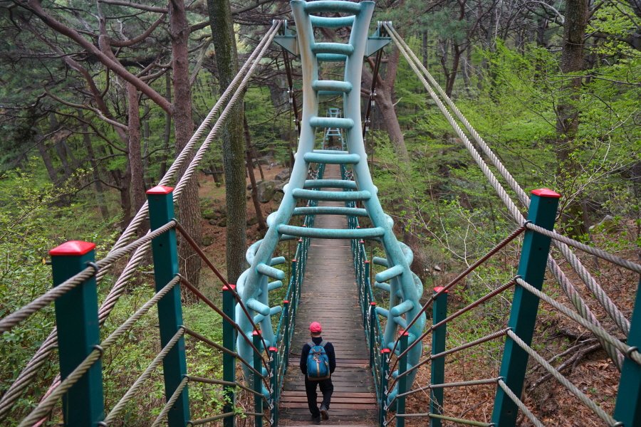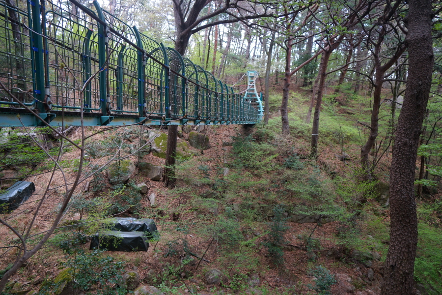 이제부터 산허리를 에돌아가는 길입니다. 7, 8분이면 이정표가 선 삼거리에서 왼쪽 식물원(2.0㎞)으로 틀어 덱 계단을 내려가면 삼밭골에 걸린 길이 62m 구름다리를 지납니다.