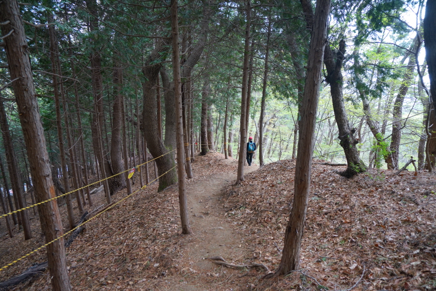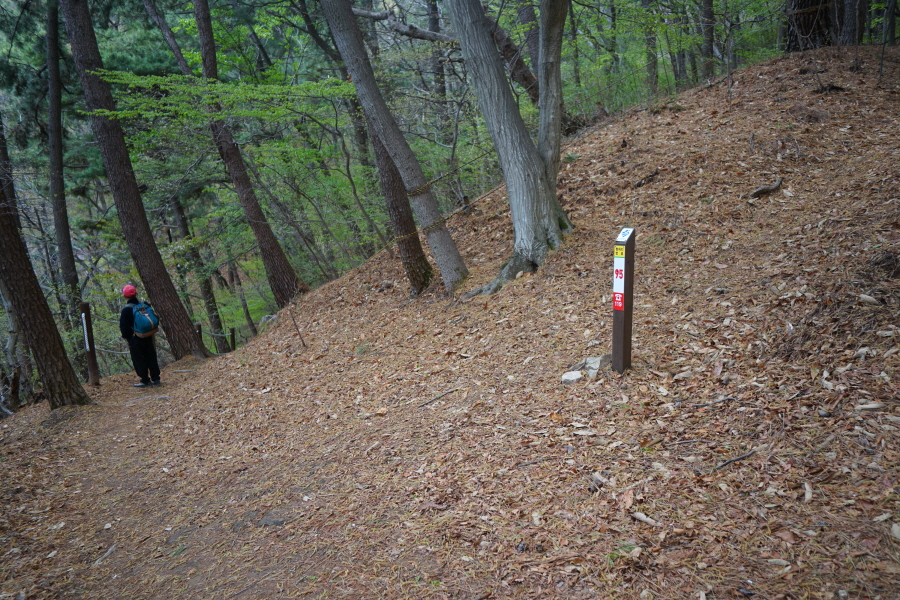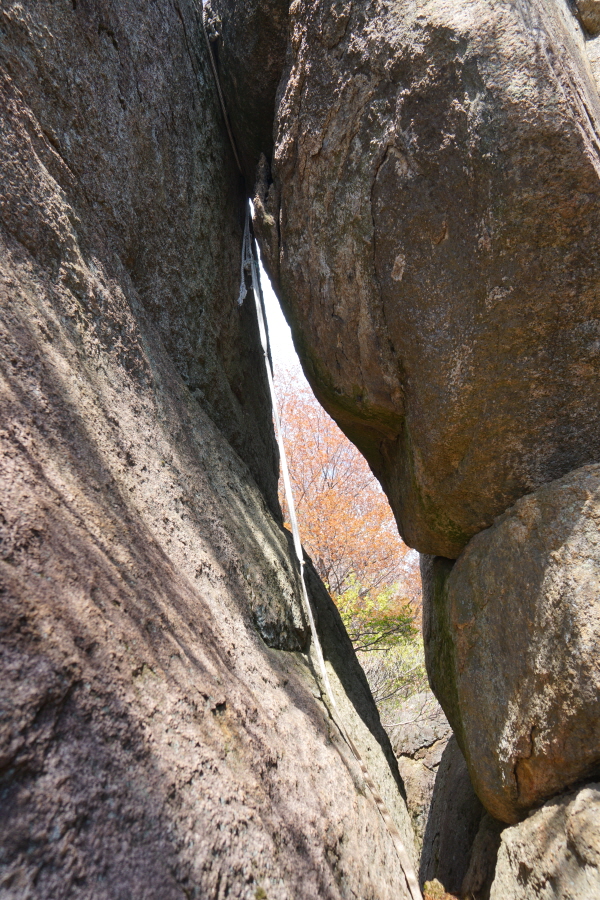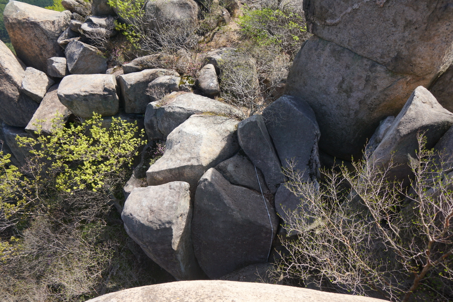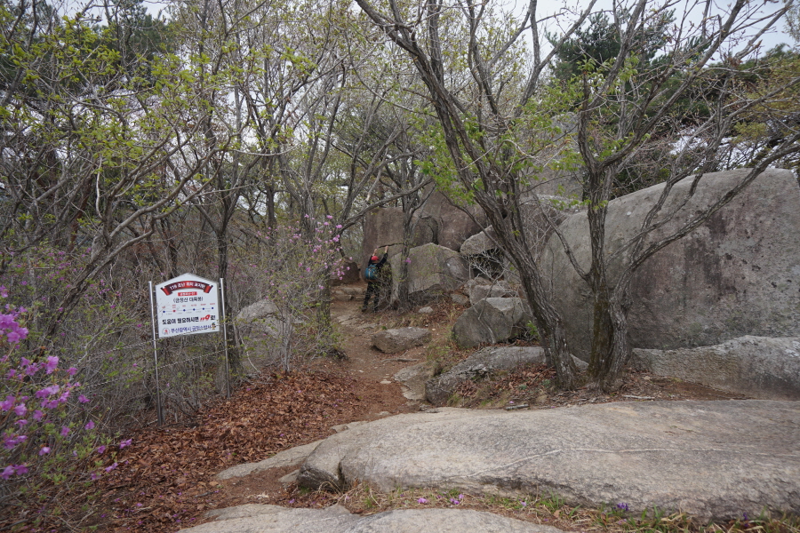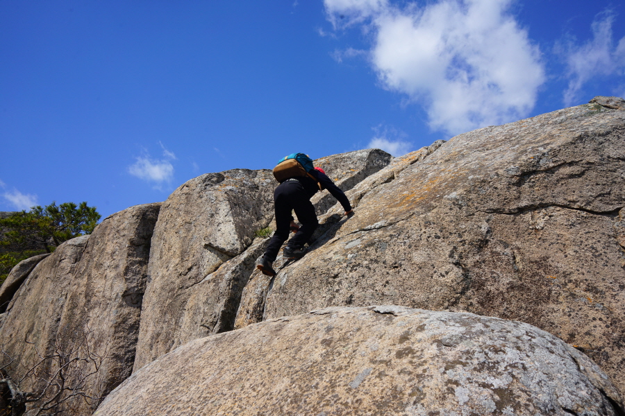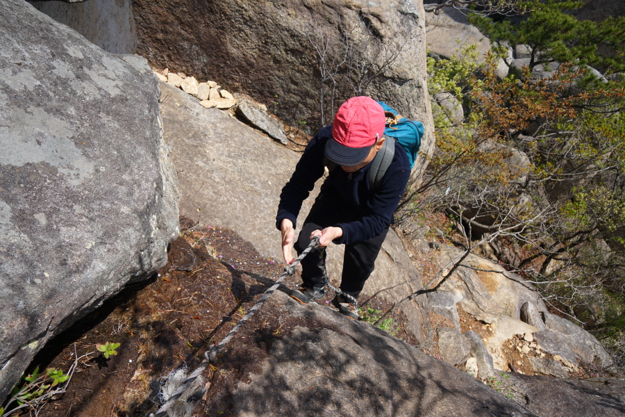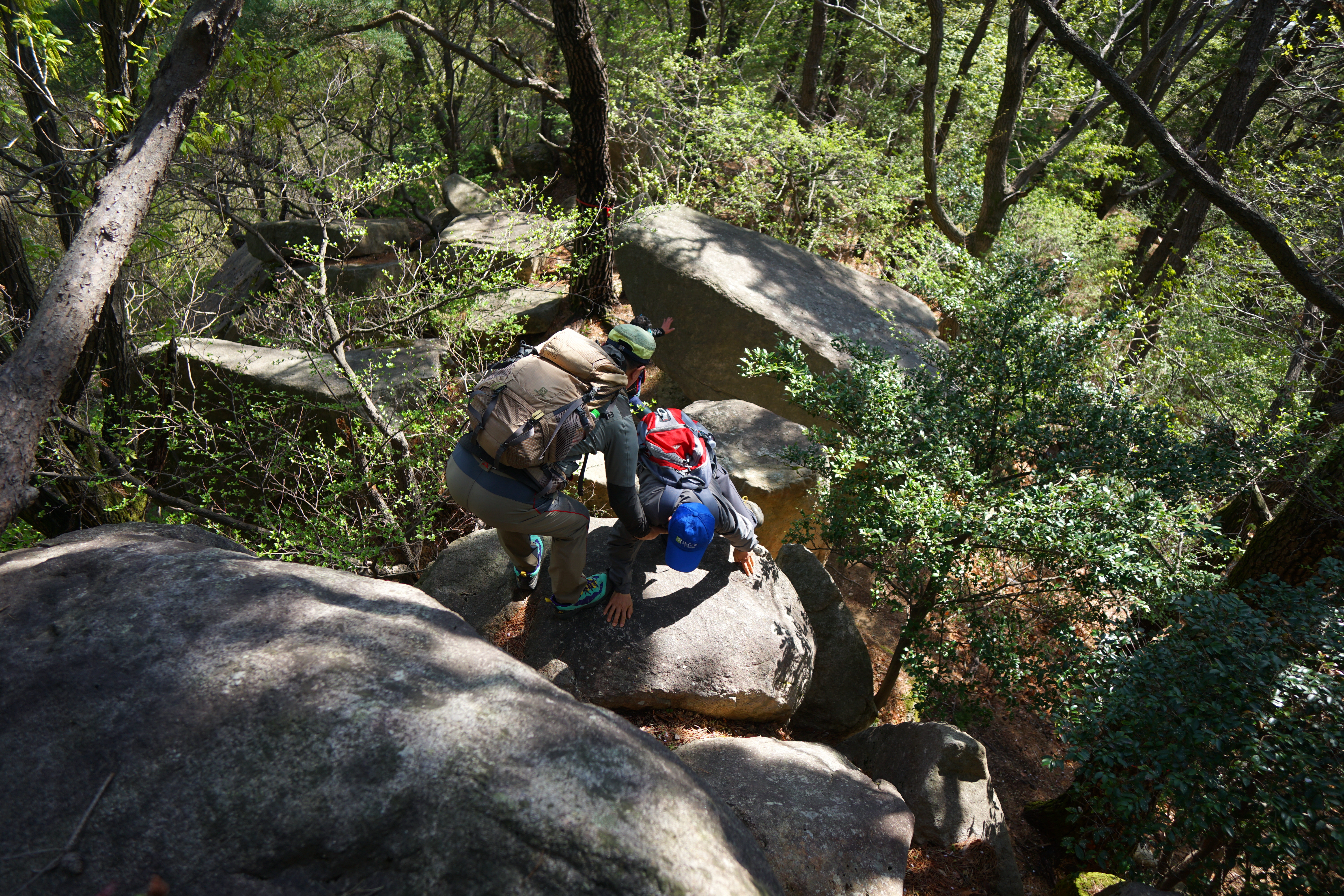 그 가운데로 내려가는 까칠한 로프 구간이 또 나옵니다. 몸을 돌릴 때 주의해야 합니다. 광명사에서 출발해 2시간30분 정도 조망을 즐기며 바위와 씨름하면 아기자기 능선의 바윗길도 끝나고 우회 길과 만나 평범한 솔숲 길을 걷습니다.