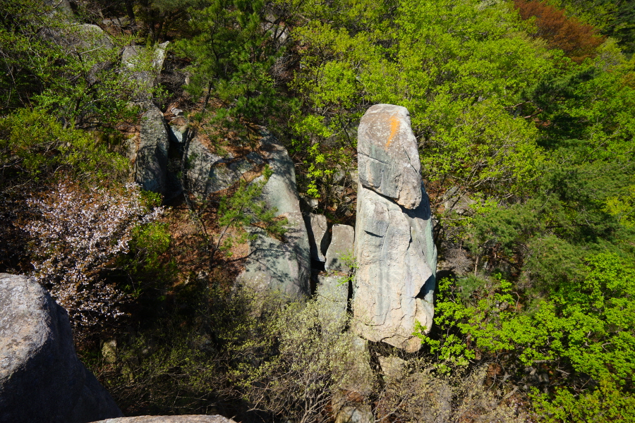 다시 암릉을 올라탑니다. 갈라진 바위틈에 꽂혀 있는 작은 소나무를 살짝 잡고 경사진 바위를 올라가면 죽순처럼 돋아 난 바위 전시장이 또 나옵니다.