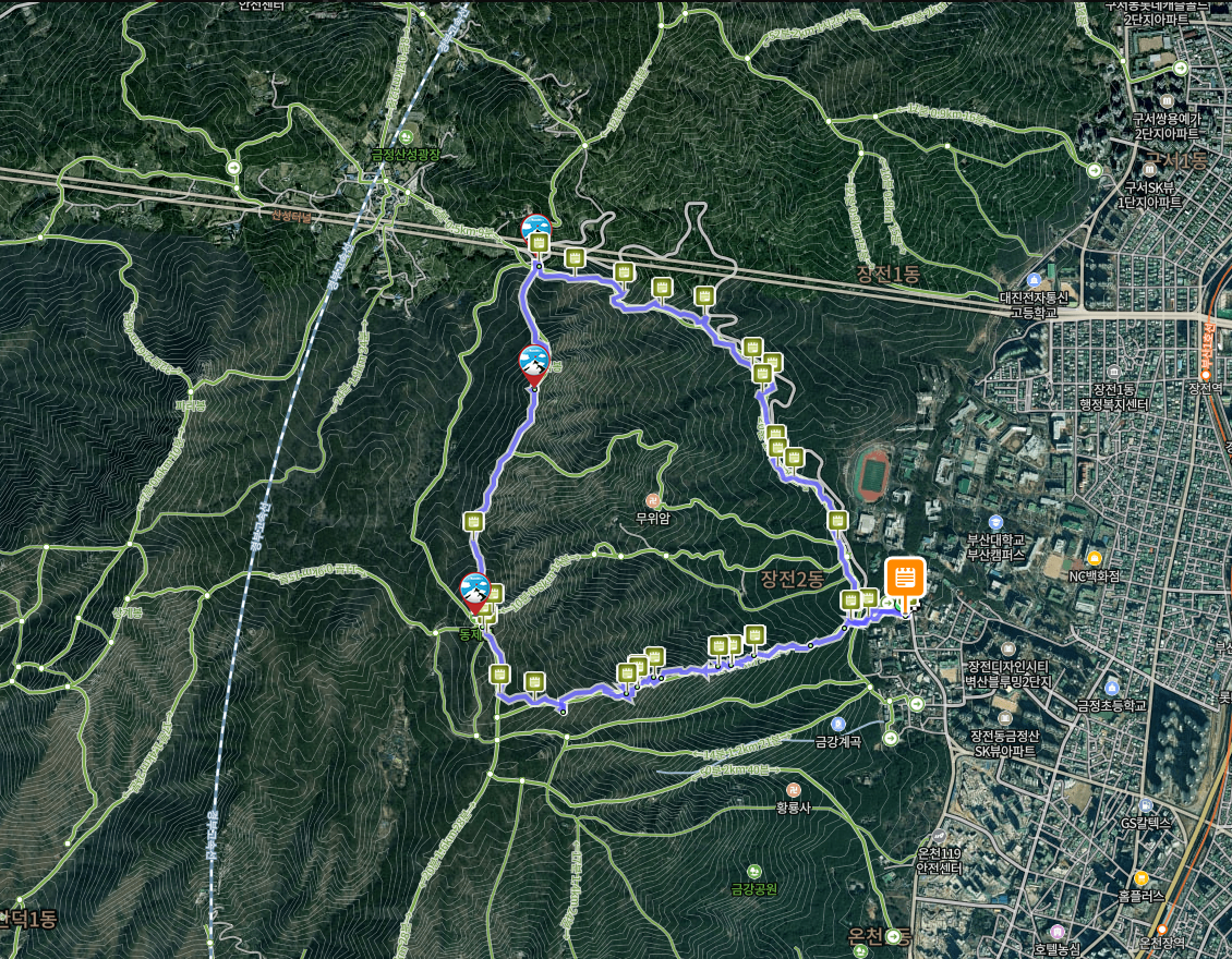 금정산 아기자기 능선~대륙봉 산행 경로는 다음과 같습니다. 광명사정류장~절 일주문 앞~광명사와 규림요양병원 사이 골목길~현위치 번호 9-1 표지목~금정산 숲속 둘레길 사거리(장전-12 표지목)~현위치 번호 9-2 표지목~아기자기 능선(암릉)~휴정암 임도~동제봉(2망루)~안부 사거리~대륙봉~산성고개~203번 남문 버스정류장~편백숲~고별대~구름다리~정자~무위암·보광암 임도~ 금정산 숲속 둘레길 사거리~광명사 버스정류장에 도착하는 원점회귀 코스입니다. 산행 거리는 약 7㎞ 이며 4시간30분 안팎 걸립니다. 아기자기 능선의 바윗길과 펼쳐지는 조망으로 산행 시간은 큰 의미가 없습니다.