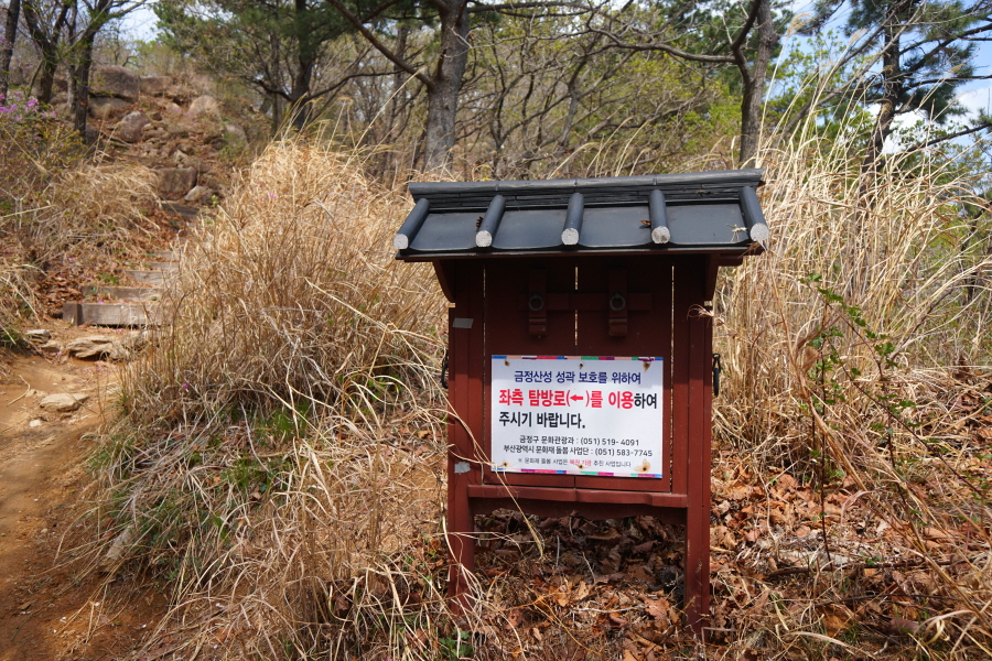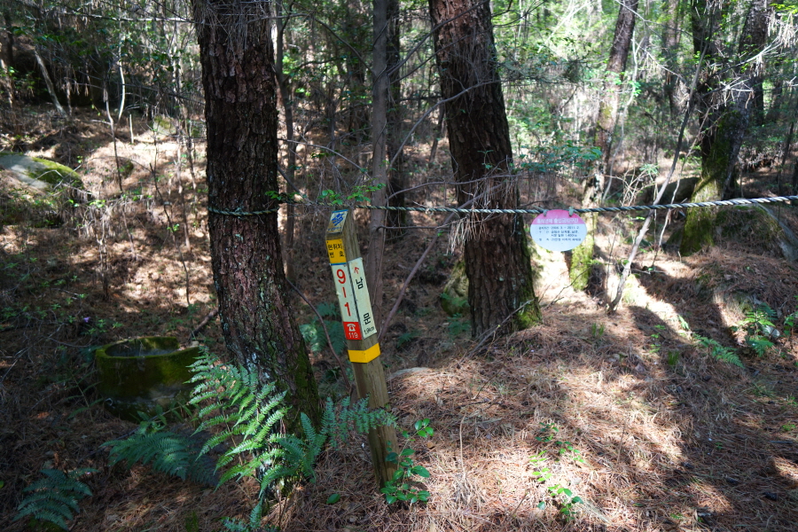 절 뒤편 개울을 건너 남문 1.9 ㎞ 현위치 번호 9-1번 표지목을 만났다면 산길은 제대로 찾은 샘입니다. 여기를 지나 약 3분이면 금정산 숲속 둘레길 사거리에 올라섭니다.