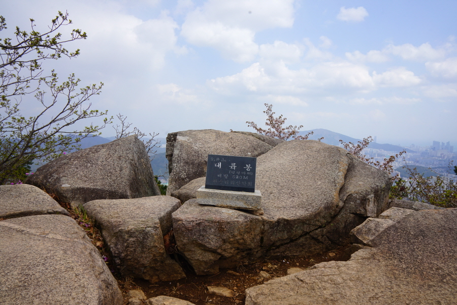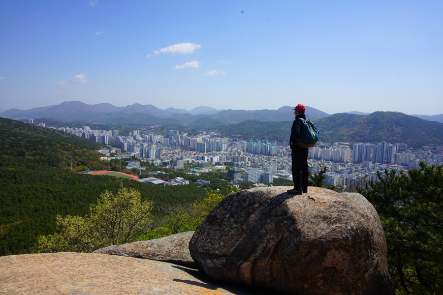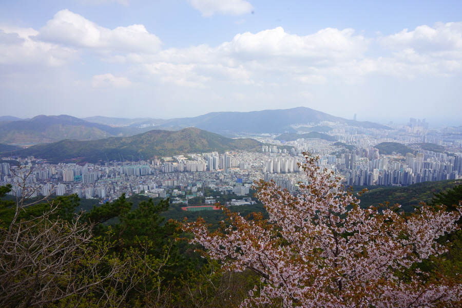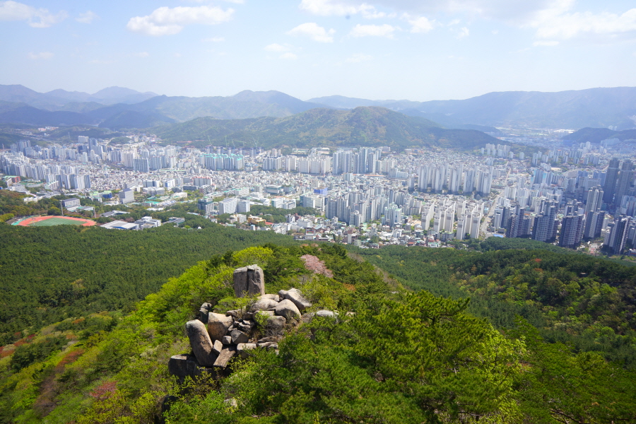 넘어 온 천태만상(千態萬象)의 바위와 왼쪽 철마산에서 시계방향으로 거문산 달음산 아홉산 개좌산 운봉산 일광산 윤산 장산 센텀시티 광안대교 금련산 황령산 등이, 발아래는 부산대 캠퍼스와 금정구 동래구의 수많은 아파트 단지가 펼쳐집니다.