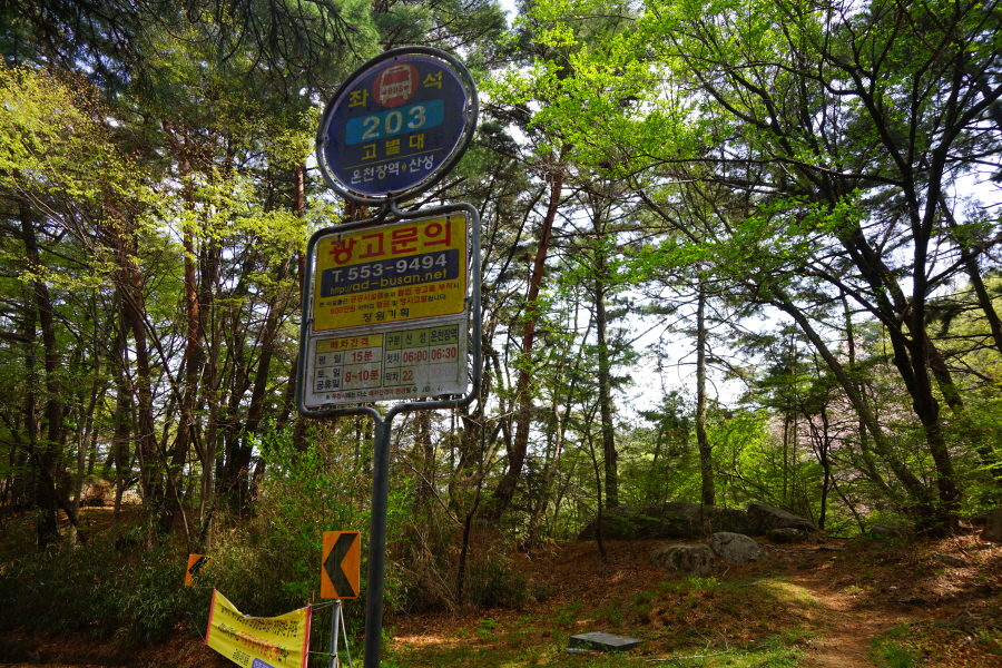 현위치 번호 96번을 지나 95번 표지목에서 오른쪽입니다. 약 25분이면 버스정류장이 있는 ‘고별대’를 통과합니다.