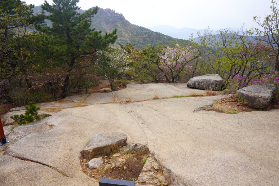 바위에 걸린 로프를 잡고 내려갔다 다시 올라가면 암반 전망대가 또 나옵니다. 암릉을 우회해도 여기 전망대서 만나는데 조망이 넓게 열립니다.