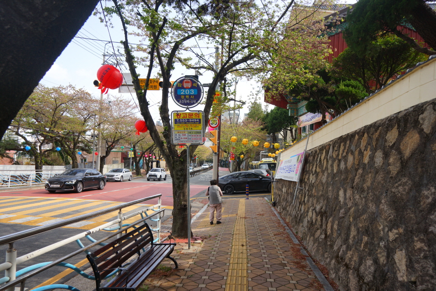 금정산성 올라가는 입구에 있어 승용차로 가면 주차할 만한 곳이 없으니 대중교통이 더 낫습니다. 승용차 이용 때는 부산 금정구 금샘로 51 ‘광명사’를 내비게이션 목적지로 설정합니다. 대중교통은 도시철도 1호선 온천장역 3번 출구를 나와 도로 건너편 203번 좌석버스를 이용합니다. 온천장버스정류장에서 첫차 오전 6시30분에 출발하며 평일은 15분, 주말과 공휴일은 8~10분 간격으로 다닙니다. 광명사정류장에서 내립니다. 산행 뒤 산성마을에서 밤 10시에 막차가 출발하며 남문 입구, 고별대, 광명사정류장을 거쳐 온천장역으로 갑니다.