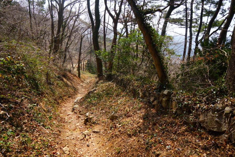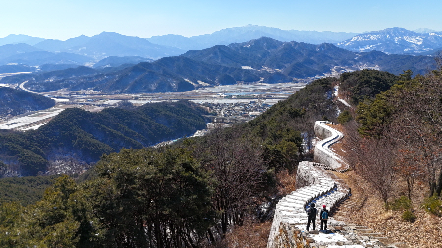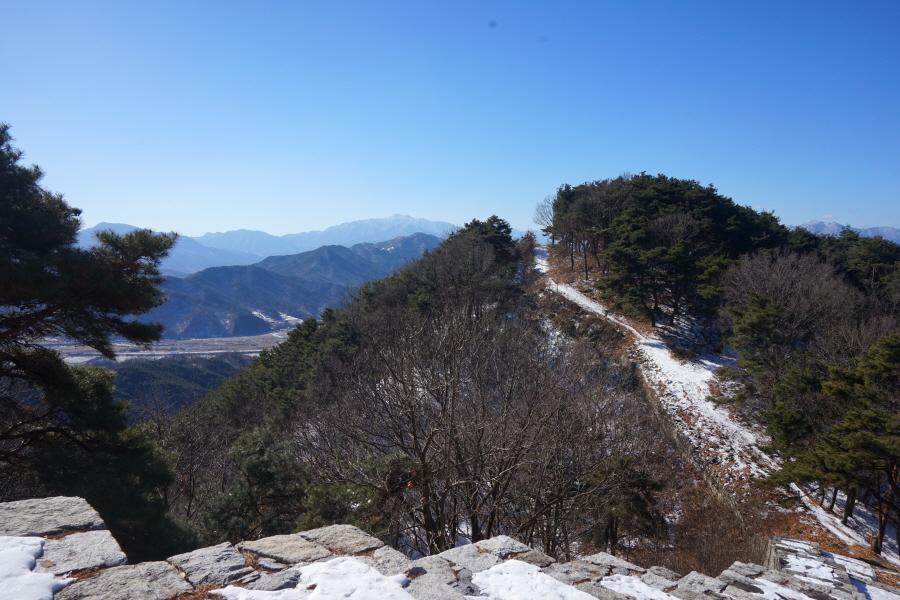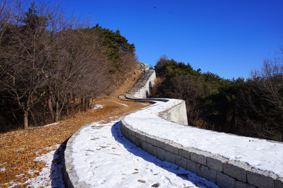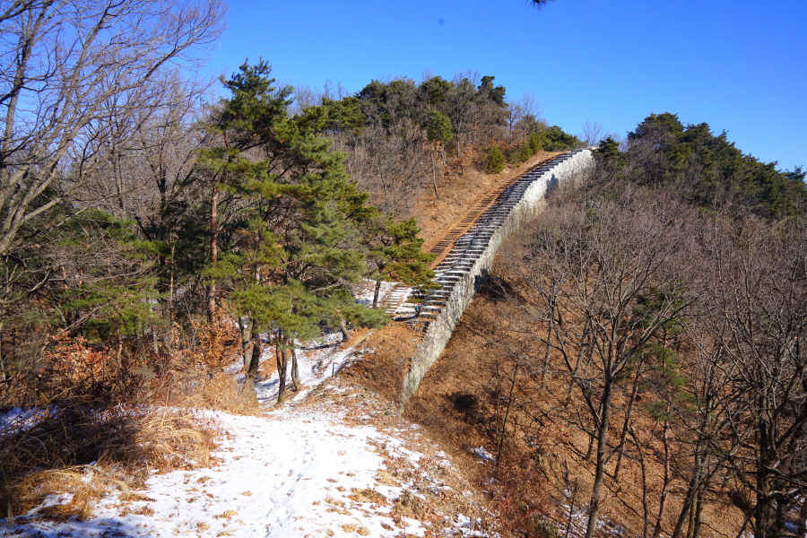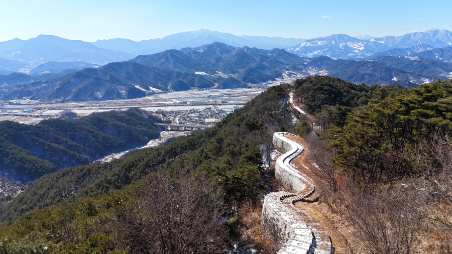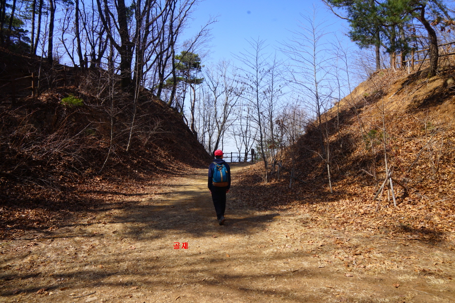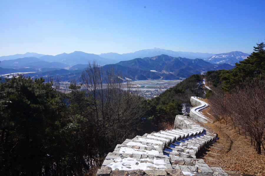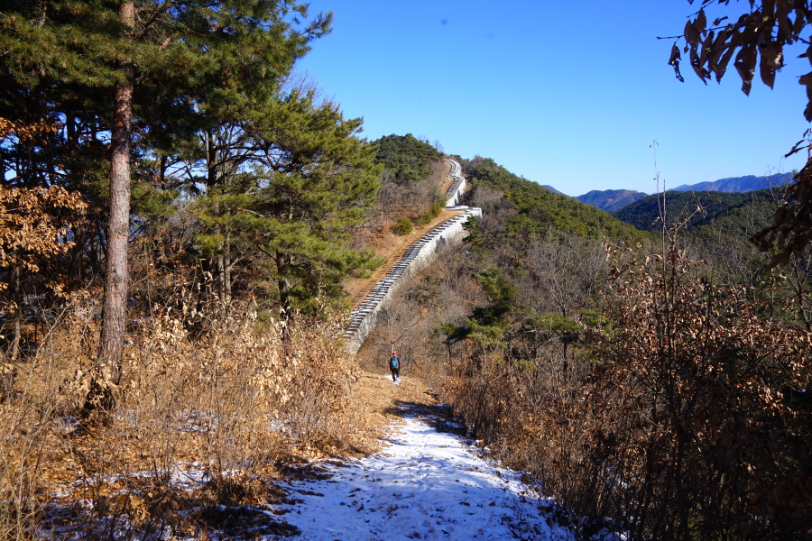 명활성 탐방로는 선덕여왕의 부왕이었던 진평왕릉 주차장에서 출발한합니다. 양지마을을 빠져나가면 명활성 탐방로 이정표가 서 있습니다. 오른쪽 3발굴지(2.4㎞)로 향합니다. 구릉 같은 완만한 산길이 이어지며 탐방로를 따라 두툼하게 생긴 긴 언덕이 무너진 명활성 흔적입니다. 일부 산성과 북문지는 발굴해 복원한 상태입니다. 3 발굴지에 서면 조망이 열립니다. 보문댐과 북천변의 동궁원이 보이며, 멀리 낙동정맥 능선과 천북면 서산의 풍력단지가 펼쳐집니다.