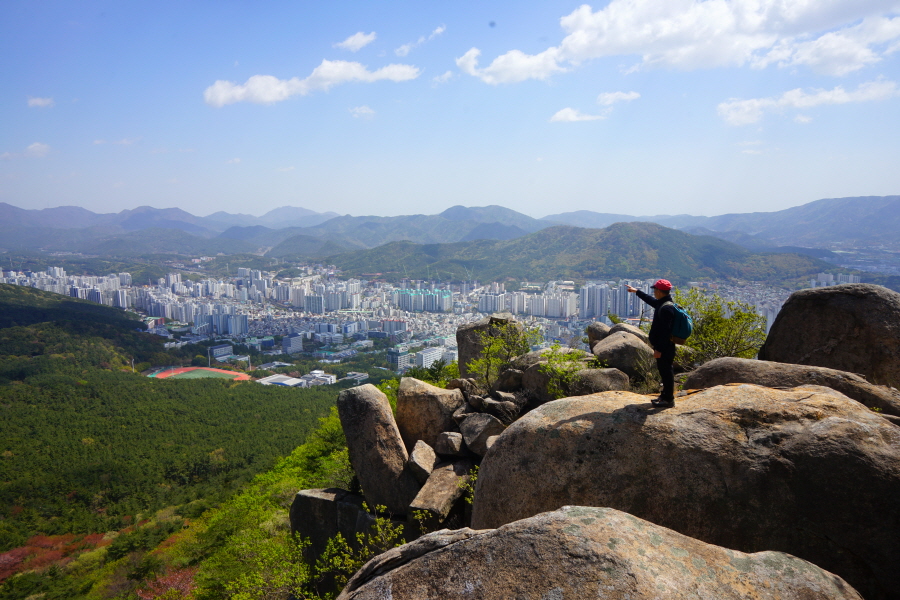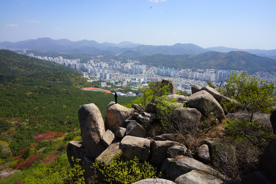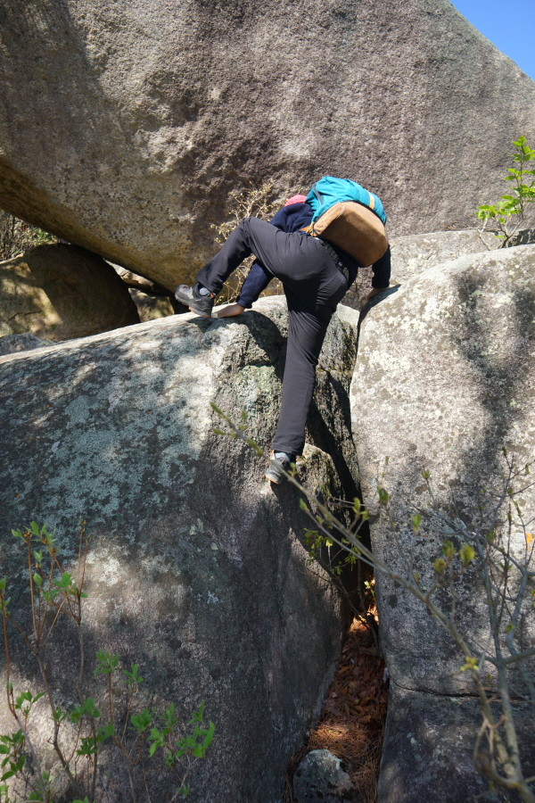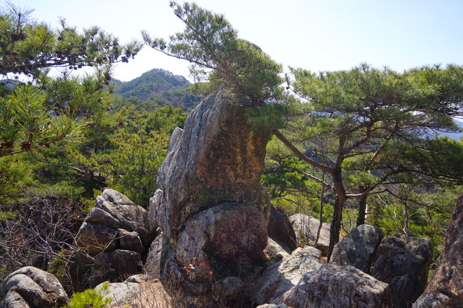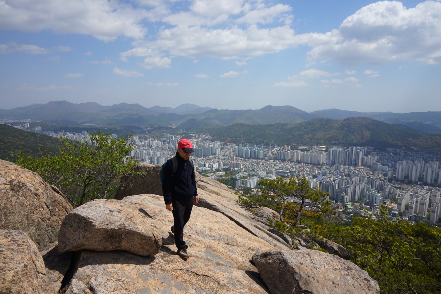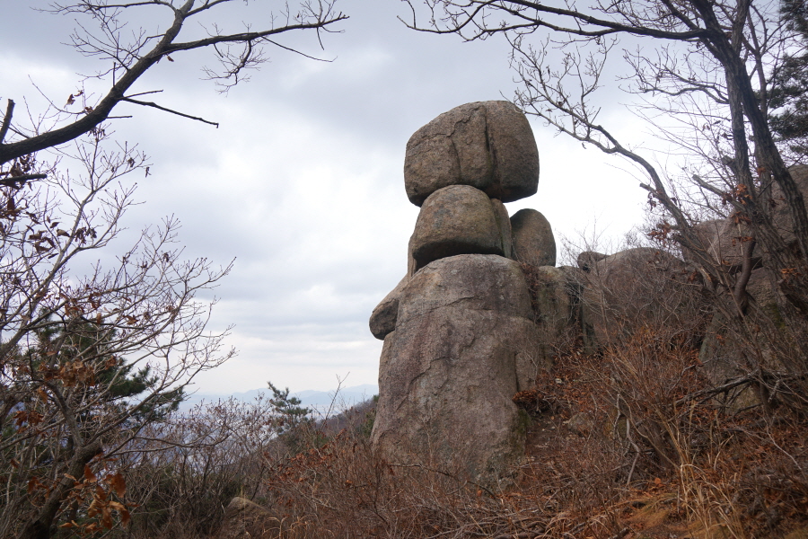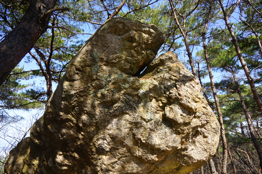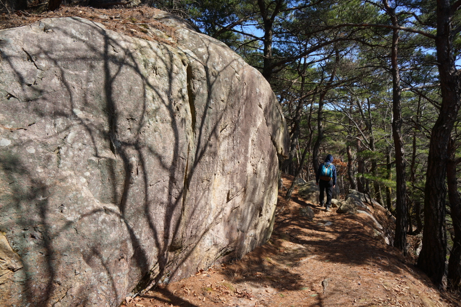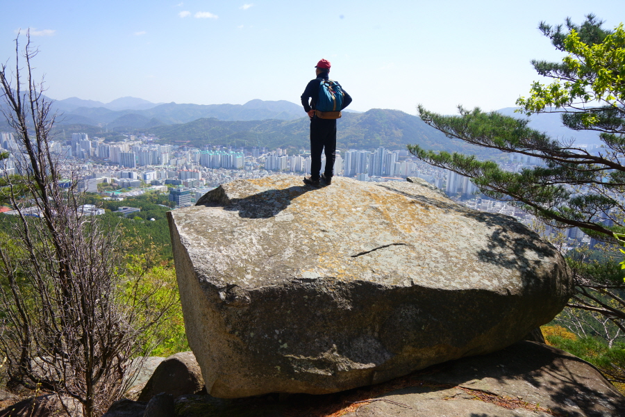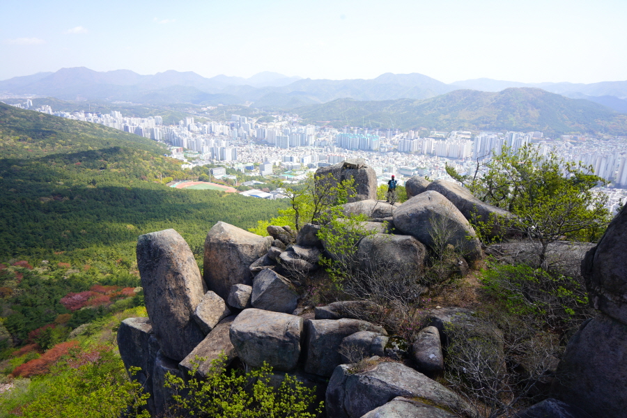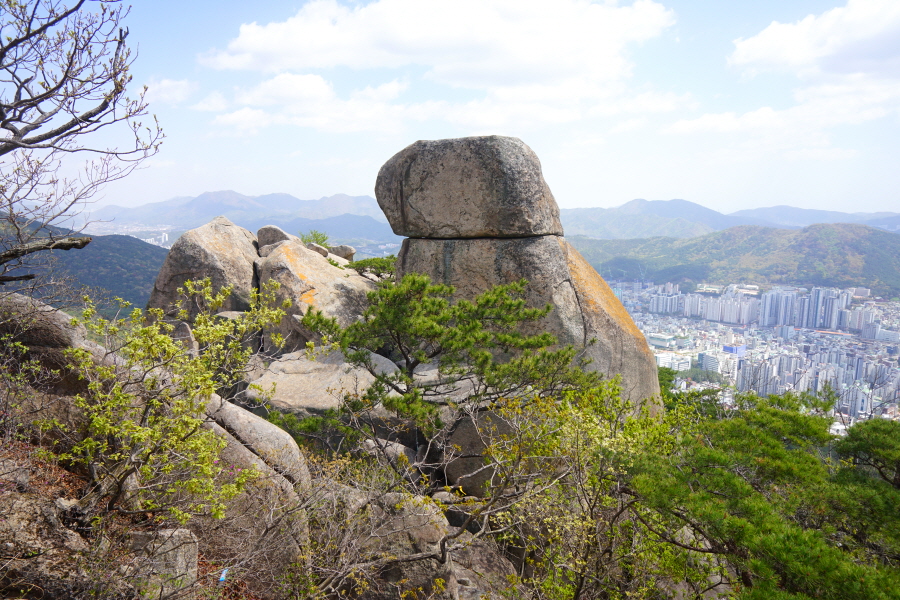 금정산의 다양한 바위 코스 중에서 일반 등산객도 쉽게 암릉에 접근해 바위를 탈 수 있는 게 금정구 장전동 광명사 입구에서 출발하는 아기자기 능선입니다. 광명사에서 20분 남짓 제 2망루 방향으로 흙길 능선을 오르면 바위길이 시작합니다. 고인돌 바위, 포개진 바위, 남근석을 닮은 선바위, 남해 금산의 쌍홍문을 닮은 구멍이 두개 뚫린 바위, 부처님이 참선 했을 법한 광배를 두른 좌선대 등 천태만상(千態萬象)의 다양한 바위가 나타납니다.
