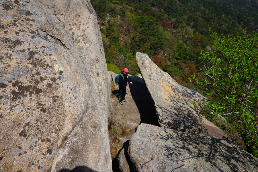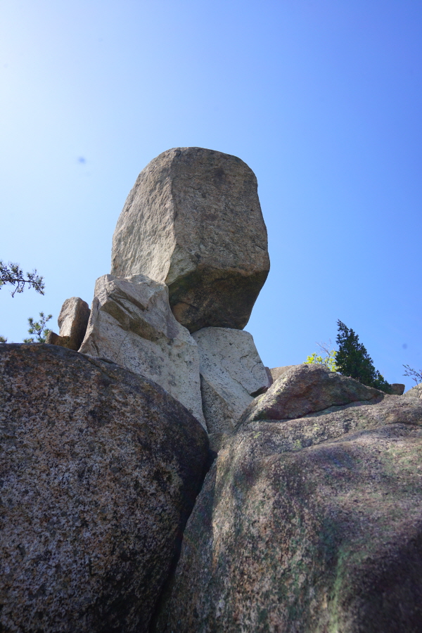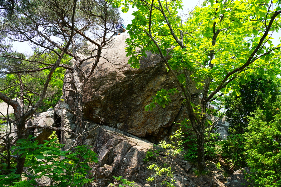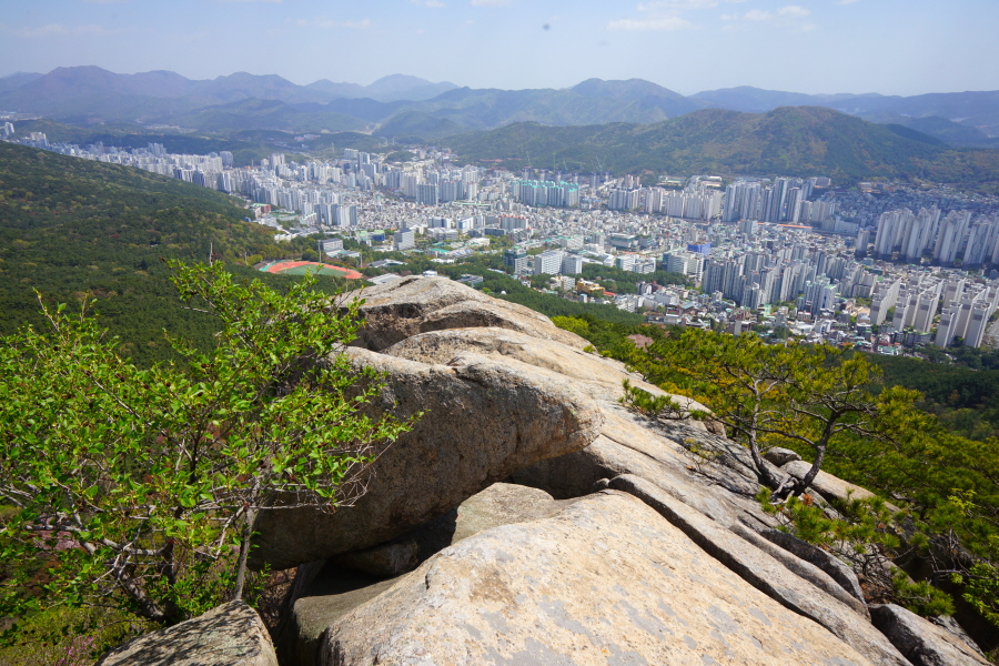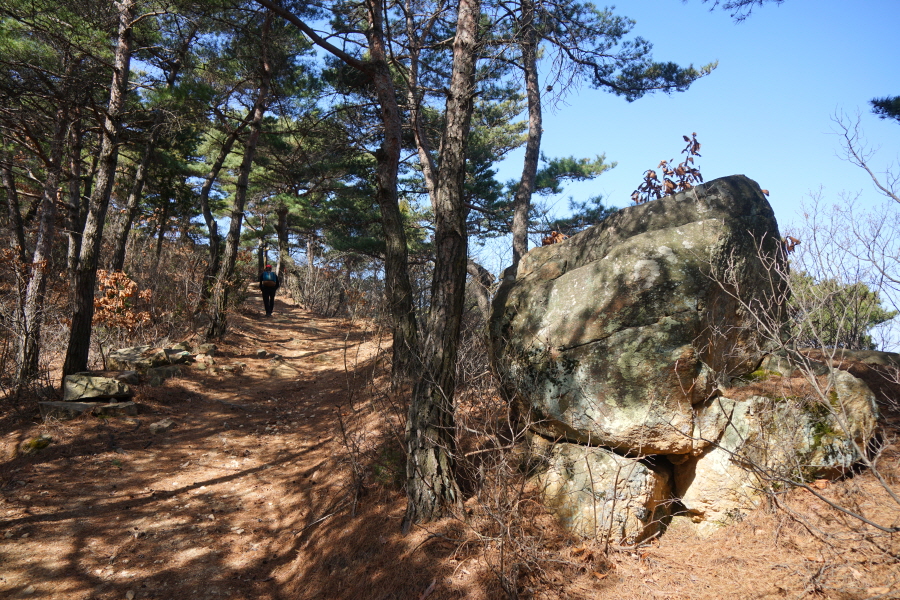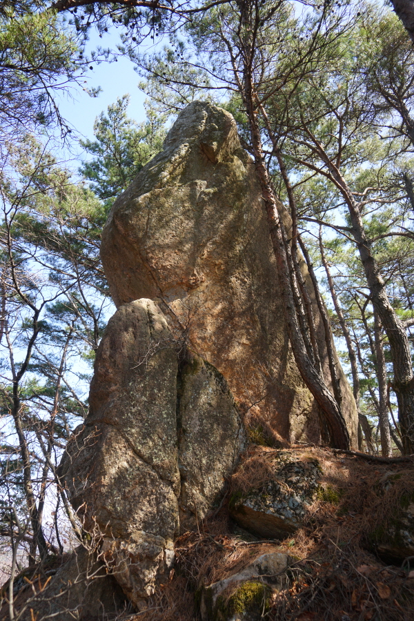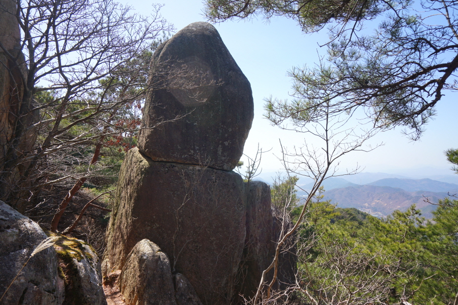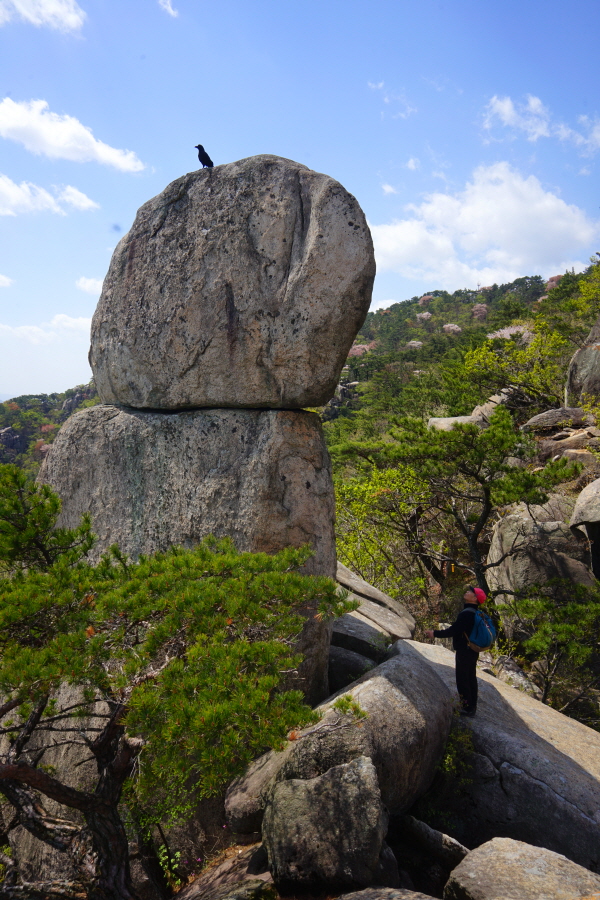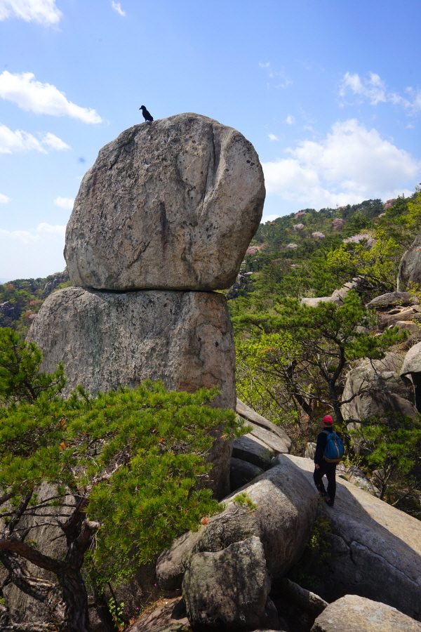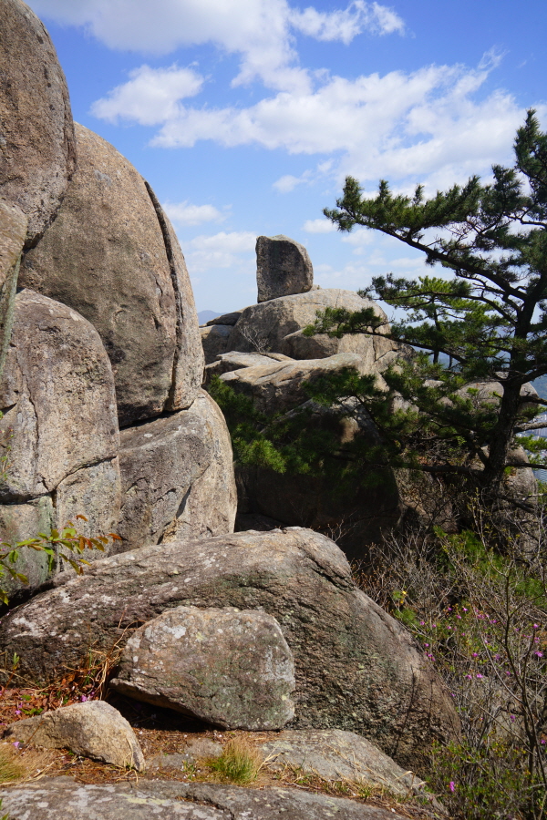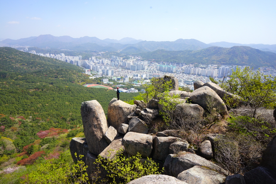 금정산의 다양한 바위 코스 중에서 일반 등산객도 쉽게 암릉에 접근해 바위를 탈 수 있는 게 금정구 장전동 광명사 입구에서 출발하는 아기자기 능선입니다. 광명사에서 20분 남짓 제 2망루 방향으로 흙길 능선을 오르면 바위길이 시작합니다. 고인돌 바위, 포개진 바위, 남근석을 닮은 선바위, 남해 금산의 쌍홍문을 닮은 구멍이 두개 뚫린 바위, 부처님이 참선 했을 법한 광배를 두른 좌선대 등 천태만상(千態萬象)의 다양한 바위가 나타납니다.
