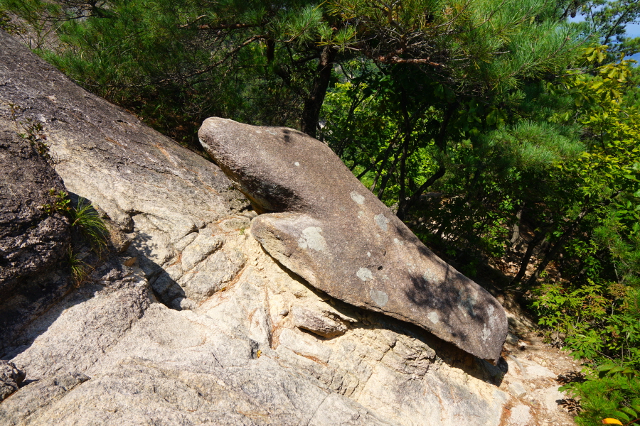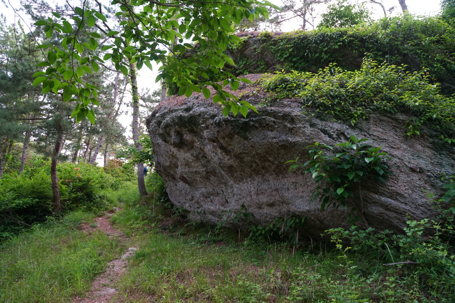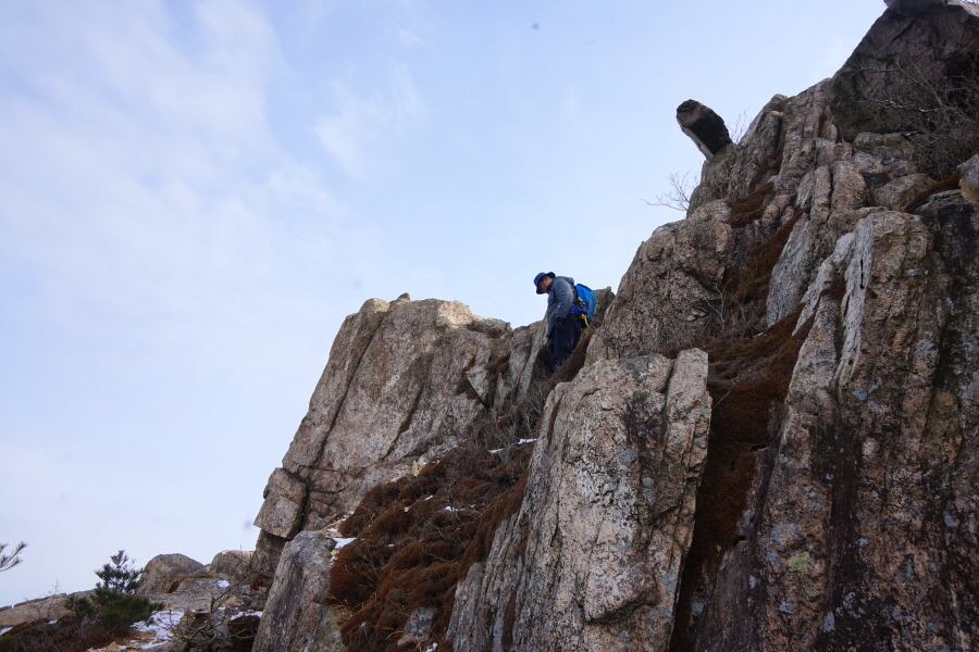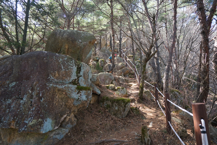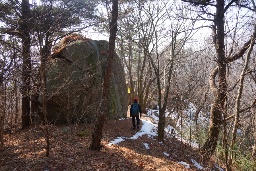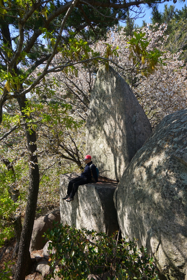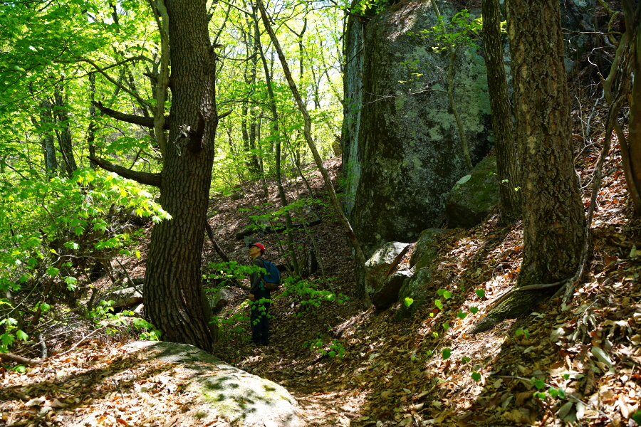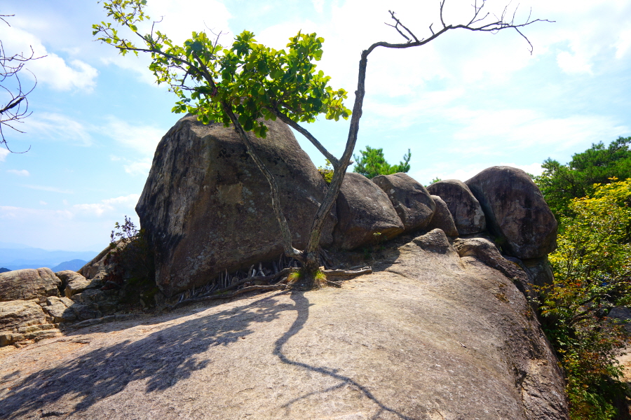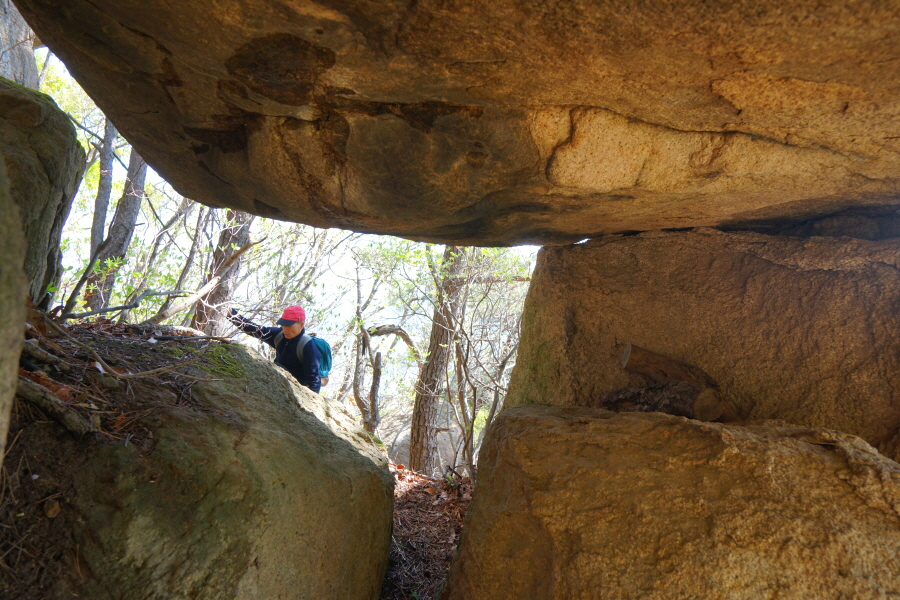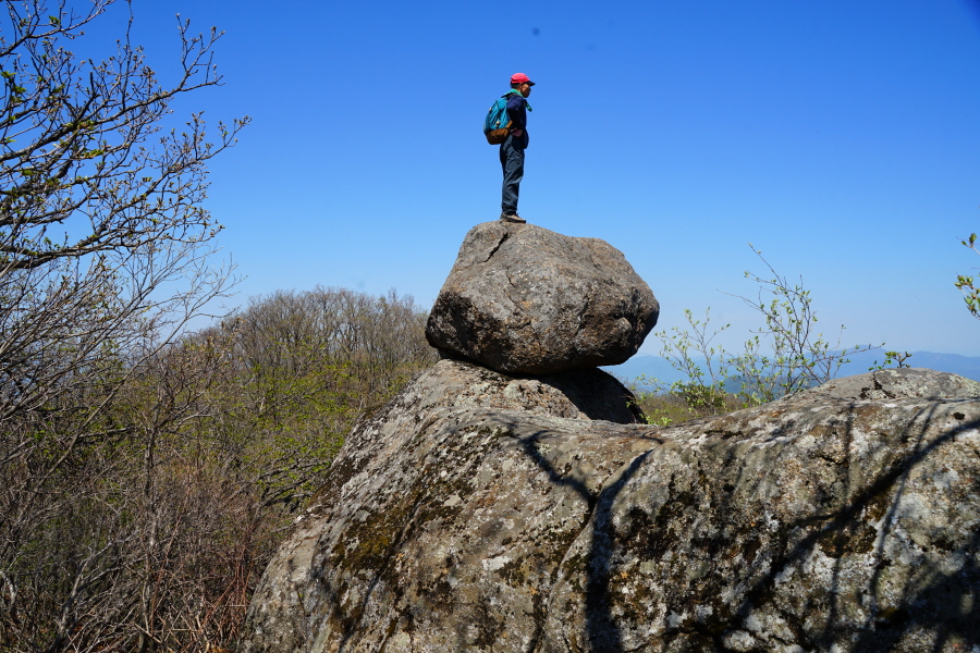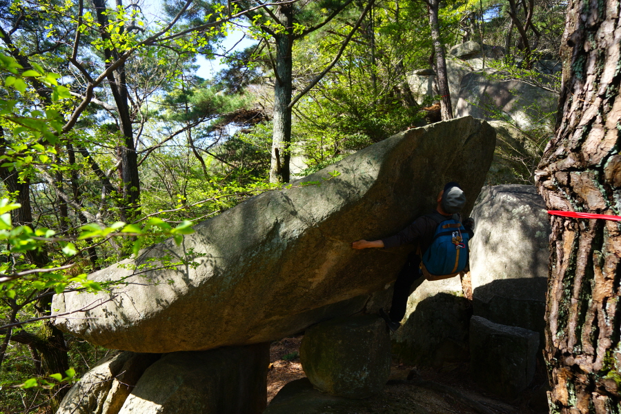 금정산의 다양한 바위 코스 중에서 일반 등산객도 쉽게 암릉에 접근해 바위를 탈 수 있는 게 금정구 장전동 광명사 입구에서 출발하는 아기자기 능선입니다. 광명사에서 20분 남짓 제 2망루 방향으로 흙길 능선을 오르면 바위길이 시작합니다. 고인돌 바위, 포개진 바위, 남근석을 닮은 선바위, 남해 금산의 쌍홍문을 닮은 구멍이 두개 뚫린 바위, 부처님이 참선 했을 법한 광배를 두른 좌선대 등 천태만상(千態萬象)의 다양한 바위가 나타납니다.