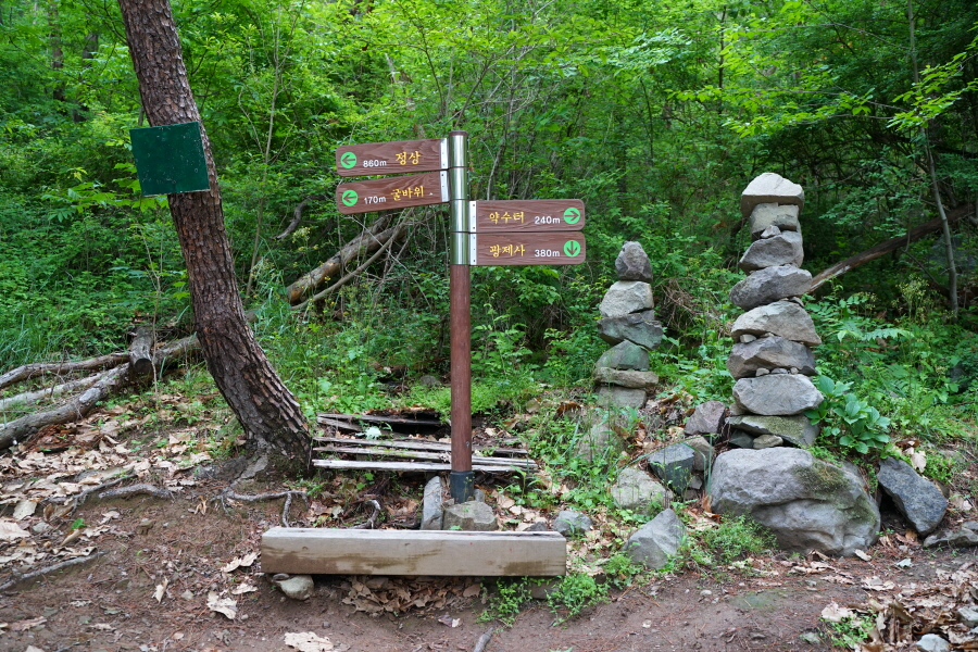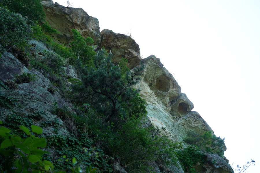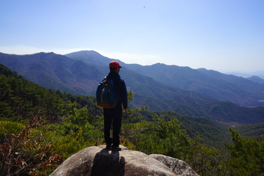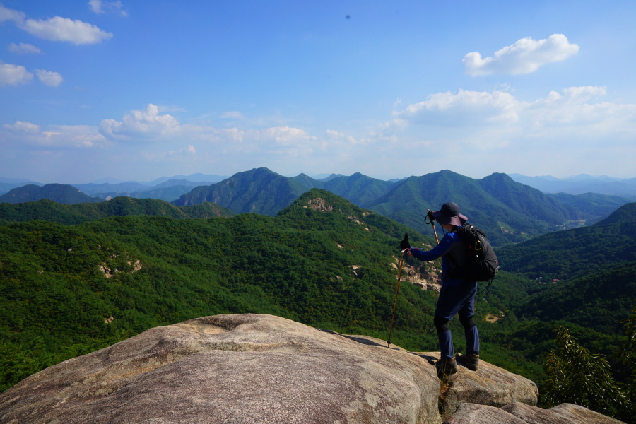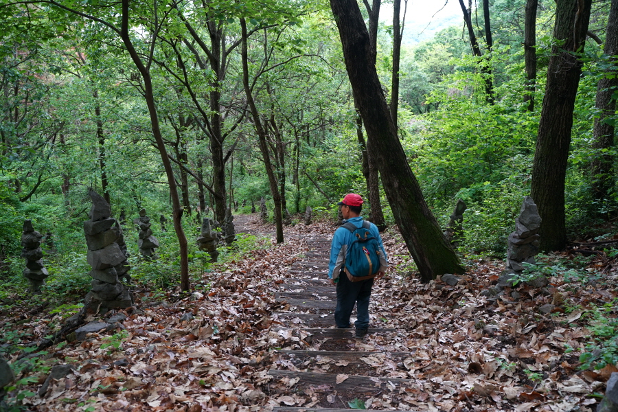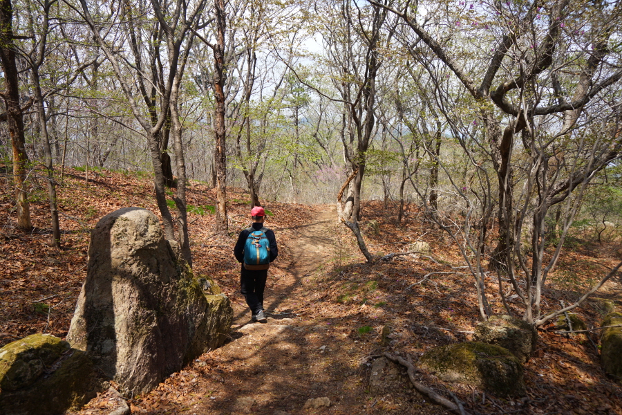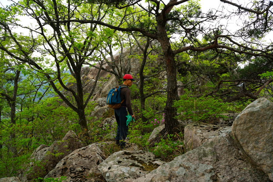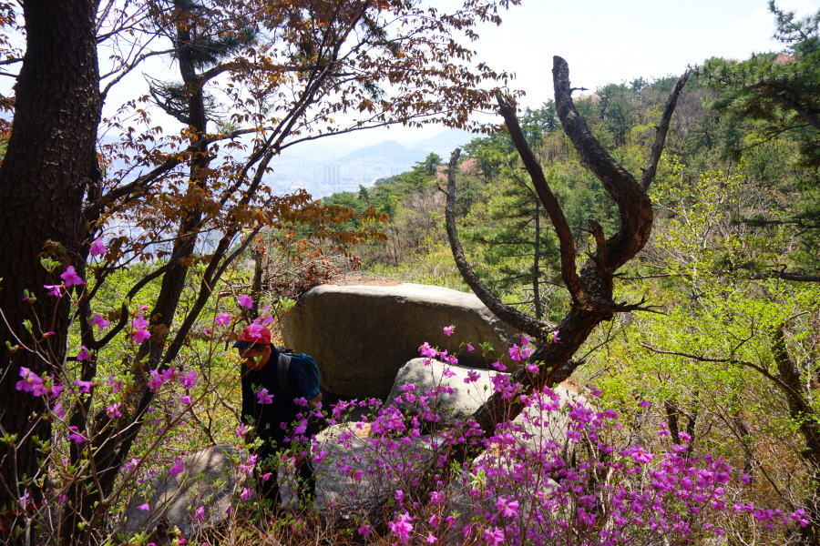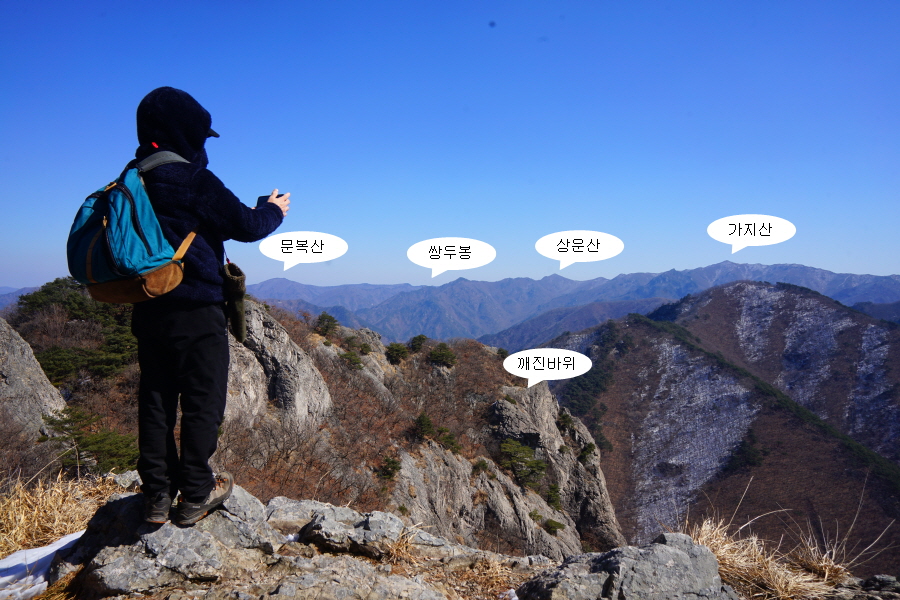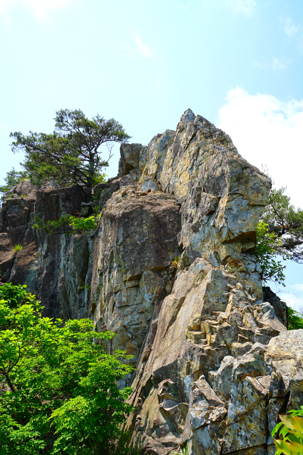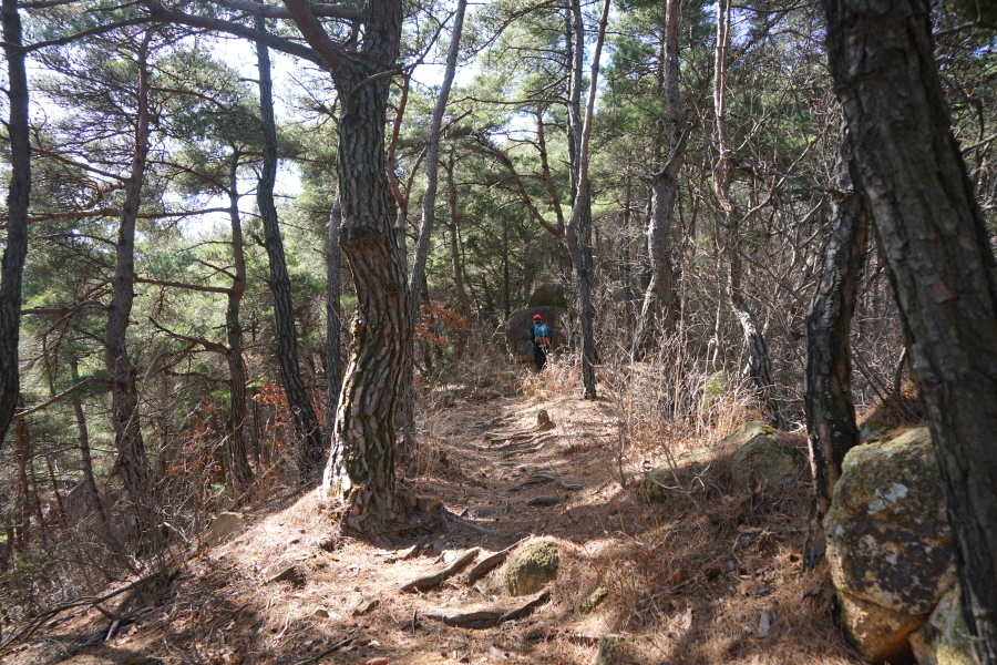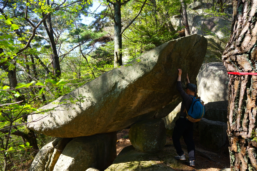 금정산의 다양한 바위 코스 중에서 일반 등산객도 쉽게 암릉에 접근해 바위를 탈 수 있는 게 금정구 장전동 광명사 입구에서 출발하는 아기자기 능선입니다. 광명사에서 20분 남짓 제 2망루 방향으로 흙길 능선을 오르면 바위길이 시작합니다. 고인돌 바위, 포개진 바위, 남근석을 닮은 선바위, 남해 금산의 쌍홍문을 닮은 구멍이 두개 뚫린 바위, 부처님이 참선 했을 법한 광배를 두른 좌선대 등 천태만상(千態萬象)의 다양한 바위가 나타납니다.