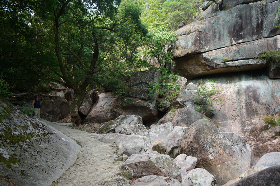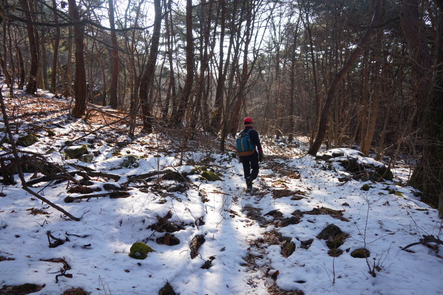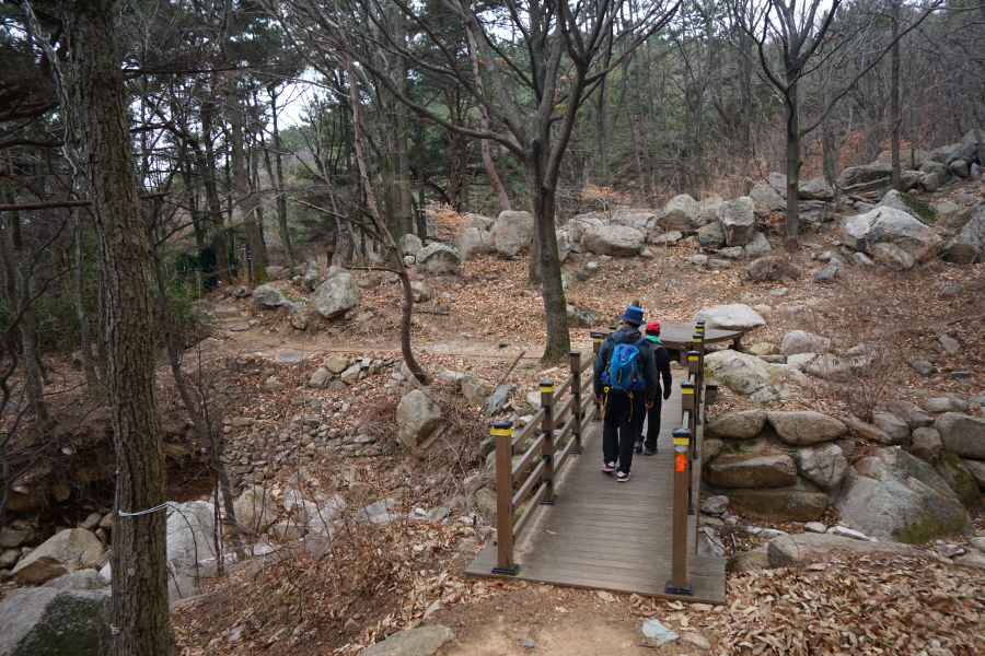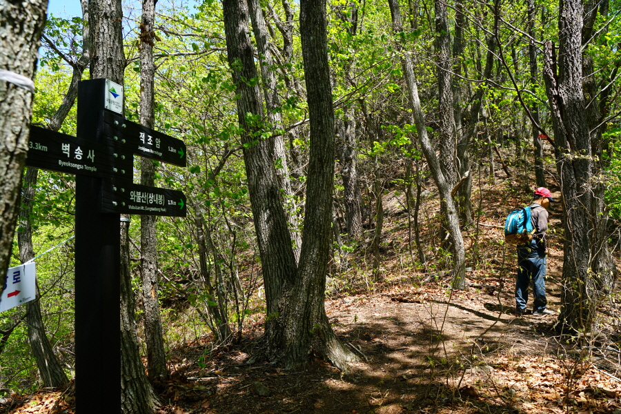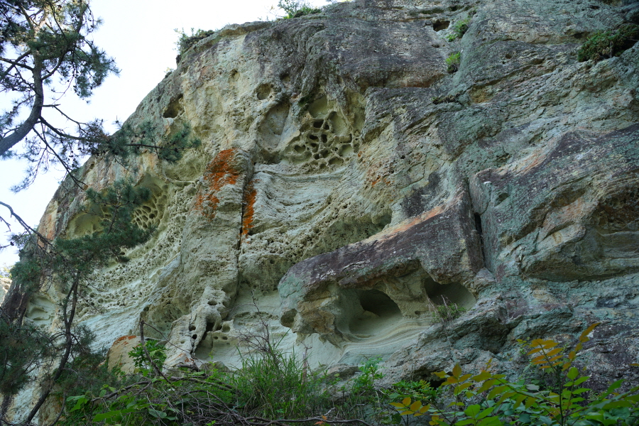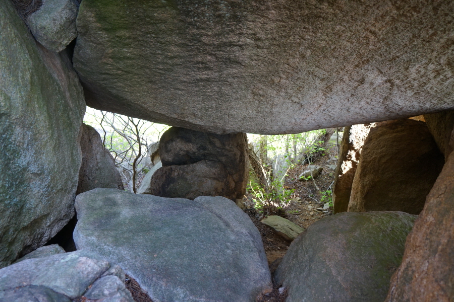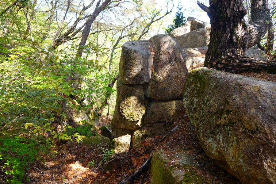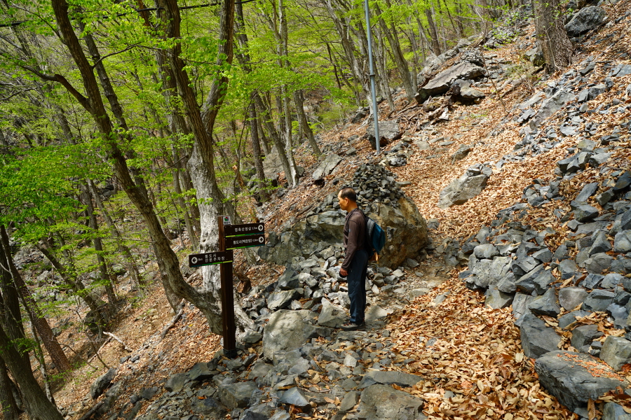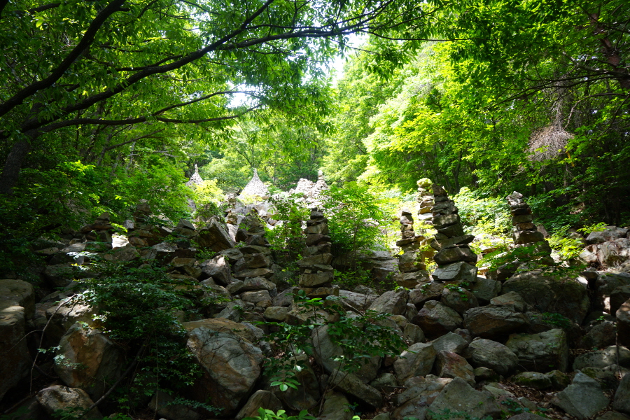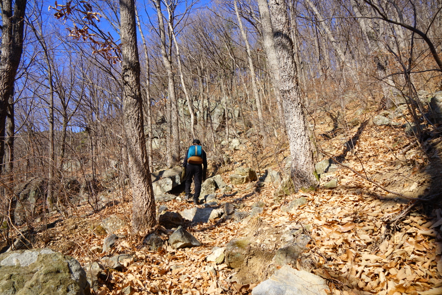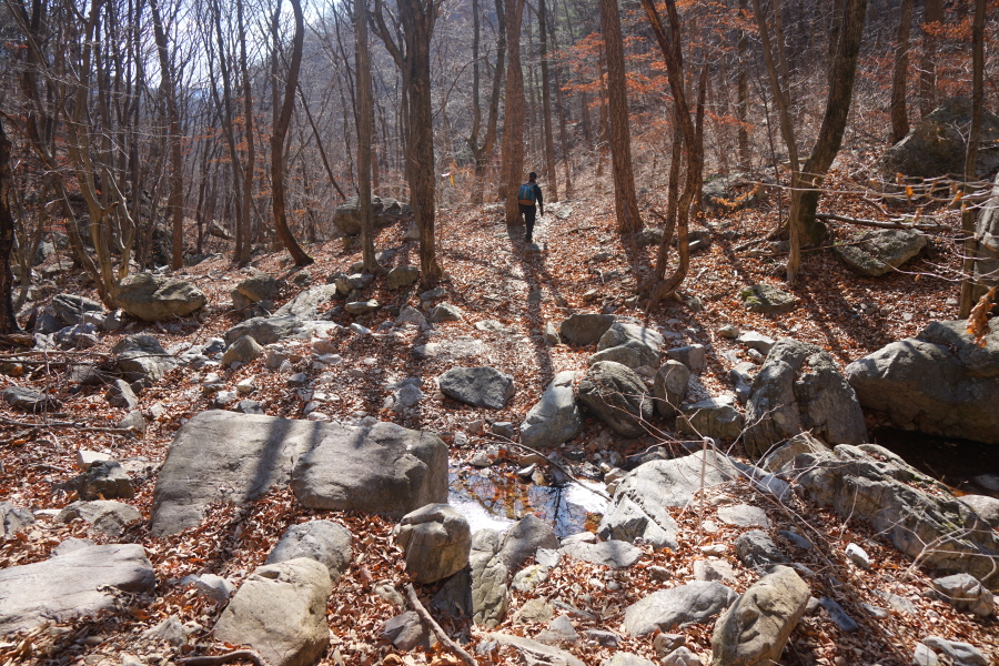 금정산의 다양한 바위 코스 중에서 일반 등산객도 쉽게 암릉에 접근해 바위를 탈 수 있는 게 금정구 장전동 광명사 입구에서 출발하는 아기자기 능선입니다. 광명사에서 20분 남짓 제 2망루 방향으로 흙길 능선을 오르면 바위길이 시작합니다. 고인돌 바위, 포개진 바위, 남근석을 닮은 선바위, 남해 금산의 쌍홍문을 닮은 구멍이 두개 뚫린 바위, 부처님이 참선 했을 법한 광배를 두른 좌선대 등 천태만상(千態萬象)의 다양한 바위가 나타납니다.