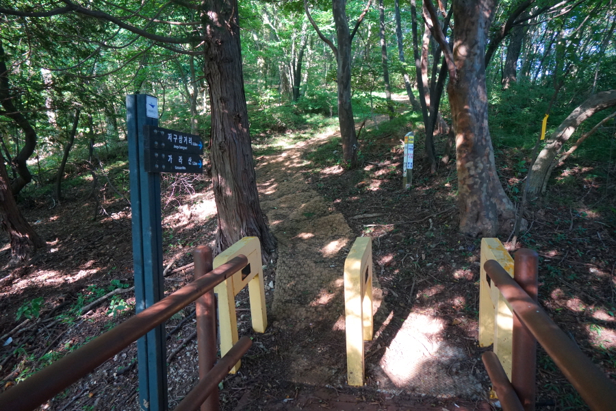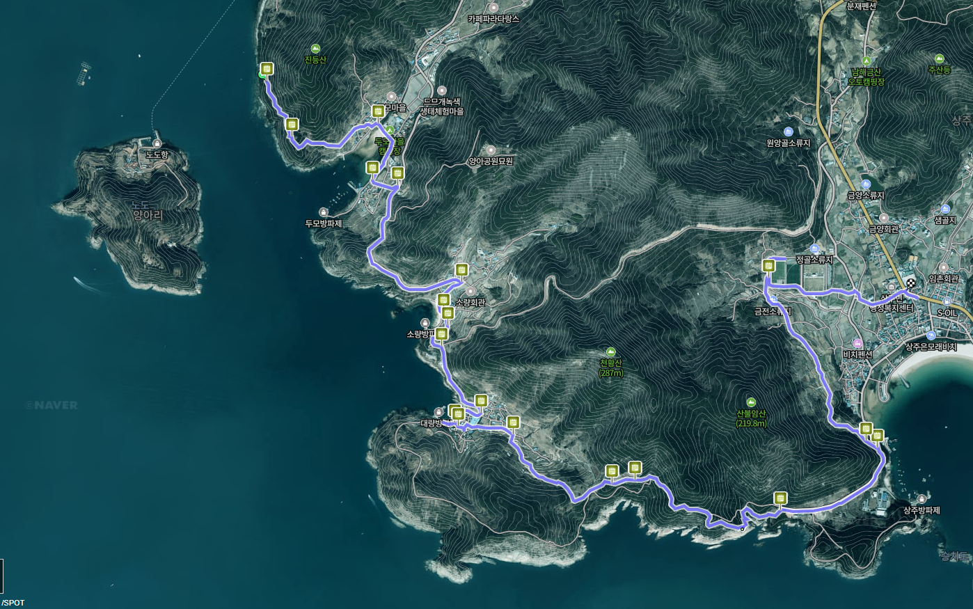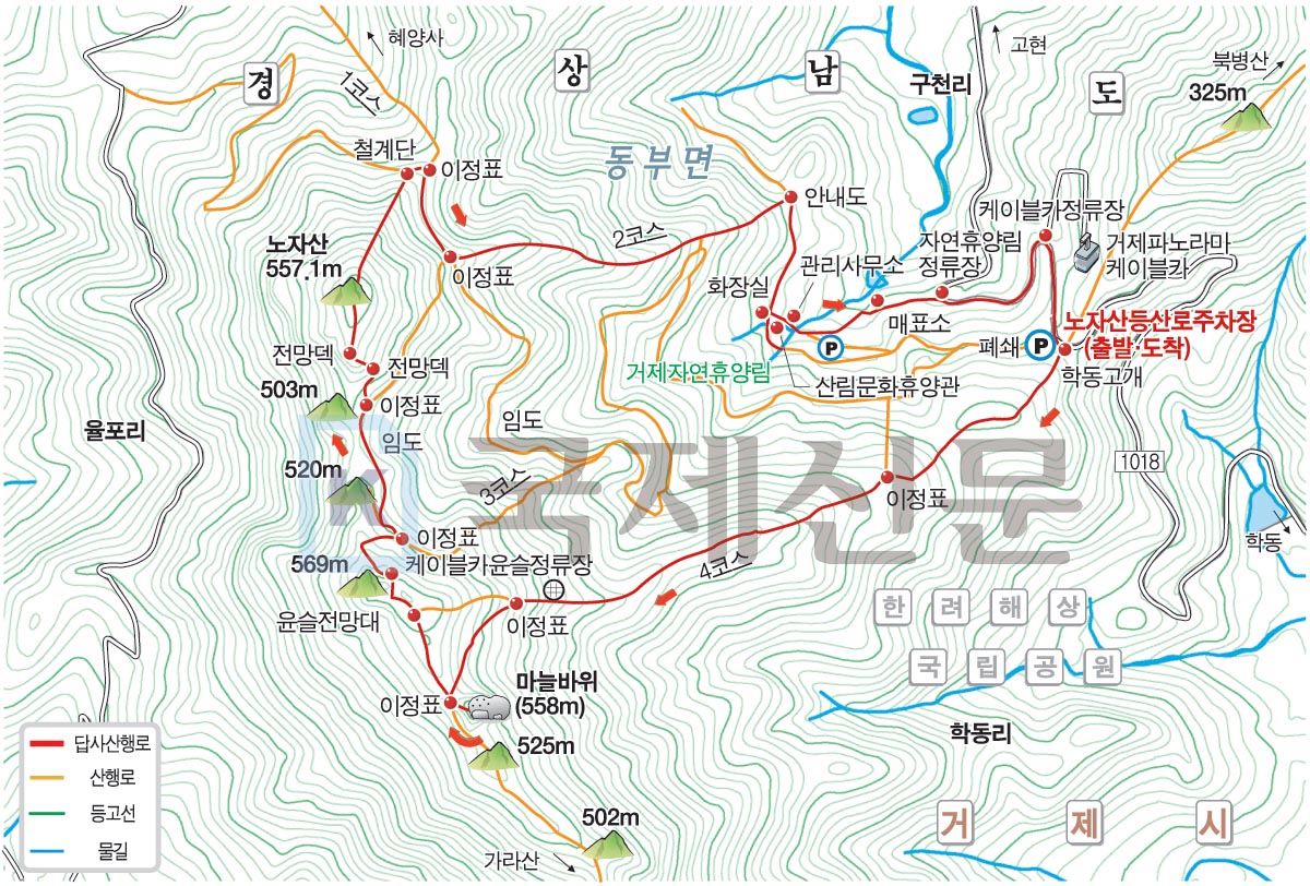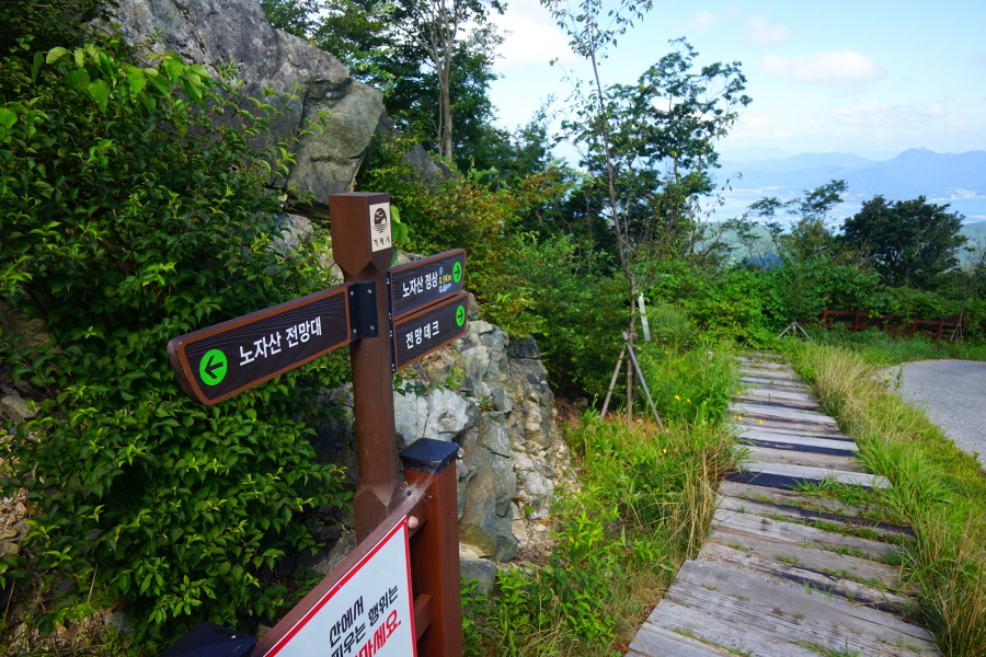 산행경로는 다음과 같습니다. 노자산등산로주차장~학동고개~노자산·거제휴양림 갈림길~약수터~벼늘 바위 삼거리~가라산·노자산 주능선 삼거리~마늘바위~가라산·노자산 주능선 삼거리~윤슬전망대~케이블카상부 윤슬정류장~임도~노자산 정상·임도 갈림길~두 곳의 덱 전망대~노자산 정상~산불초소~임도~노자산 정상·자연휴양림(임도)·혜양사 갈림길~임도 삼거리~자연휴양림 (노자산 2코스 입구)~산림문화휴양관~거제자연휴양림매표소~휴양림 입구 도로~케이블카 입구 회전교차로를 거쳐 노자산등산로주차장으로 돌아오는 원점회귀 코스입니다. 산행 거리는 약 6㎞이며 3시간30분 안팎 걸립니다.