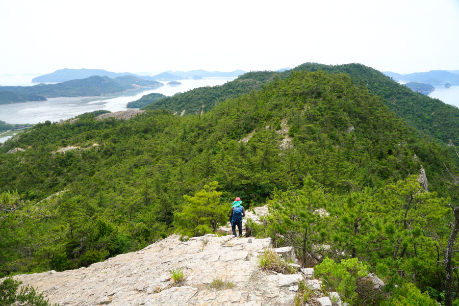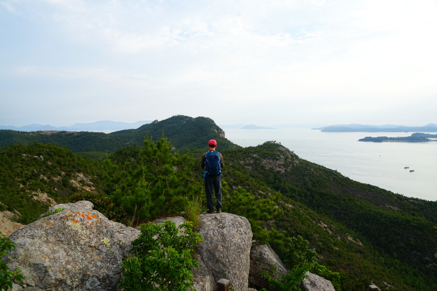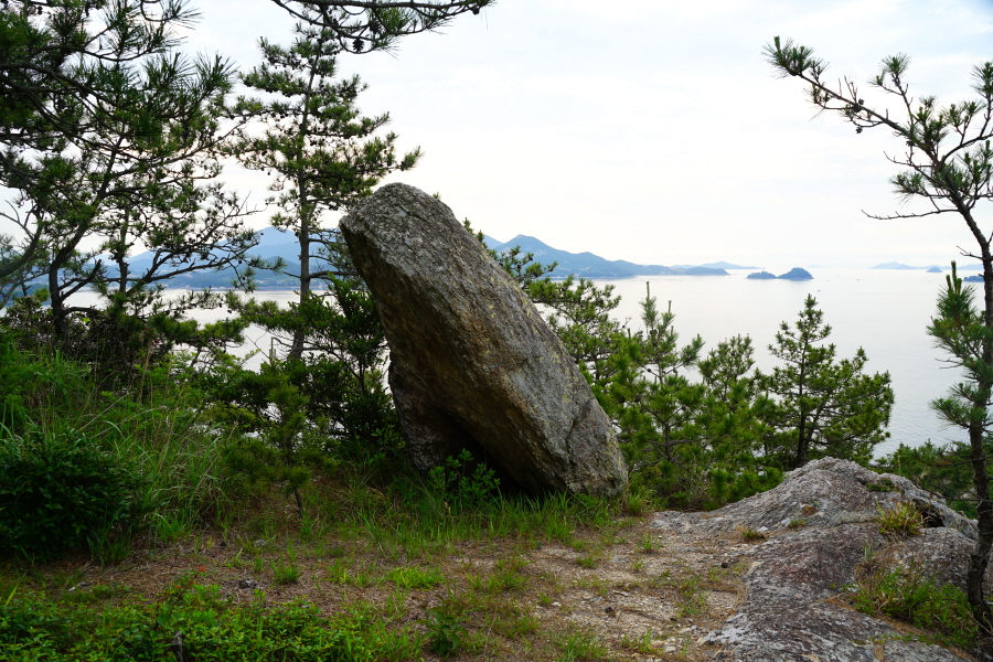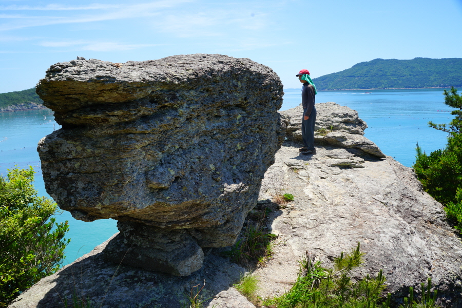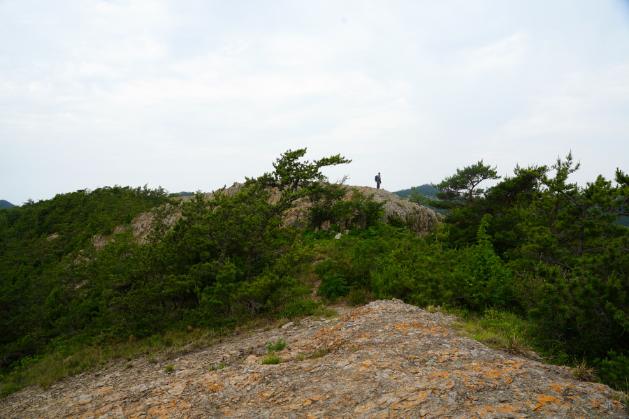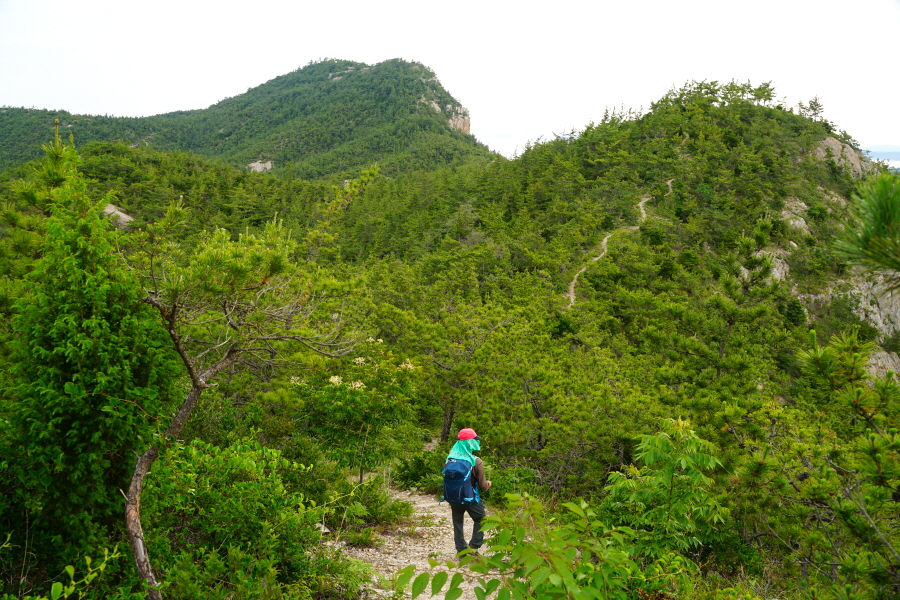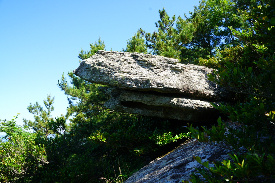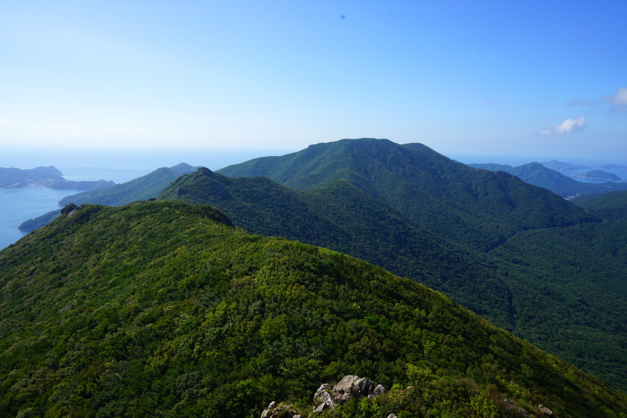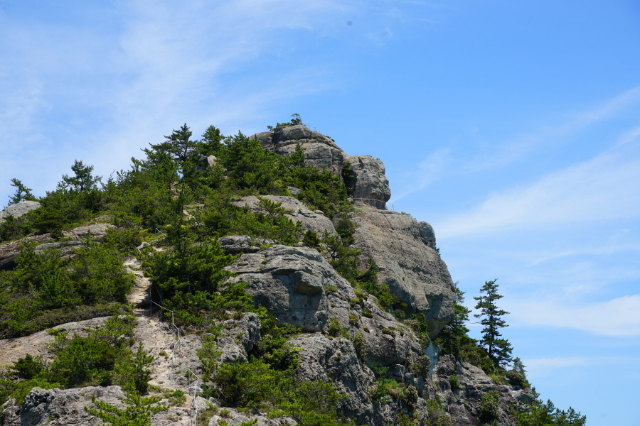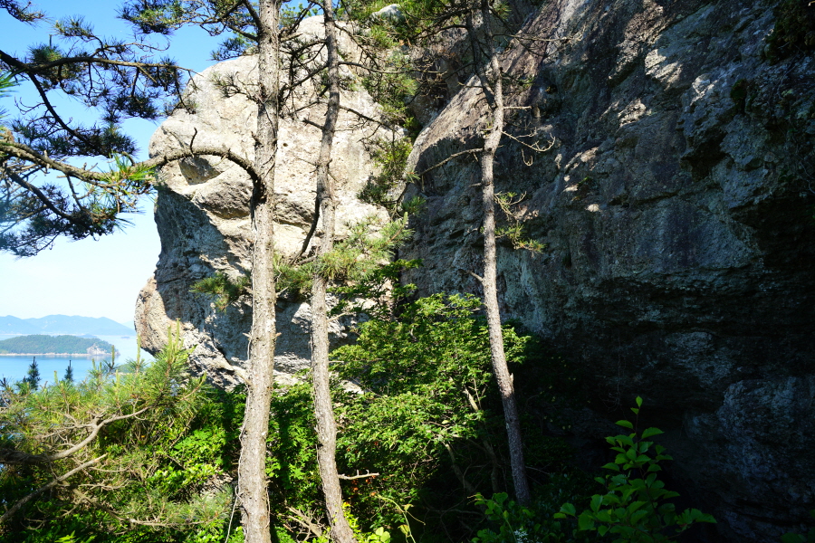 산행은 학동고개에서 남파랑길과 거제지맥길을 따라 능선을 올라갑니다. 50분 정도면 주 능선의 마늘 바위 삼거리에 닿습니다. 왼쪽에 토종 마늘을 닮은 앙팡진 마늘 바위를 거쳐 윤슬 전망대와 케이블카 상부승강장, 노자산 정상을 차례로 오르는데 모두 전망이 넓게 열리는 조망 맛집 산행입니다. 노자산 정상에서 보면 서쪽 쪽빛 바다 멀리 연화도 욕지도 두미도가 보이고 그 앞으로 비진도 용초도 추봉도 한산도 등이 파노라마로 펼쳐집니다.