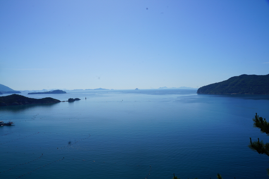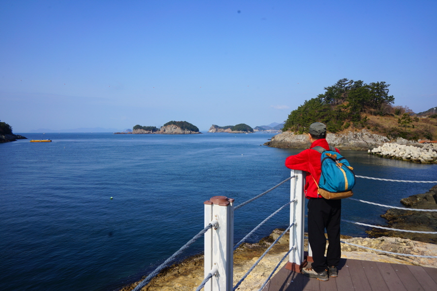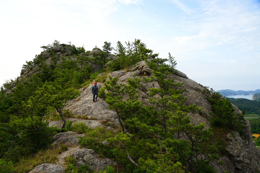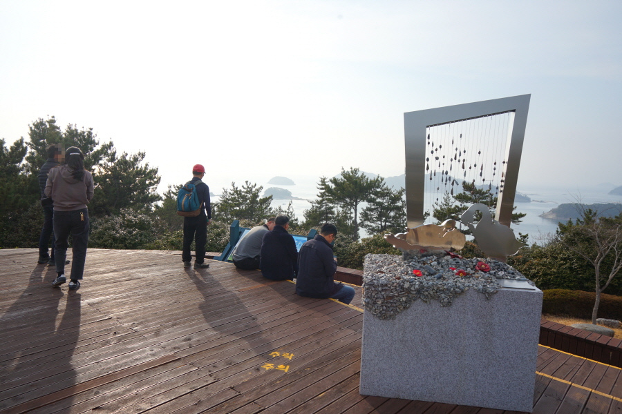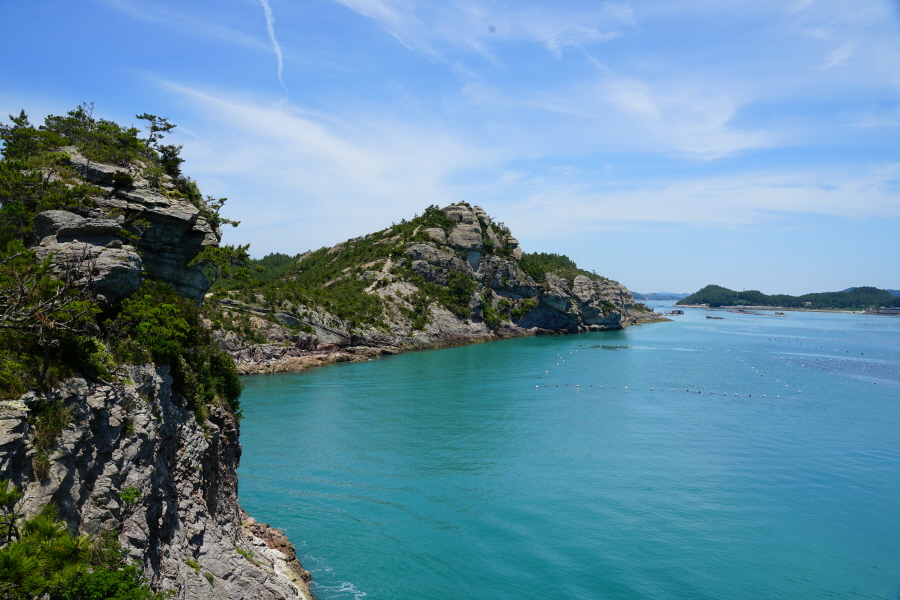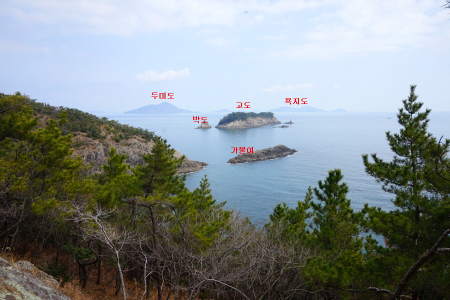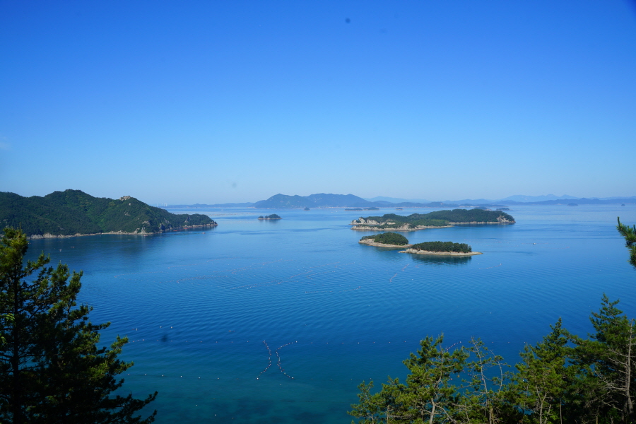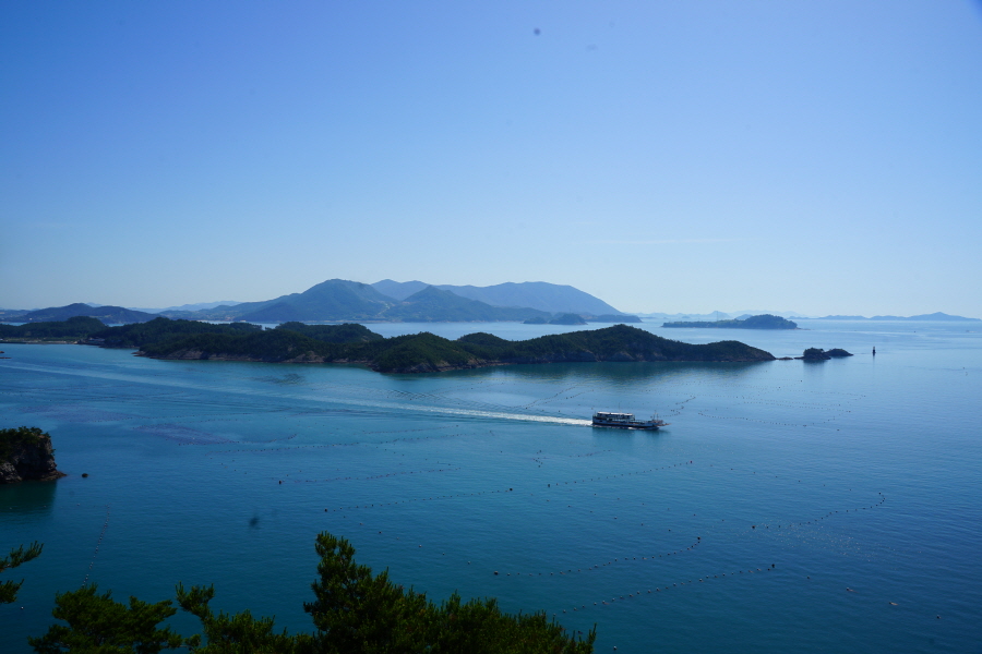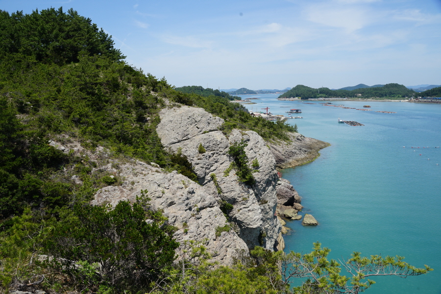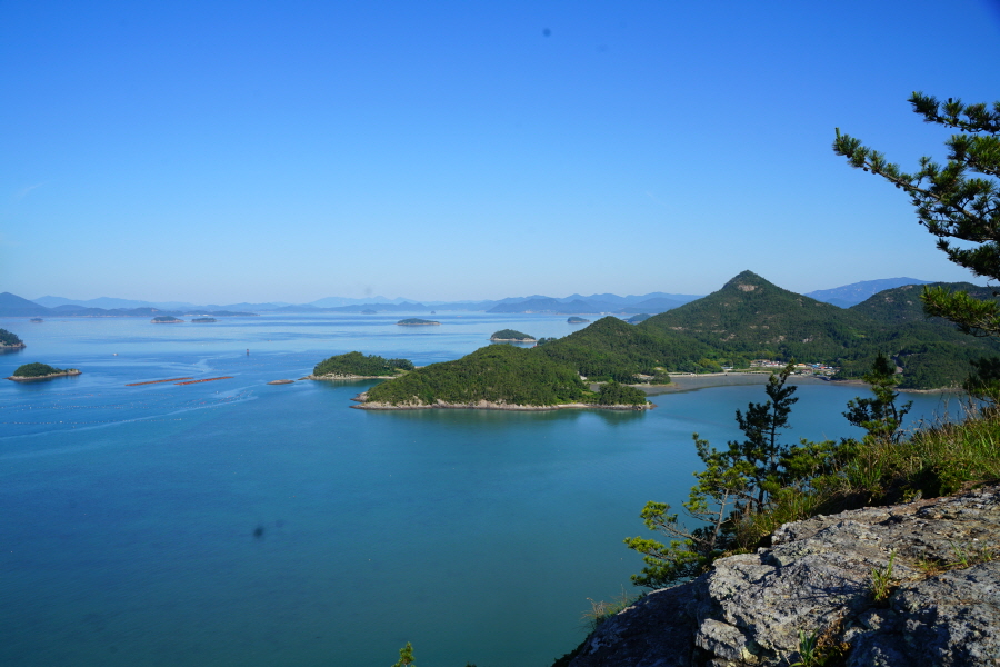 산행은 학동고개에서 남파랑길과 거제지맥길을 따라 능선을 올라갑니다. 50분 정도면 주 능선의 마늘 바위 삼거리에 닿습니다. 왼쪽에 토종 마늘을 닮은 앙팡진 마늘 바위를 거쳐 윤슬 전망대와 케이블카 상부승강장, 노자산 정상을 차례로 오르는데 모두 전망이 넓게 열리는 조망 맛집 산행입니다. 노자산 정상에서 보면 서쪽 쪽빛 바다 멀리 연화도 욕지도 두미도가 보이고 그 앞으로 비진도 용초도 추봉도 한산도 등이 파노라마로 펼쳐집니다.