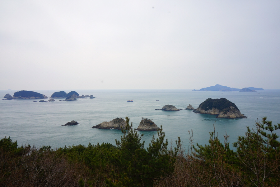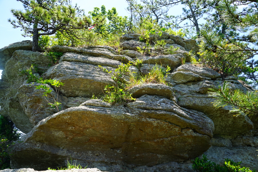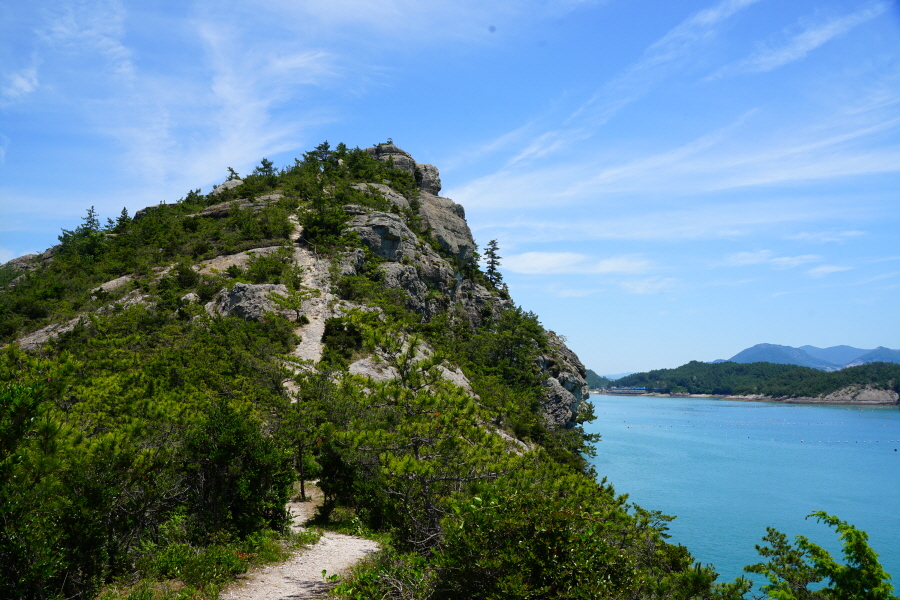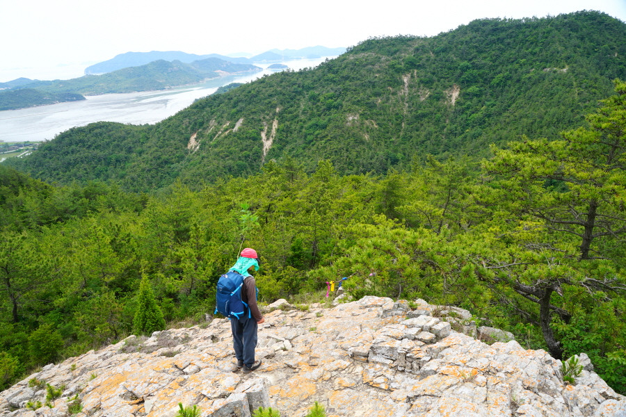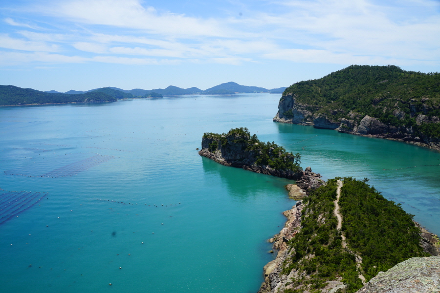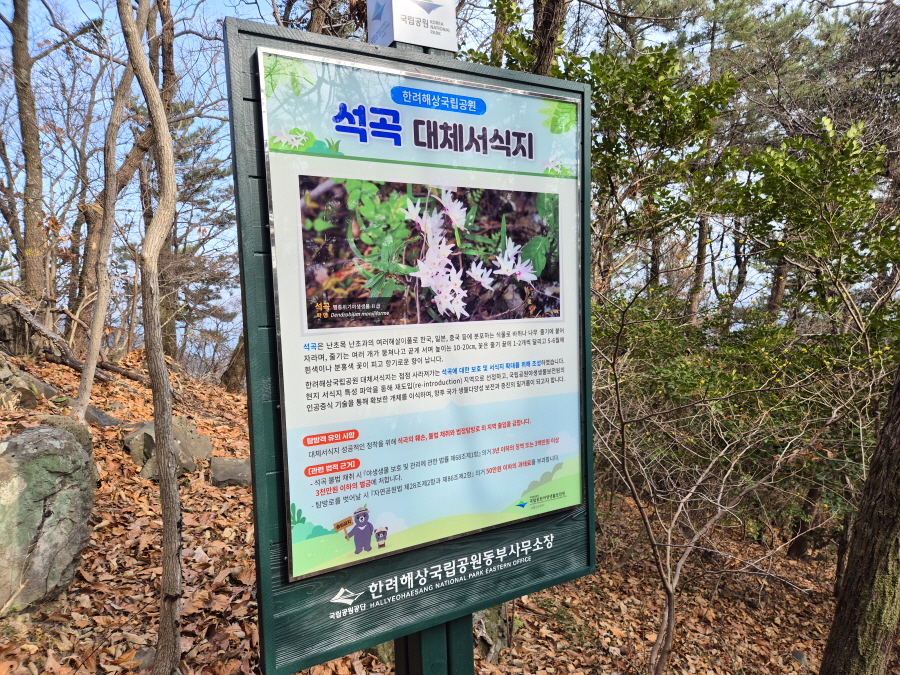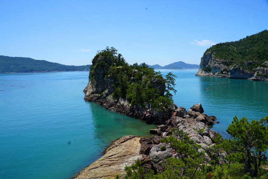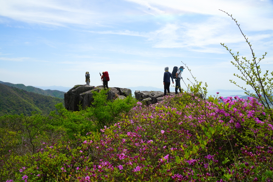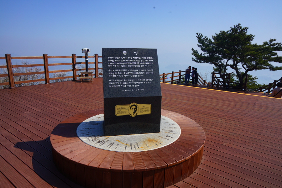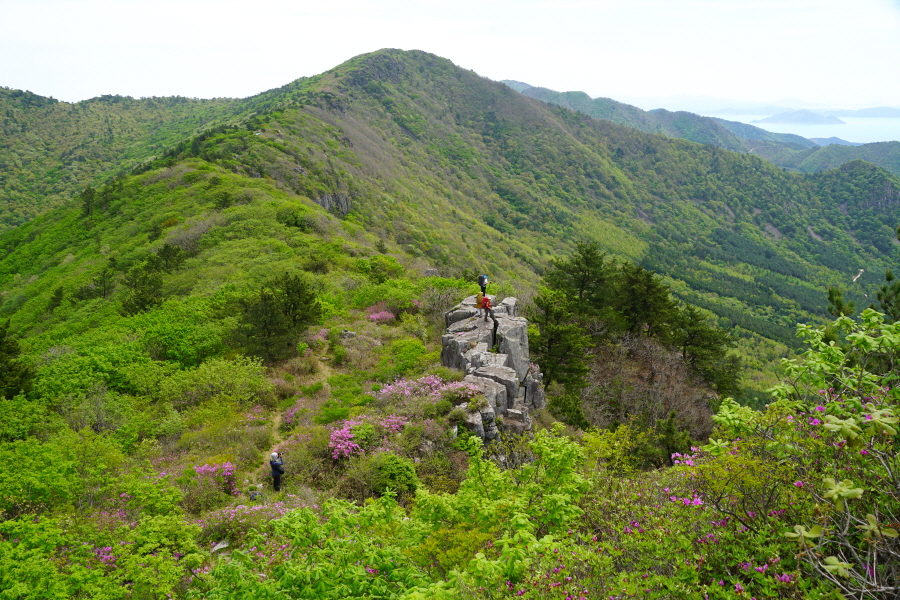 산행은 학동고개에서 남파랑길과 거제지맥길을 따라 능선을 올라갑니다. 50분 정도면 주 능선의 마늘 바위 삼거리에 닿습니다. 왼쪽에 토종 마늘을 닮은 앙팡진 마늘 바위를 거쳐 윤슬 전망대와 케이블카 상부승강장, 노자산 정상을 차례로 오르는데 모두 전망이 넓게 열리는 조망 맛집 산행입니다. 노자산 정상에서 보면 서쪽 쪽빛 바다 멀리 연화도 욕지도 두미도가 보이고 그 앞으로 비진도 용초도 추봉도 한산도 등이 파노라마로 펼쳐집니다.