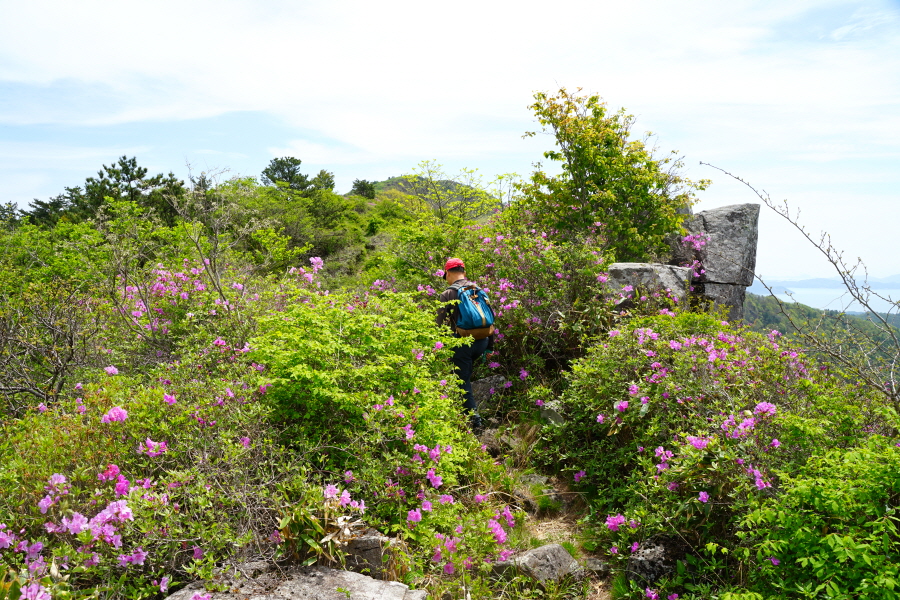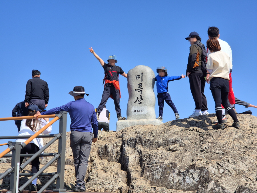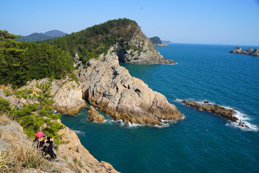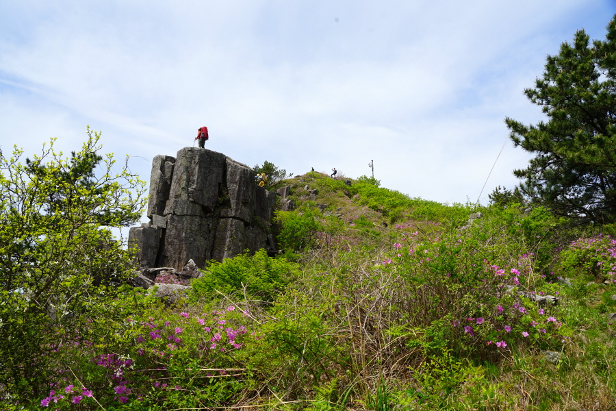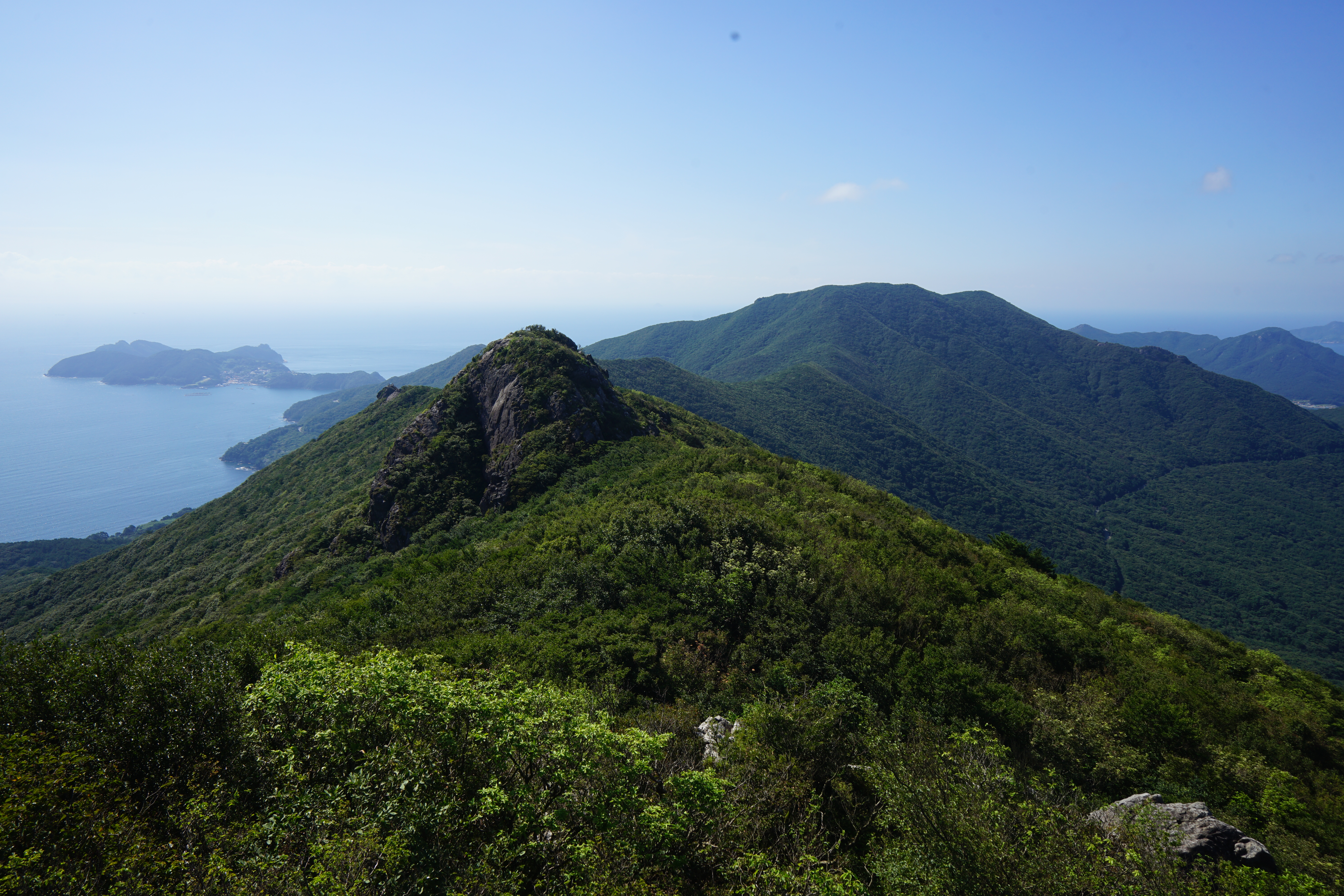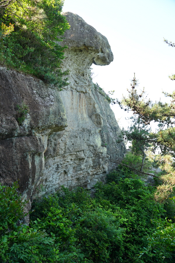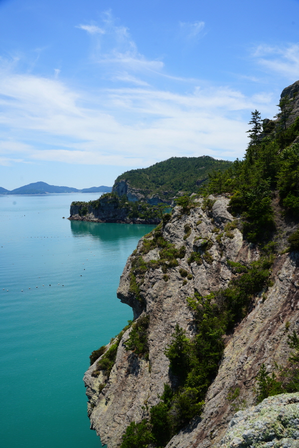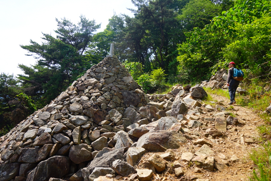 산행은 학동고개에서 남파랑길과 거제지맥길을 따라 능선을 올라갑니다. 50분 정도면 주 능선의 마늘 바위 삼거리에 닿습니다. 왼쪽에 토종 마늘을 닮은 앙팡진 마늘 바위를 거쳐 윤슬 전망대와 케이블카 상부승강장, 노자산 정상을 차례로 오르는데 모두 전망이 넓게 열리는 조망 맛집 산행입니다. 노자산 정상에서 보면 서쪽 쪽빛 바다 멀리 연화도 욕지도 두미도가 보이고 그 앞으로 비진도 용초도 추봉도 한산도 등이 파노라마로 펼쳐집니다.