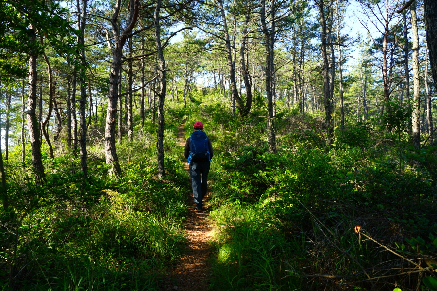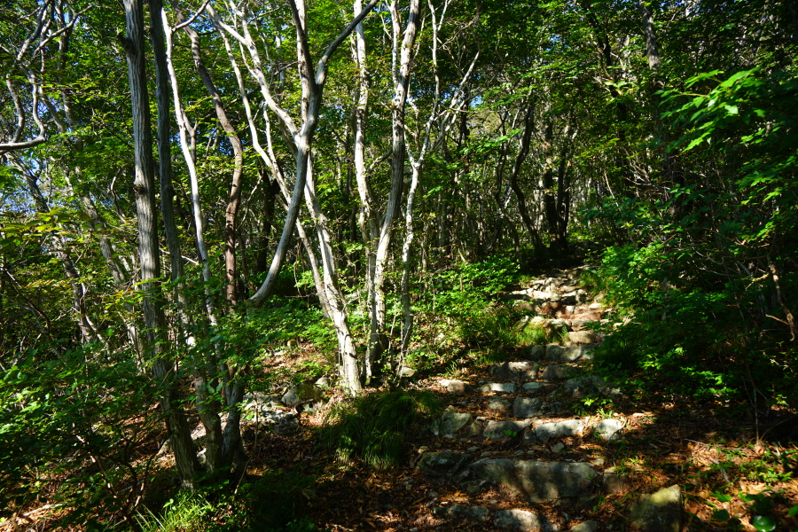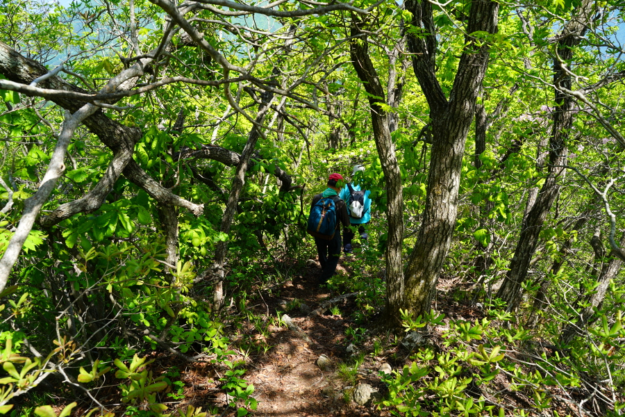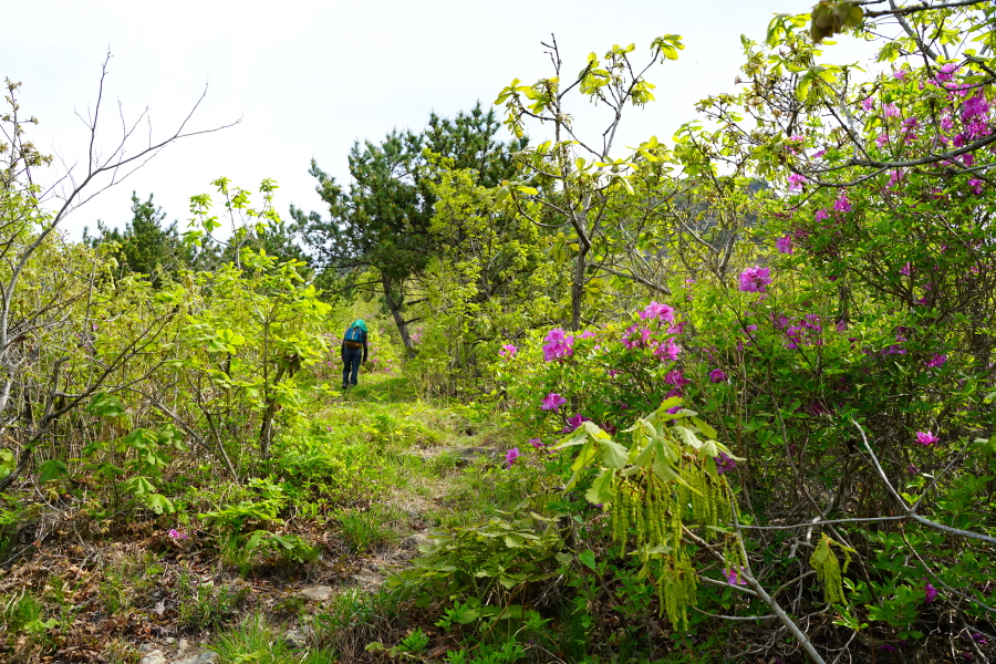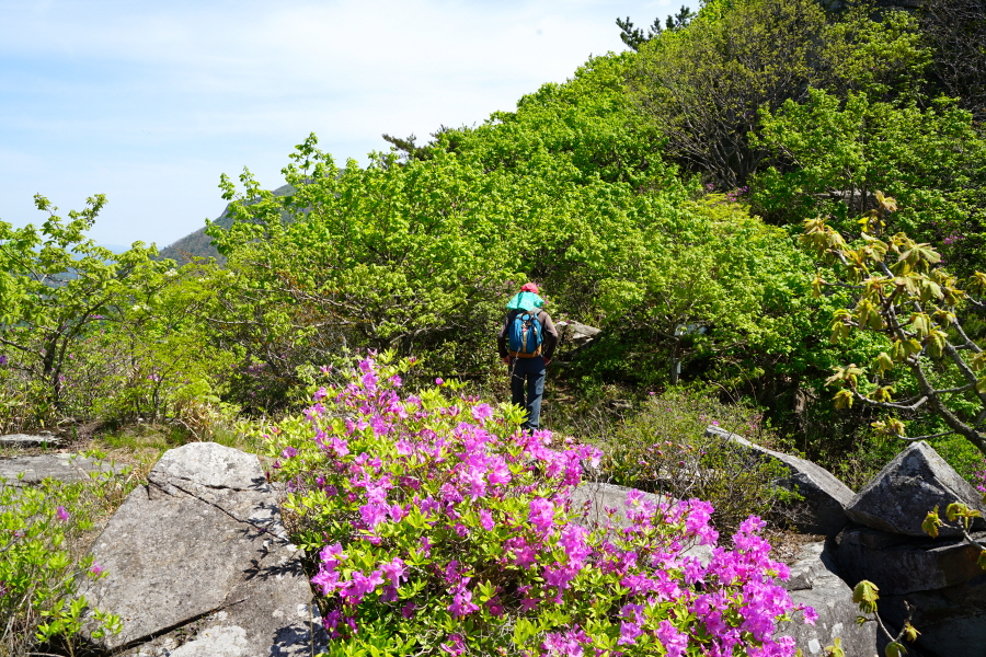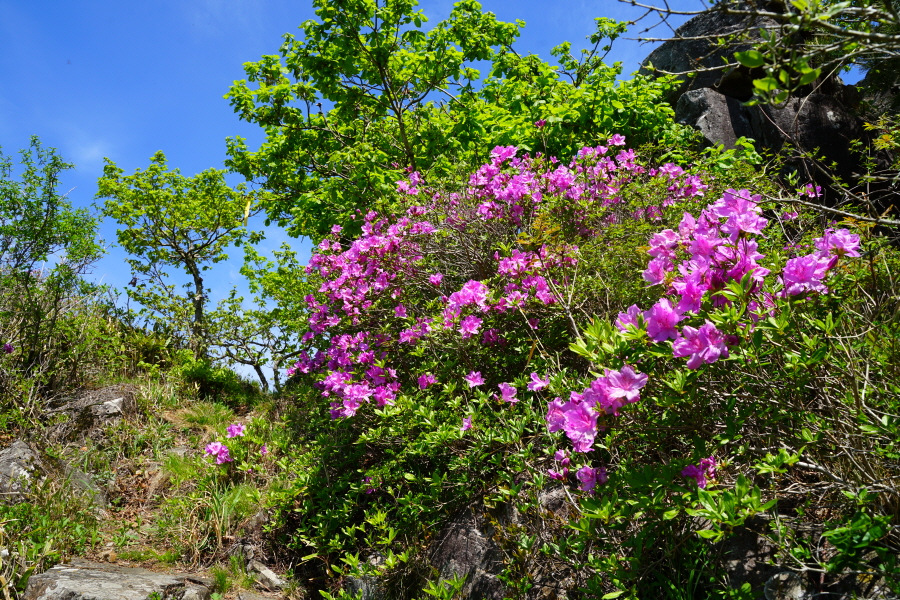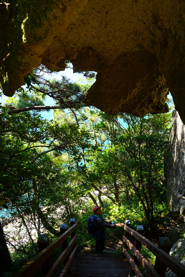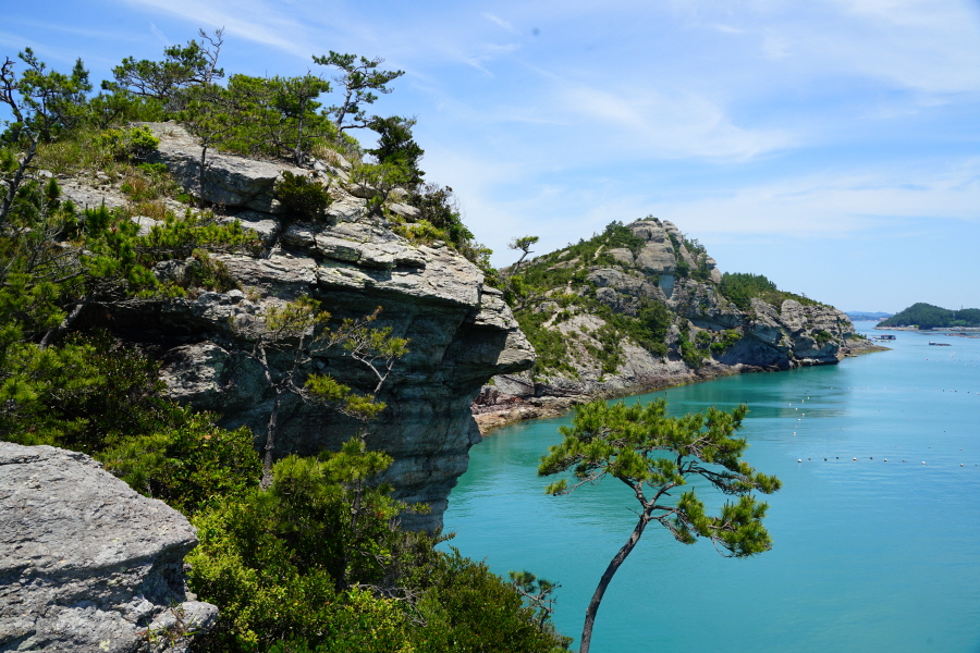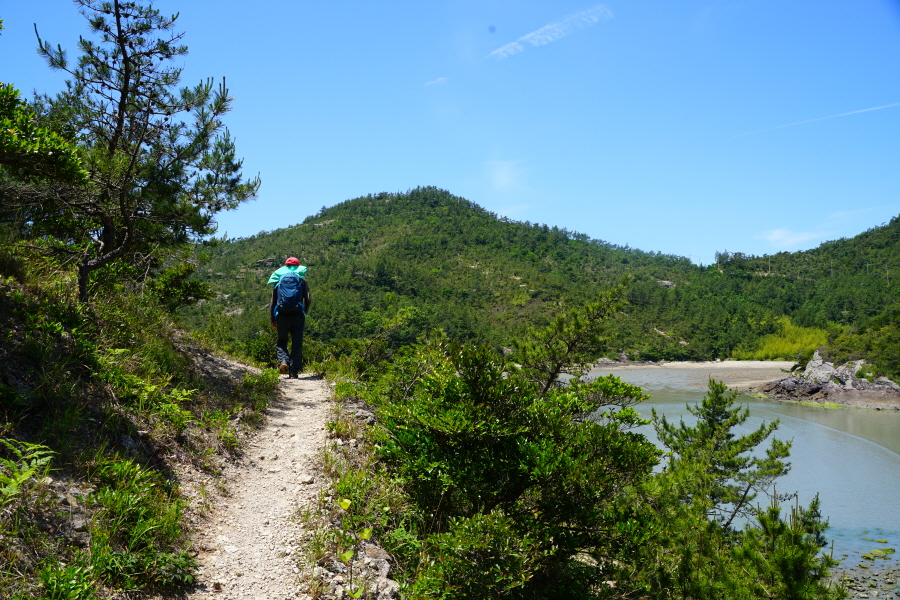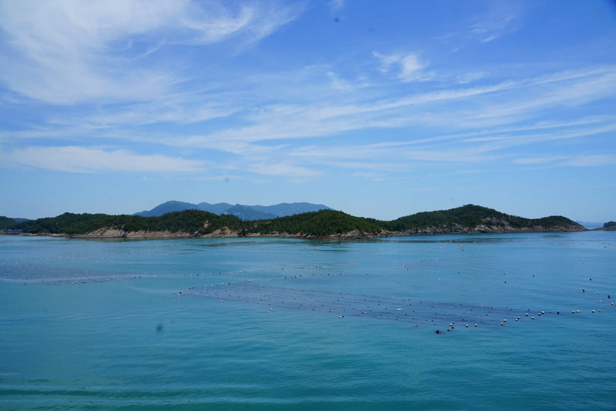 산행은 학동고개에서 남파랑길과 거제지맥길을 따라 능선을 올라갑니다. 50분 정도면 주 능선의 마늘 바위 삼거리에 닿습니다. 왼쪽에 토종 마늘을 닮은 앙팡진 마늘 바위를 거쳐 윤슬 전망대와 케이블카 상부승강장, 노자산 정상을 차례로 오르는데 모두 전망이 넓게 열리는 조망 맛집 산행입니다. 노자산 정상에서 보면 서쪽 쪽빛 바다 멀리 연화도 욕지도 두미도가 보이고 그 앞으로 비진도 용초도 추봉도 한산도 등이 파노라마로 펼쳐집니다.
