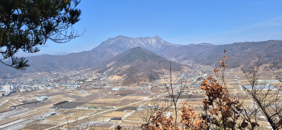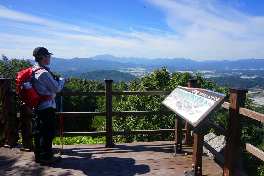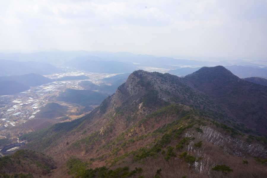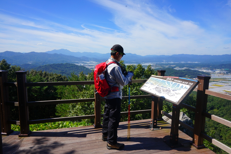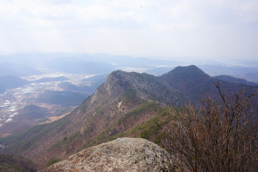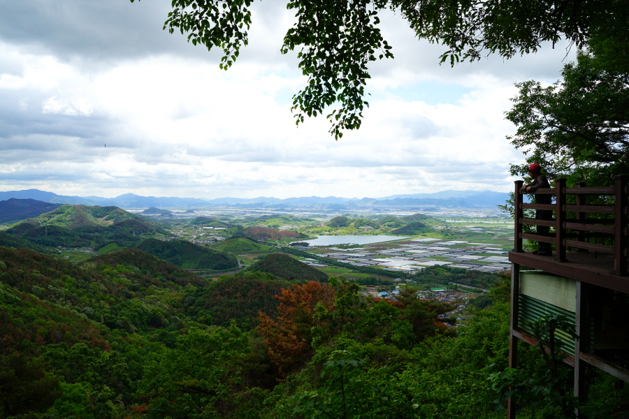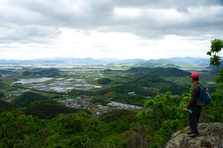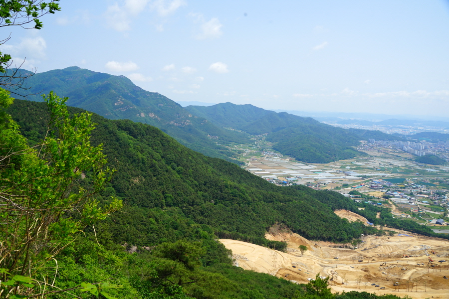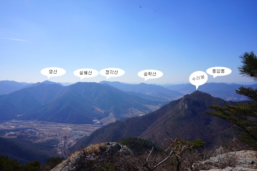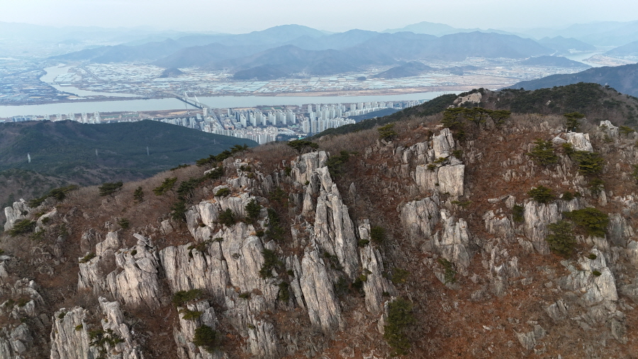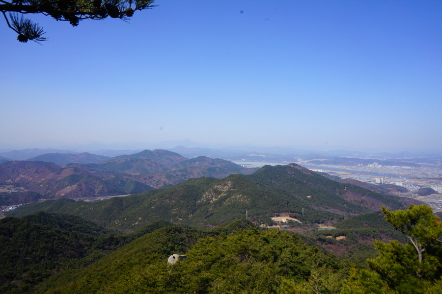 굴바위 전망 덱에서 보면 낙동강 건너 오른쪽 정병산에서 왼쪽 시계 반대 방향으로 조망이 열립니다. 대암산 용지봉 불모산 굴암산 금병산 봉화산 신어산 무척산 작약산(김해) 등 김해와 창원의 산이, 발아래는 초동저수지와 밀양과 창원을 잇는 수산대교, 창원시 의창구 대산면 들판의 비닐하우스, 김해시 진영읍의 아파트 단지 등 조망이 시원하게 펼쳐집니다.