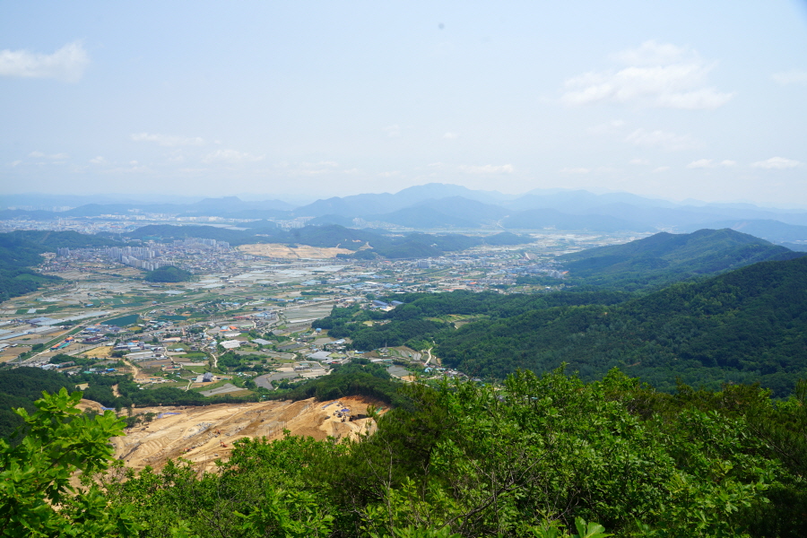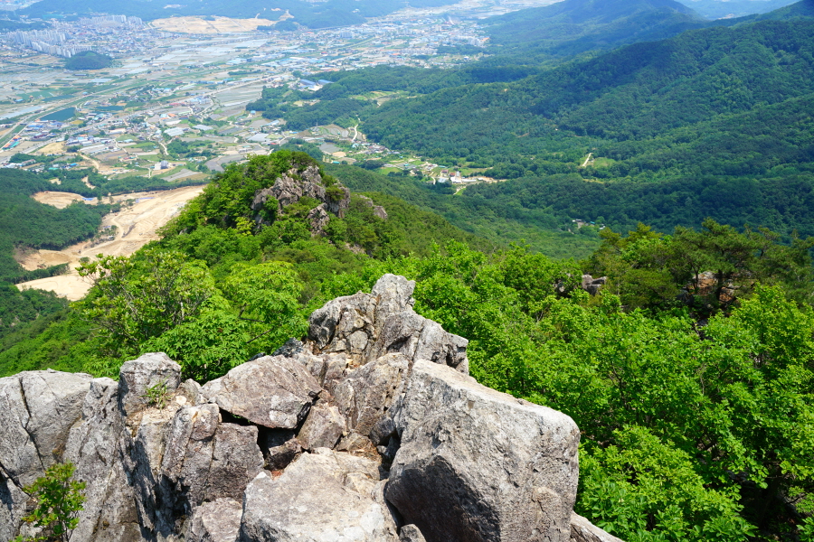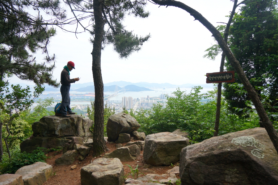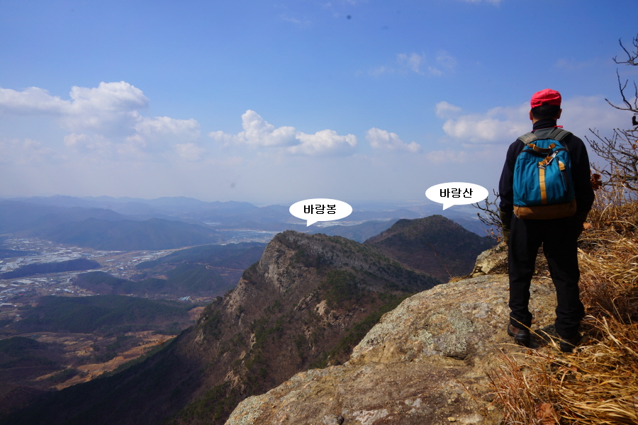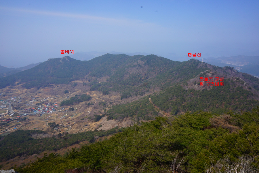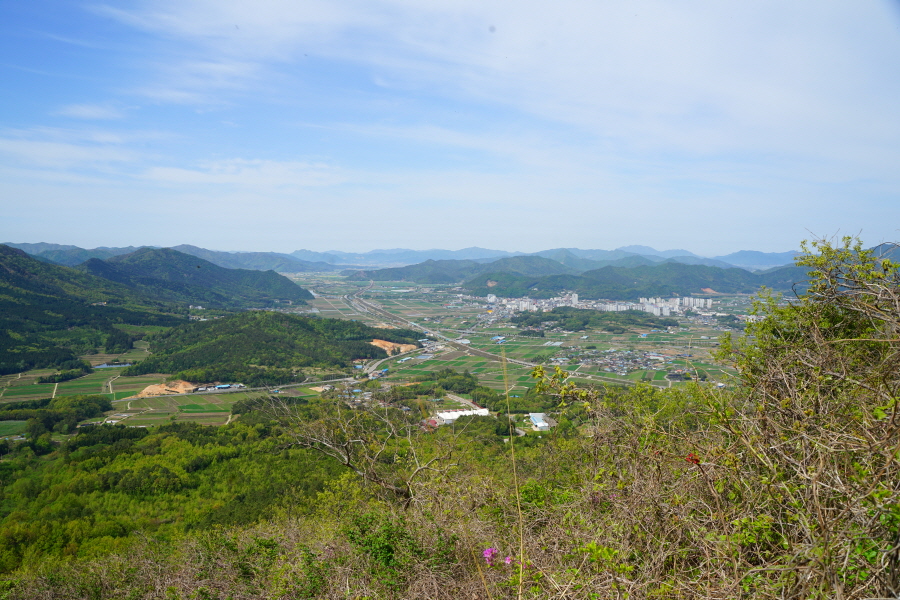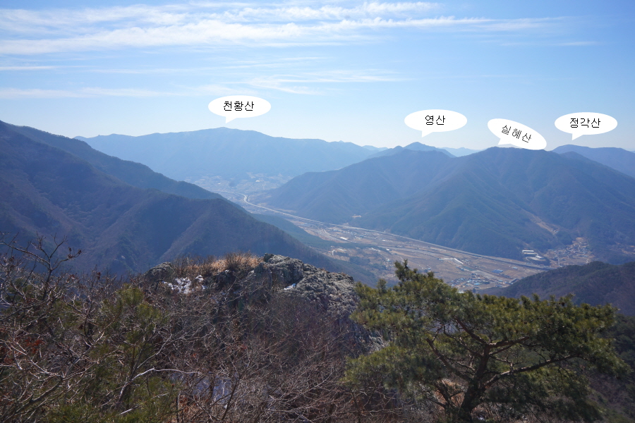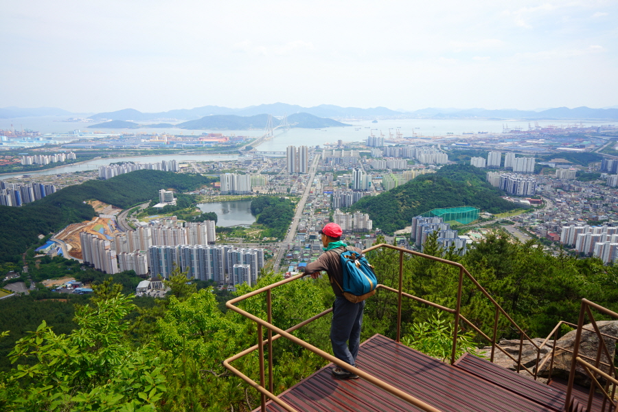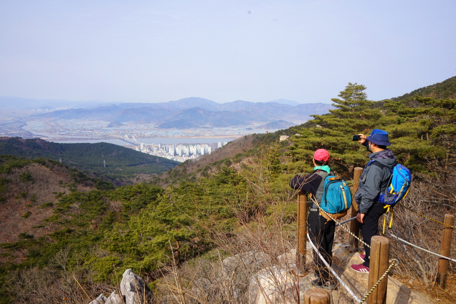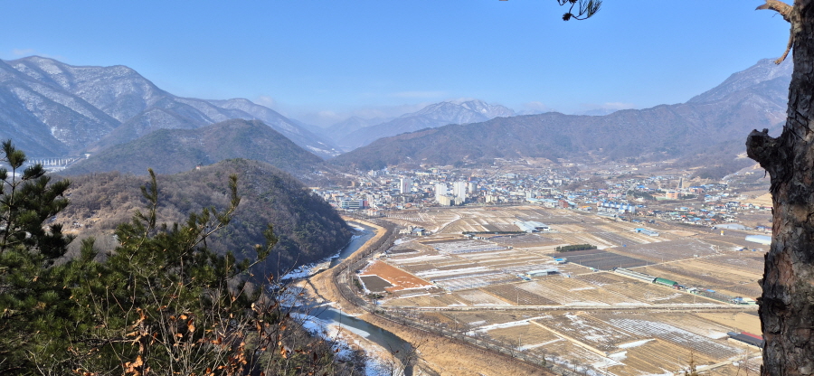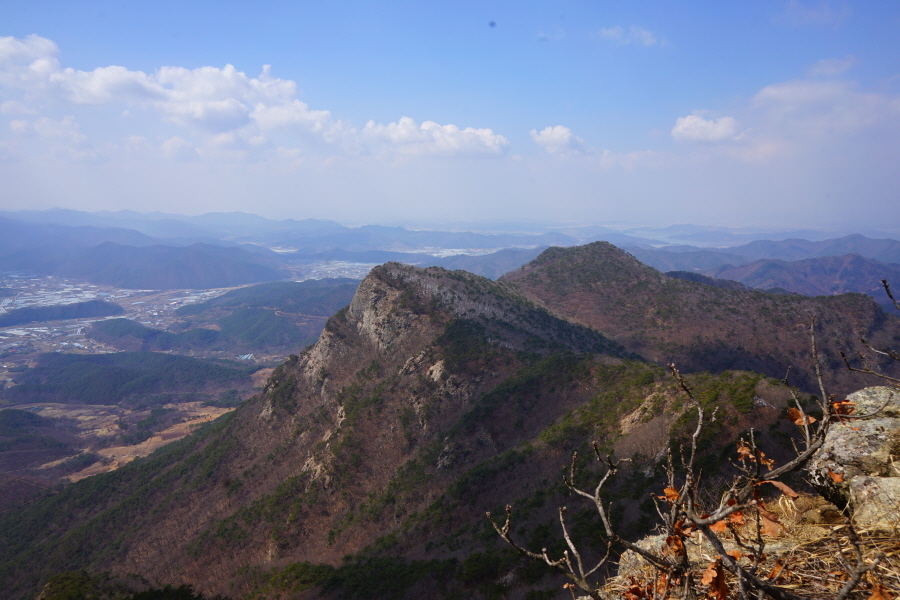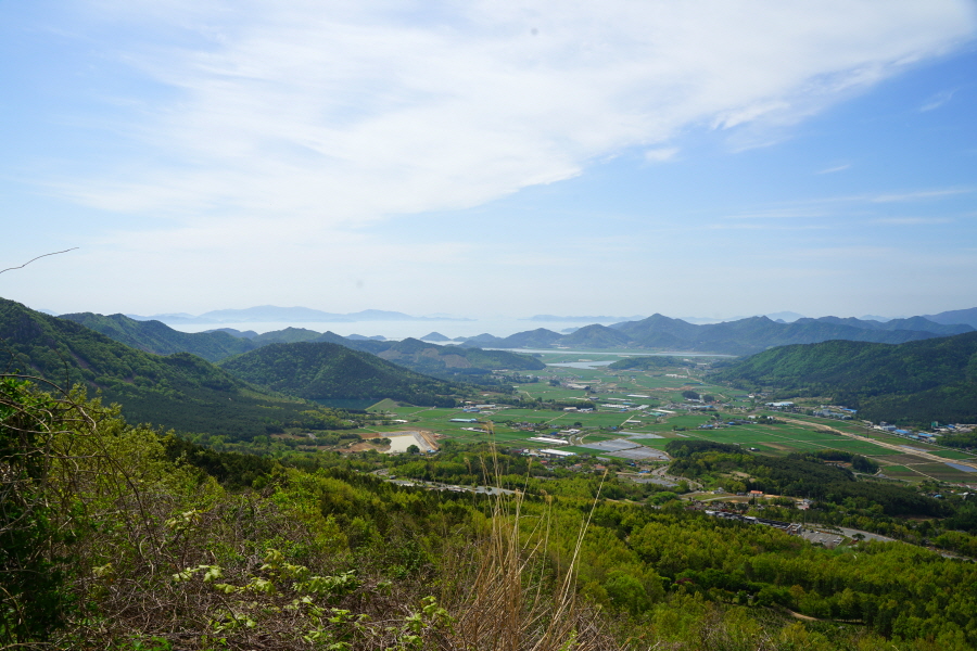굴바위 전망 덱에서 보면 낙동강 건너 오른쪽 정병산에서 왼쪽 시계 반대 방향으로 조망이 열립니다. 대암산 용지봉 불모산 굴암산 금병산 봉화산 신어산 무척산 작약산(김해) 등 김해와 창원의 산이, 발아래는 초동저수지와 밀양과 창원을 잇는 수산대교, 창원시 의창구 대산면 들판의 비닐하우스, 김해시 진영읍의 아파트 단지 등 조망이 시원하게 펼쳐집니다.