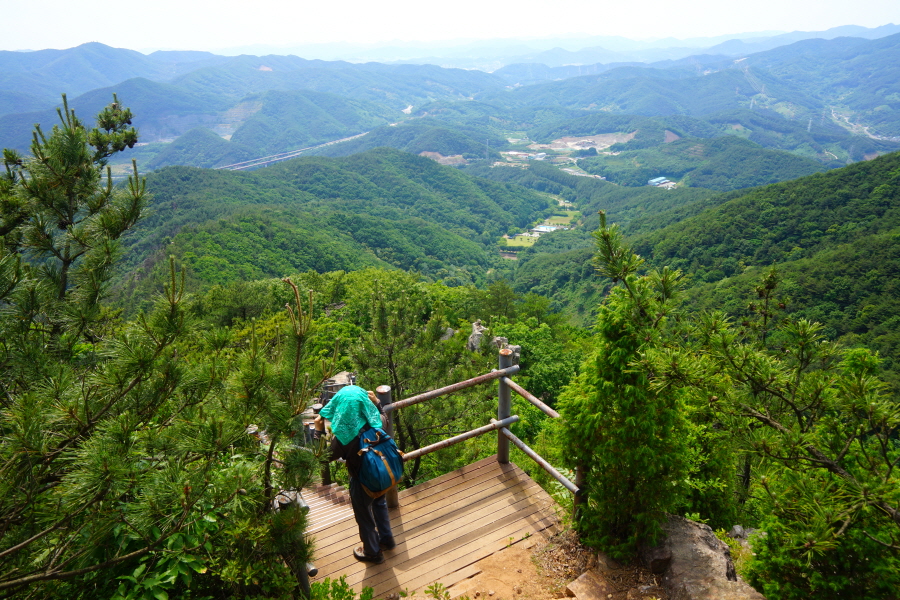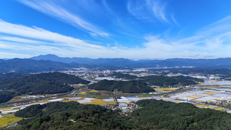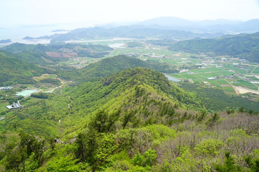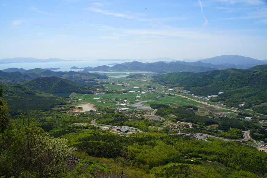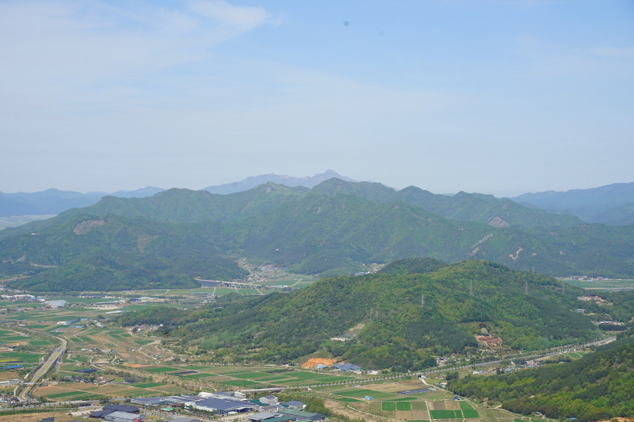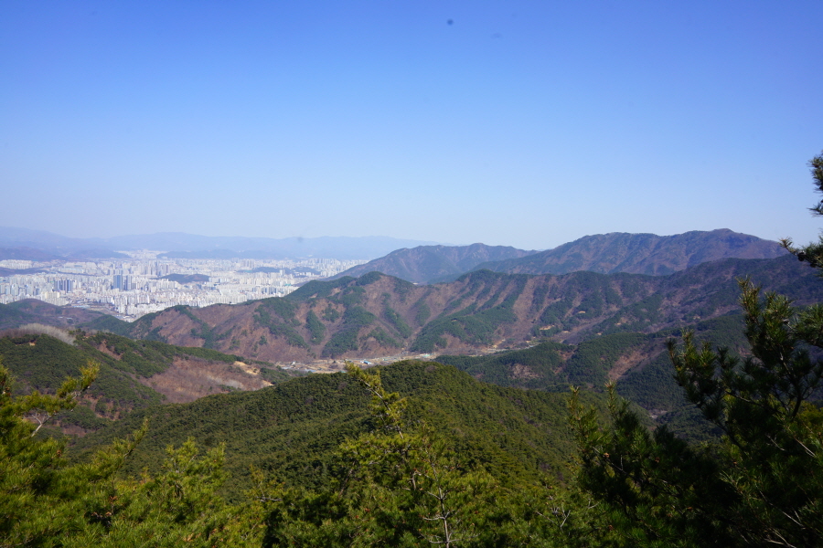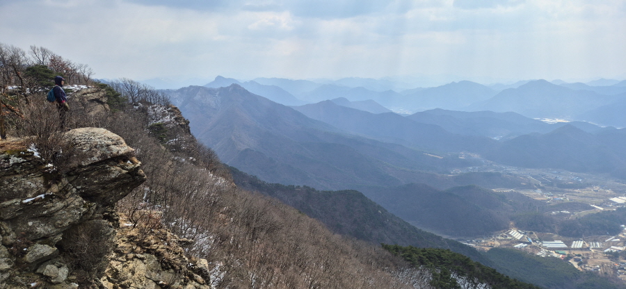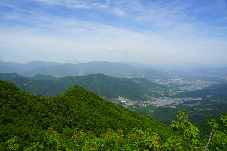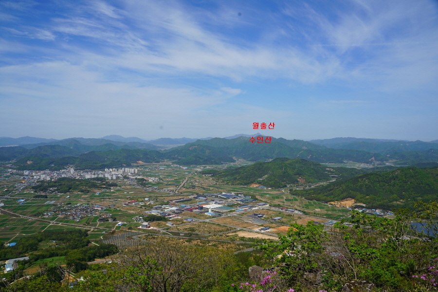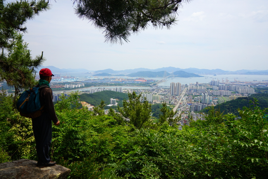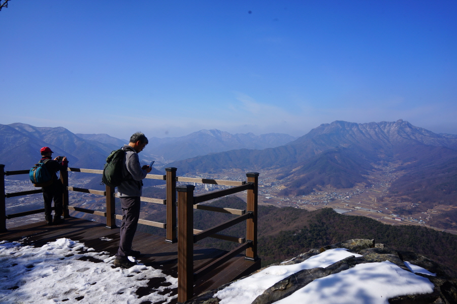 굴바위 전망 덱에서 보면 낙동강 건너 오른쪽 정병산에서 왼쪽 시계 반대 방향으로 조망이 열립니다. 대암산 용지봉 불모산 굴암산 금병산 봉화산 신어산 무척산 작약산(김해) 등 김해와 창원의 산이, 발아래는 초동저수지와 밀양과 창원을 잇는 수산대교, 창원시 의창구 대산면 들판의 비닐하우스, 김해시 진영읍의 아파트 단지 등 조망이 시원하게 펼쳐집니다.