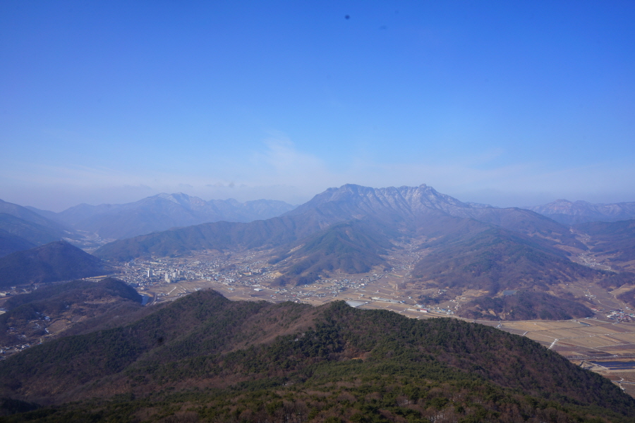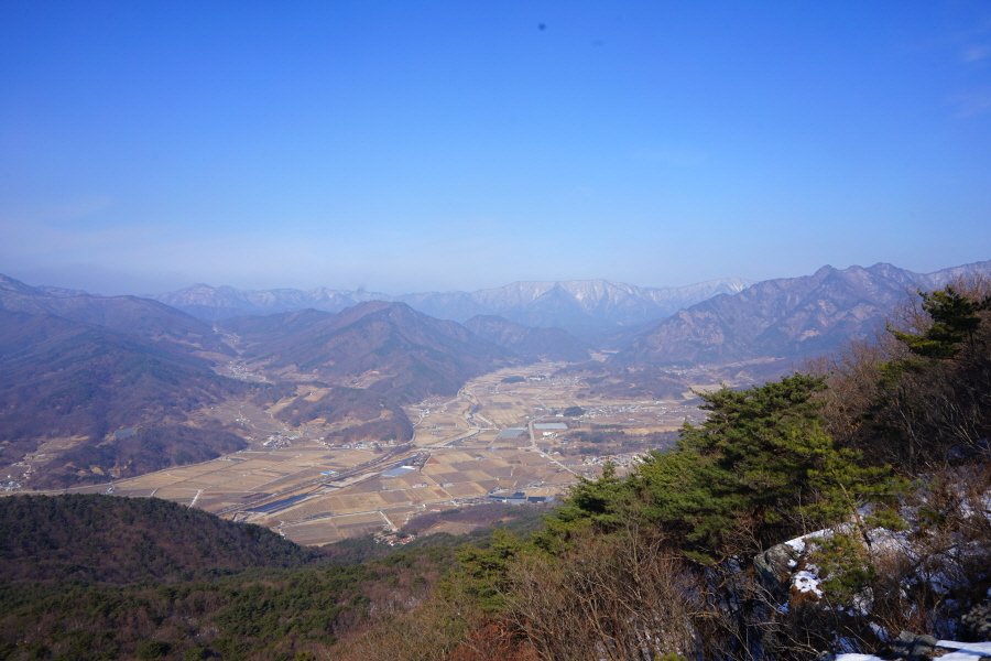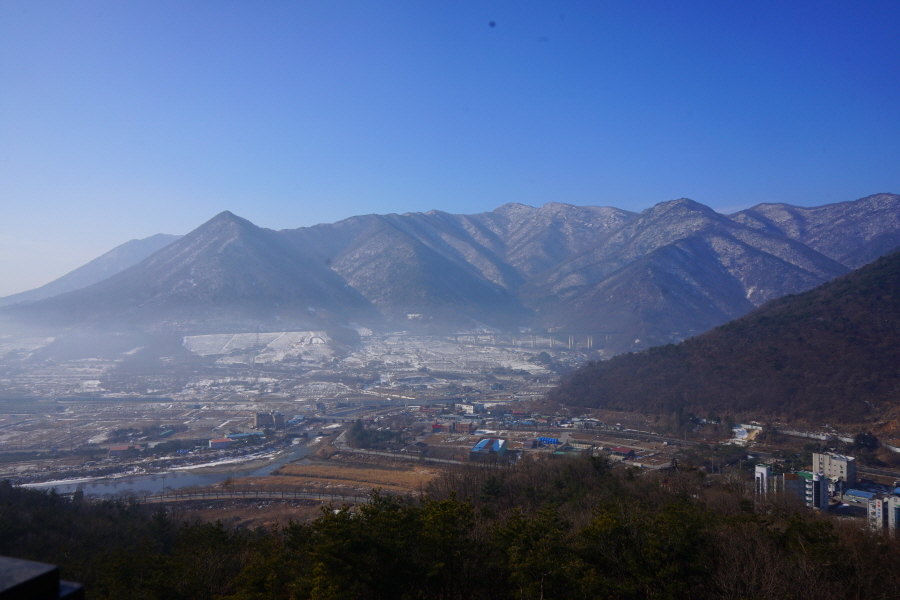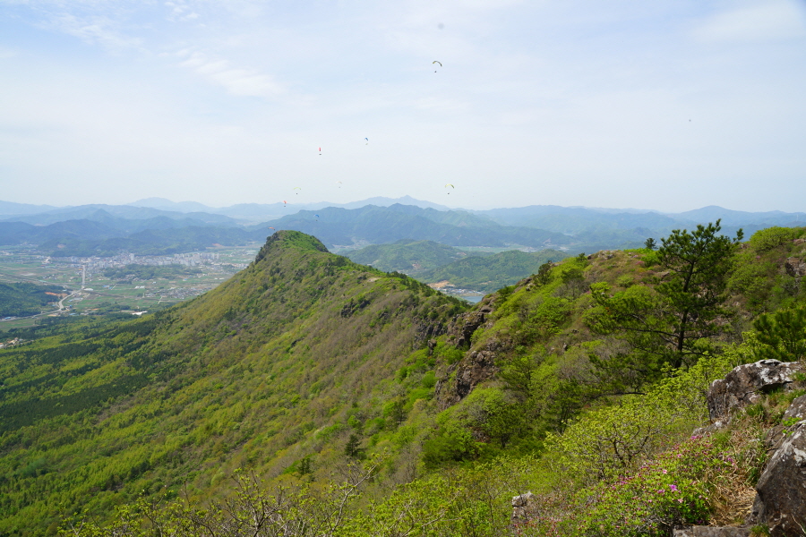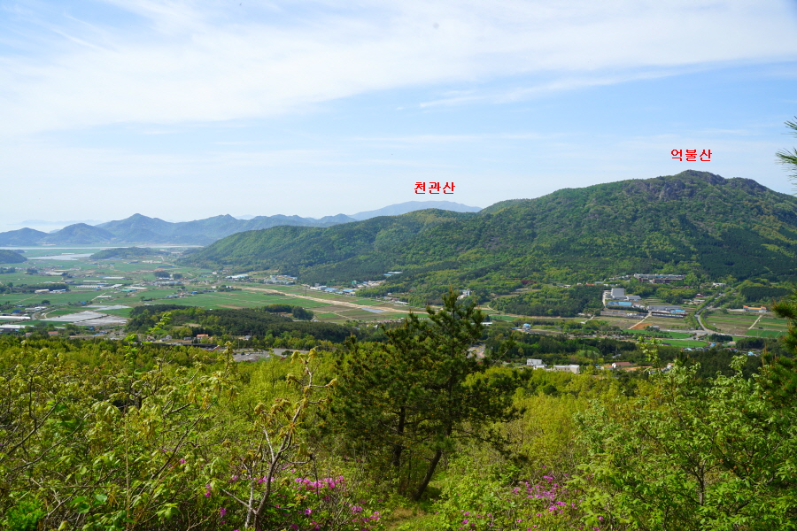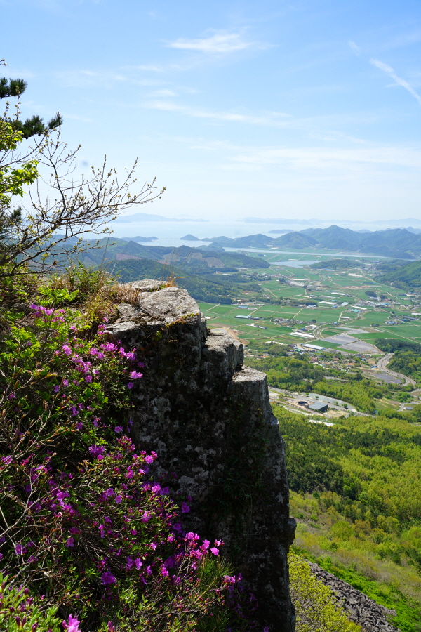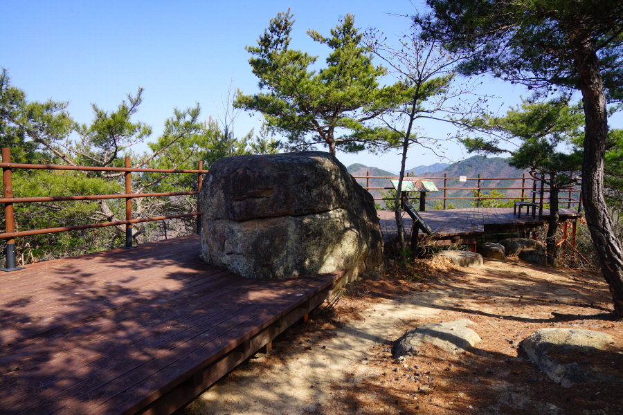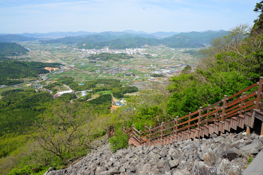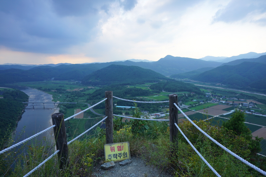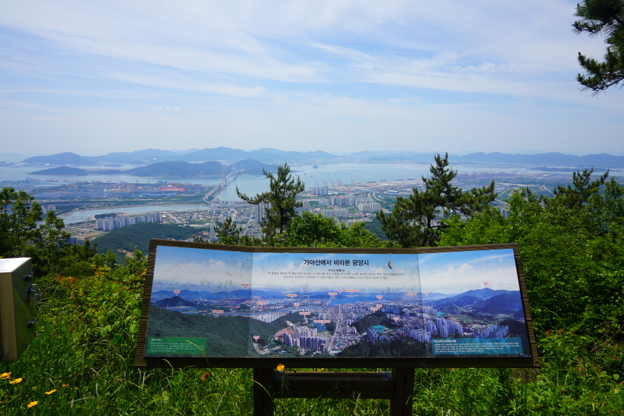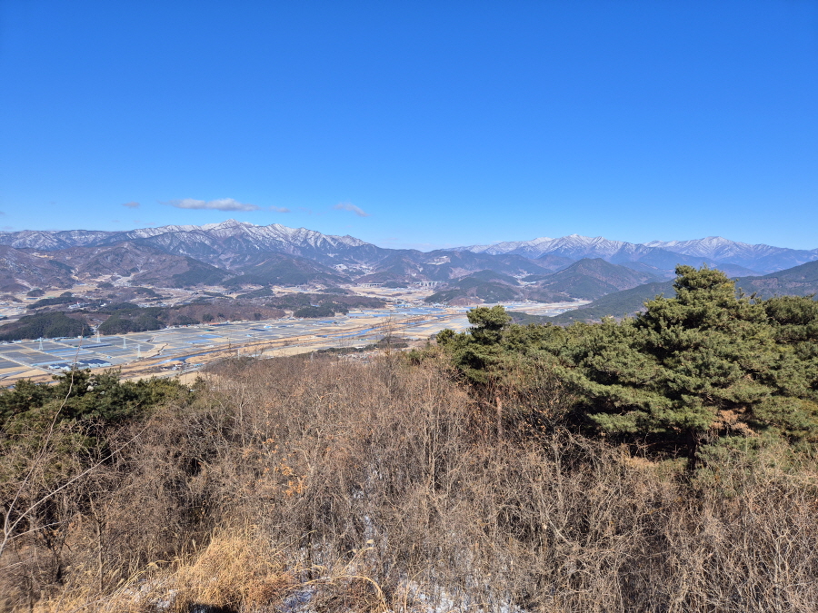 굴바위 전망 덱에서 보면 낙동강 건너 오른쪽 정병산에서 왼쪽 시계 반대 방향으로 조망이 열립니다. 대암산 용지봉 불모산 굴암산 금병산 봉화산 신어산 무척산 작약산(김해) 등 김해와 창원의 산이, 발아래는 초동저수지와 밀양과 창원을 잇는 수산대교, 창원시 의창구 대산면 들판의 비닐하우스, 김해시 진영읍의 아파트 단지 등 조망이 시원하게 펼쳐집니다.