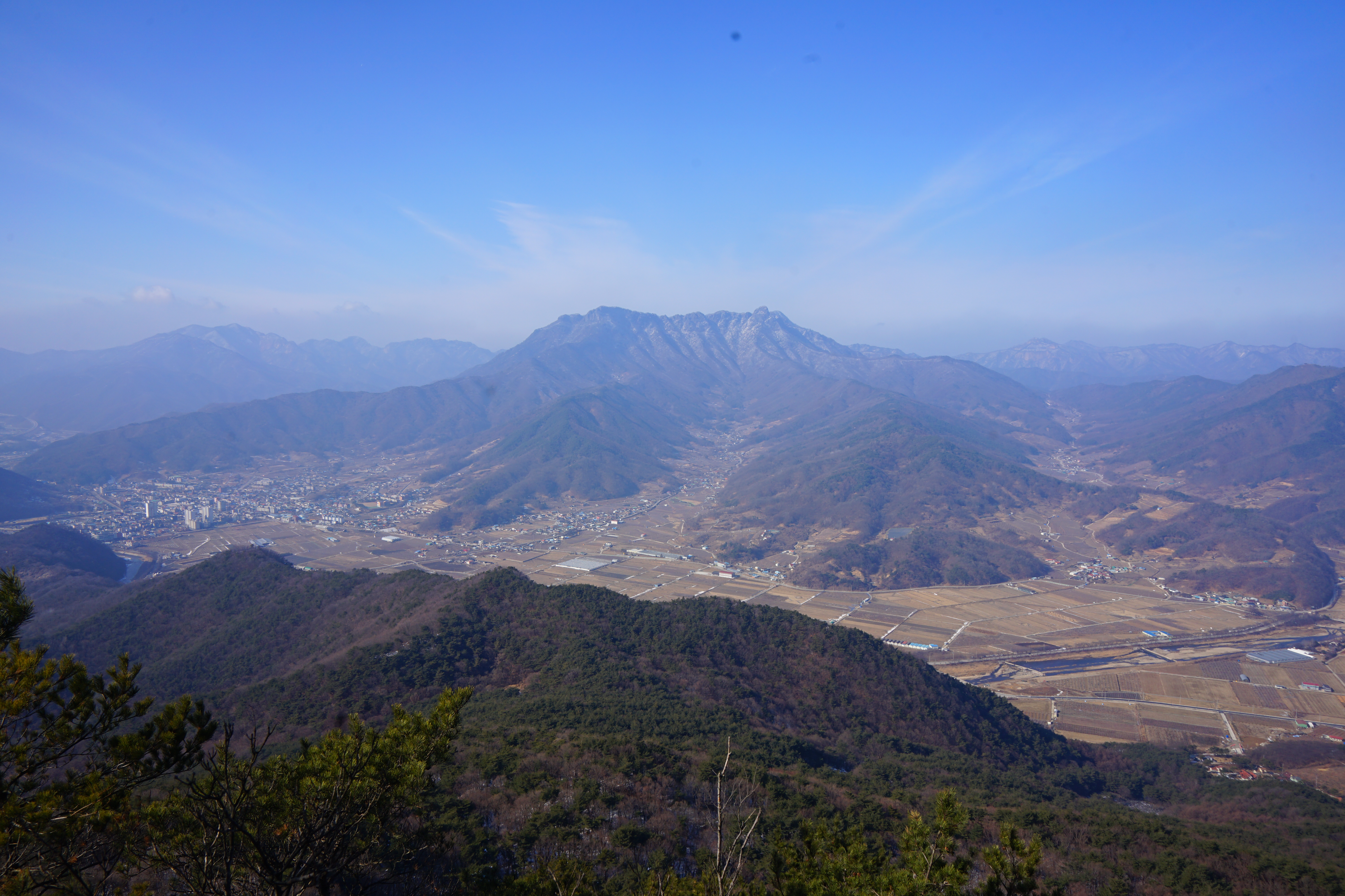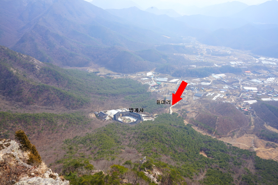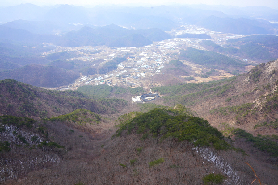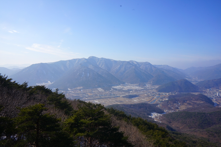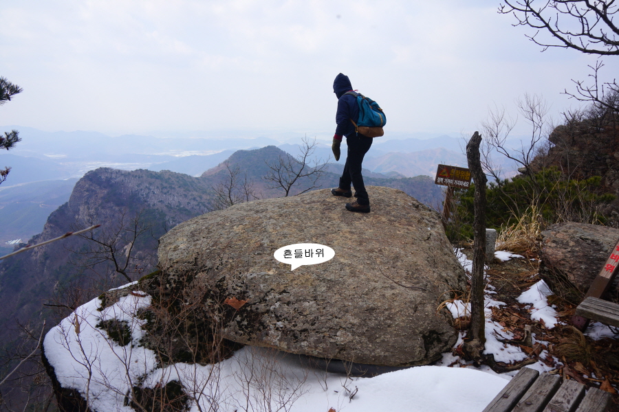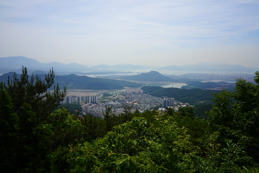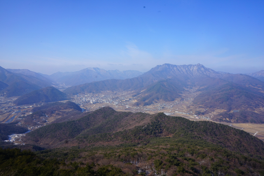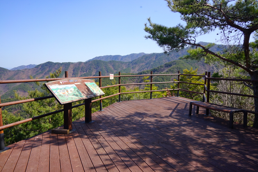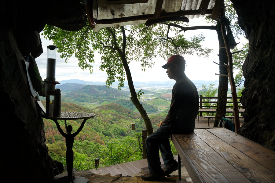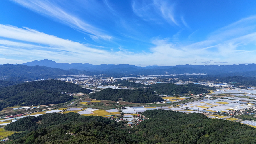굴바위 전망 덱에서 보면 낙동강 건너 오른쪽 정병산에서 왼쪽 시계 반대 방향으로 조망이 열립니다. 대암산 용지봉 불모산 굴암산 금병산 봉화산 신어산 무척산 작약산(김해) 등 김해와 창원의 산이, 발아래는 초동저수지와 밀양과 창원을 잇는 수산대교, 창원시 의창구 대산면 들판의 비닐하우스, 김해시 진영읍의 아파트 단지 등 조망이 시원하게 펼쳐집니다.