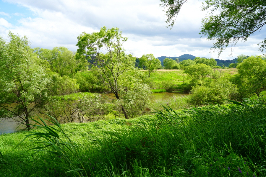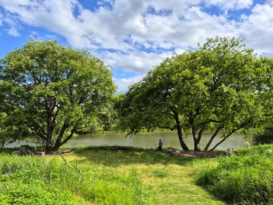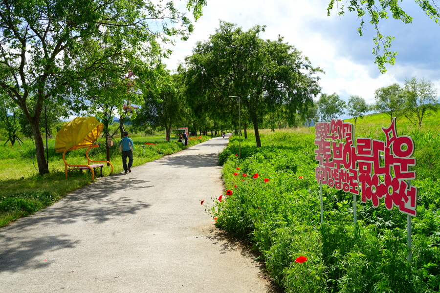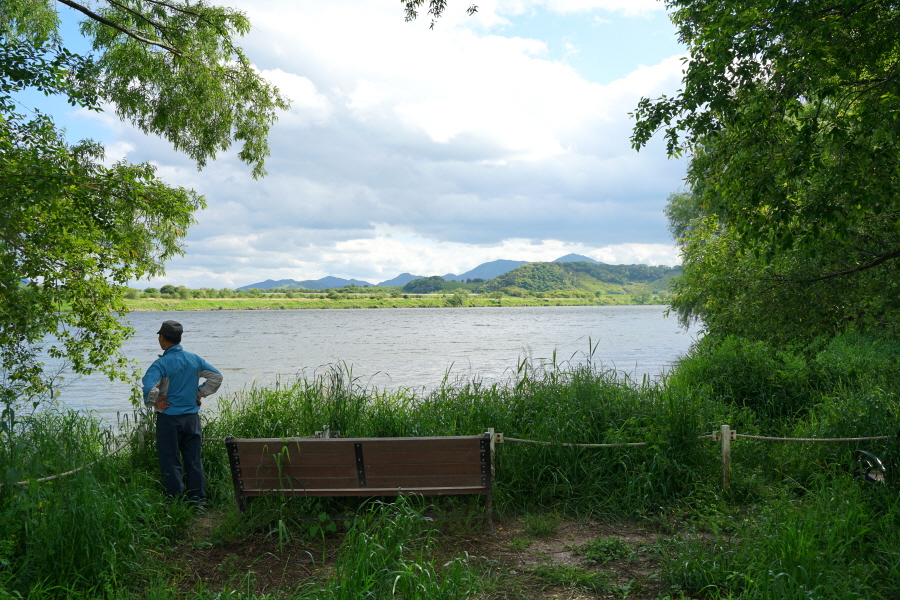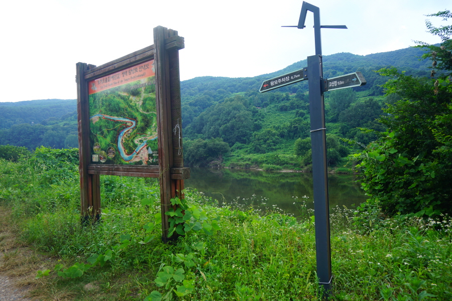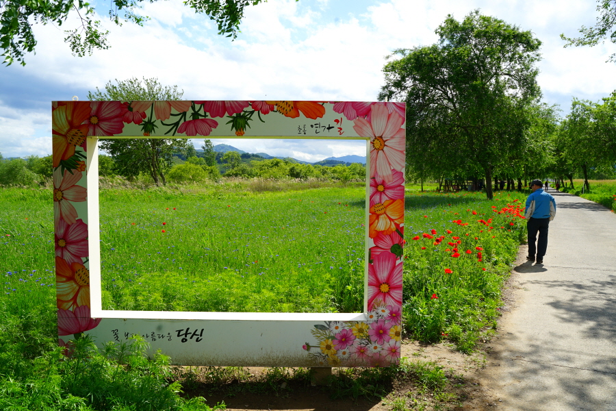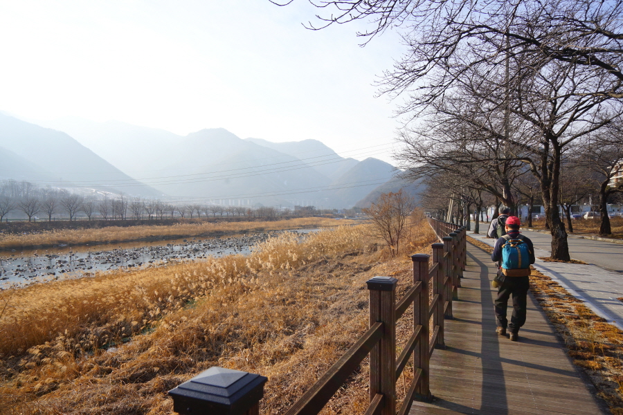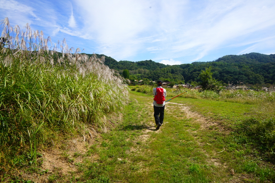 함박산은 산행 거리가 안 길어 낙동강변의 초동 연가길과 함께 걸으면 좋다. 함박산 들머리인 오방마을 공동주차장에서 6㎞쯤 떨어져 있습니다. 9·10월에는 코스모스와 억새가 아름답게 피는 강변길로 국토부가 ‘아름다운 우리 강 100선’에 지정했습니다. 초동 연가길 주차장에서 꽃길을 걸은 뒤 반환점인 습지 덱에서 습지 둘레길을 따라 주차장으로 되돌아오면 안내판 기준 4㎞ 쯤 됩니다. 꽃 구경을 하다 보면 1시간30분 안팎 걸립니다.
