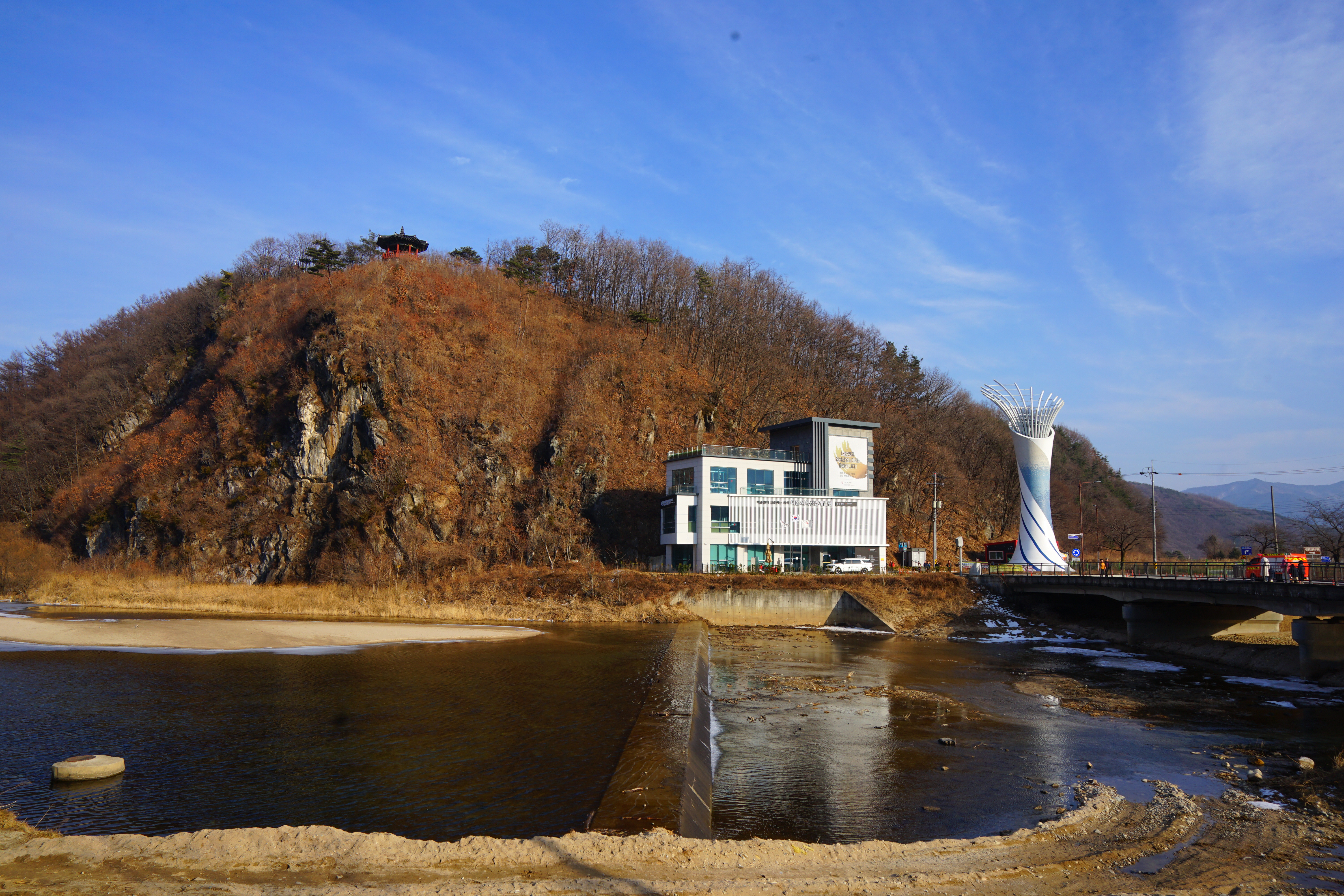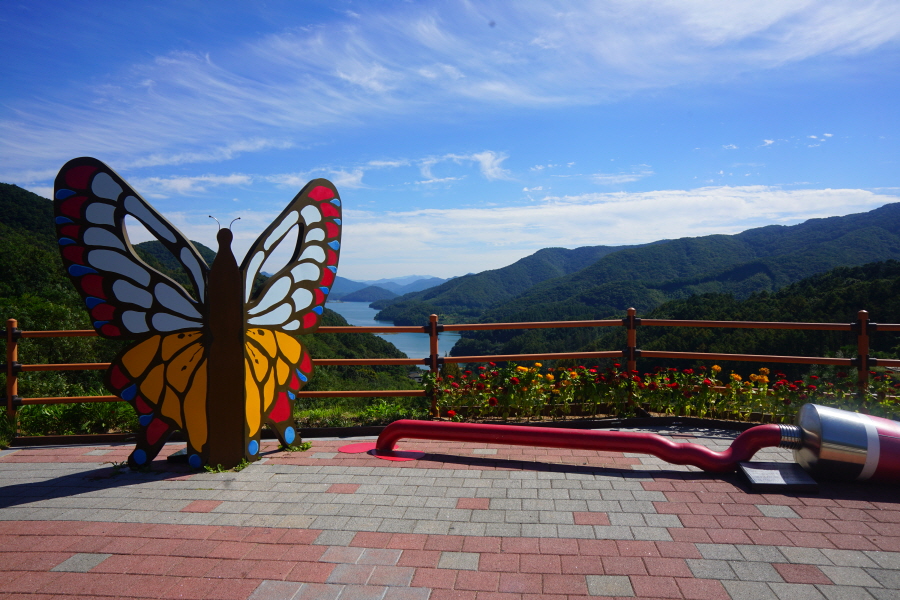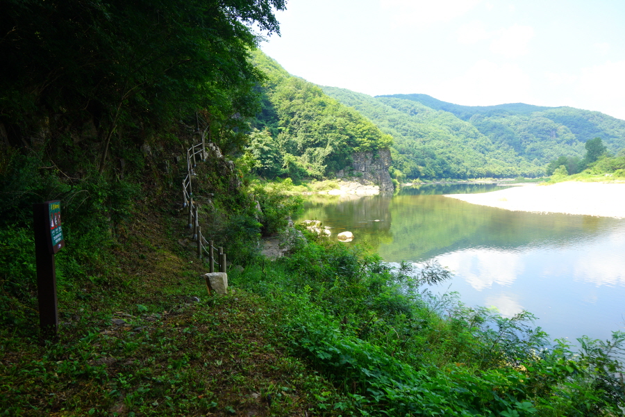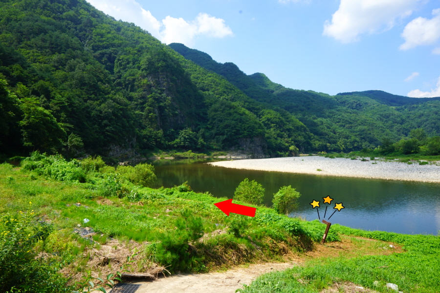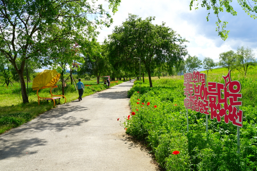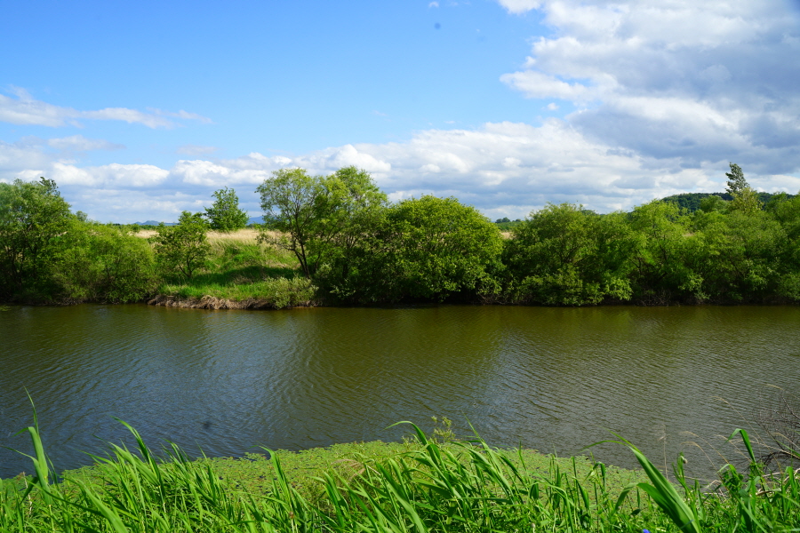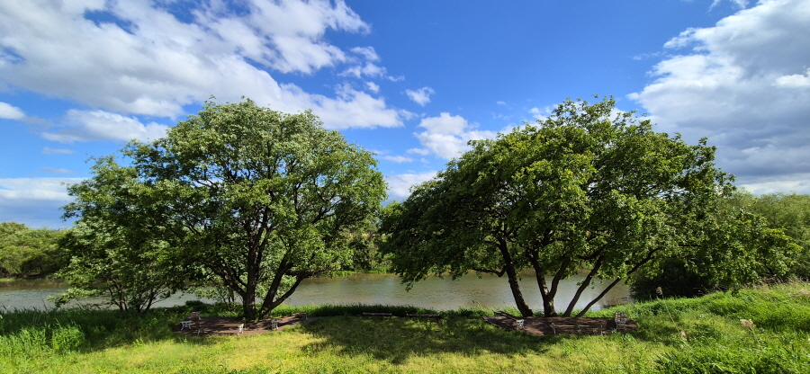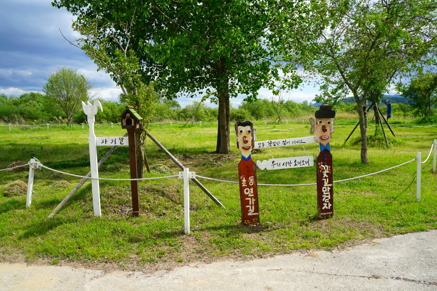 함박산은 산행 거리가 안 길어 낙동강변의 초동 연가길과 함께 걸으면 좋다. 함박산 들머리인 오방마을 공동주차장에서 6㎞쯤 떨어져 있습니다. 9·10월에는 코스모스와 억새가 아름답게 피는 강변길로 국토부가 ‘아름다운 우리 강 100선’에 지정했습니다. 초동 연가길 주차장에서 꽃길을 걸은 뒤 반환점인 습지 덱에서 습지 둘레길을 따라 주차장으로 되돌아오면 안내판 기준 4㎞ 쯤 됩니다. 꽃 구경을 하다 보면 1시간30분 안팎 걸립니다.