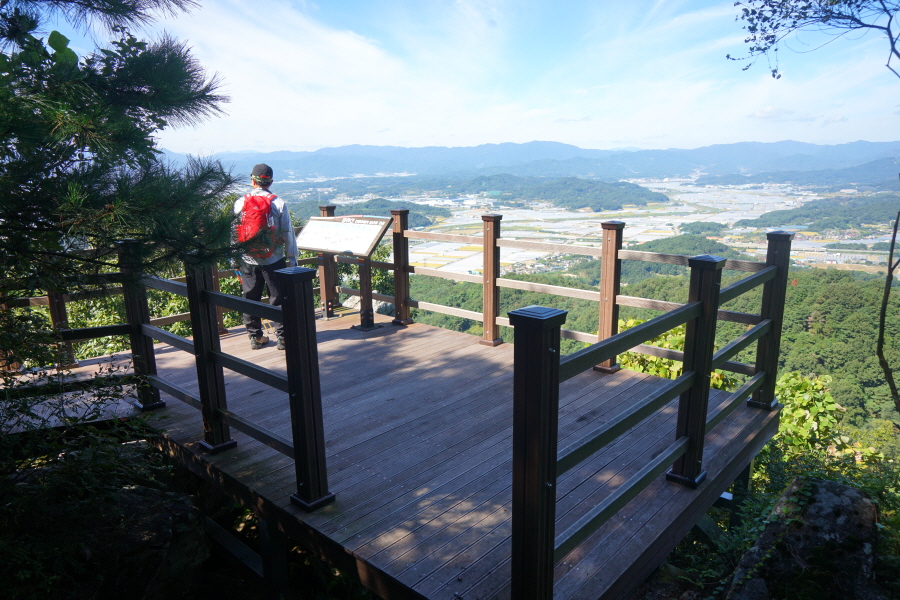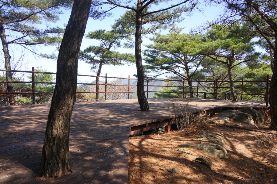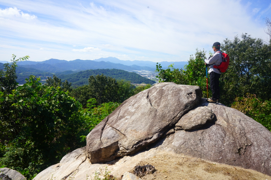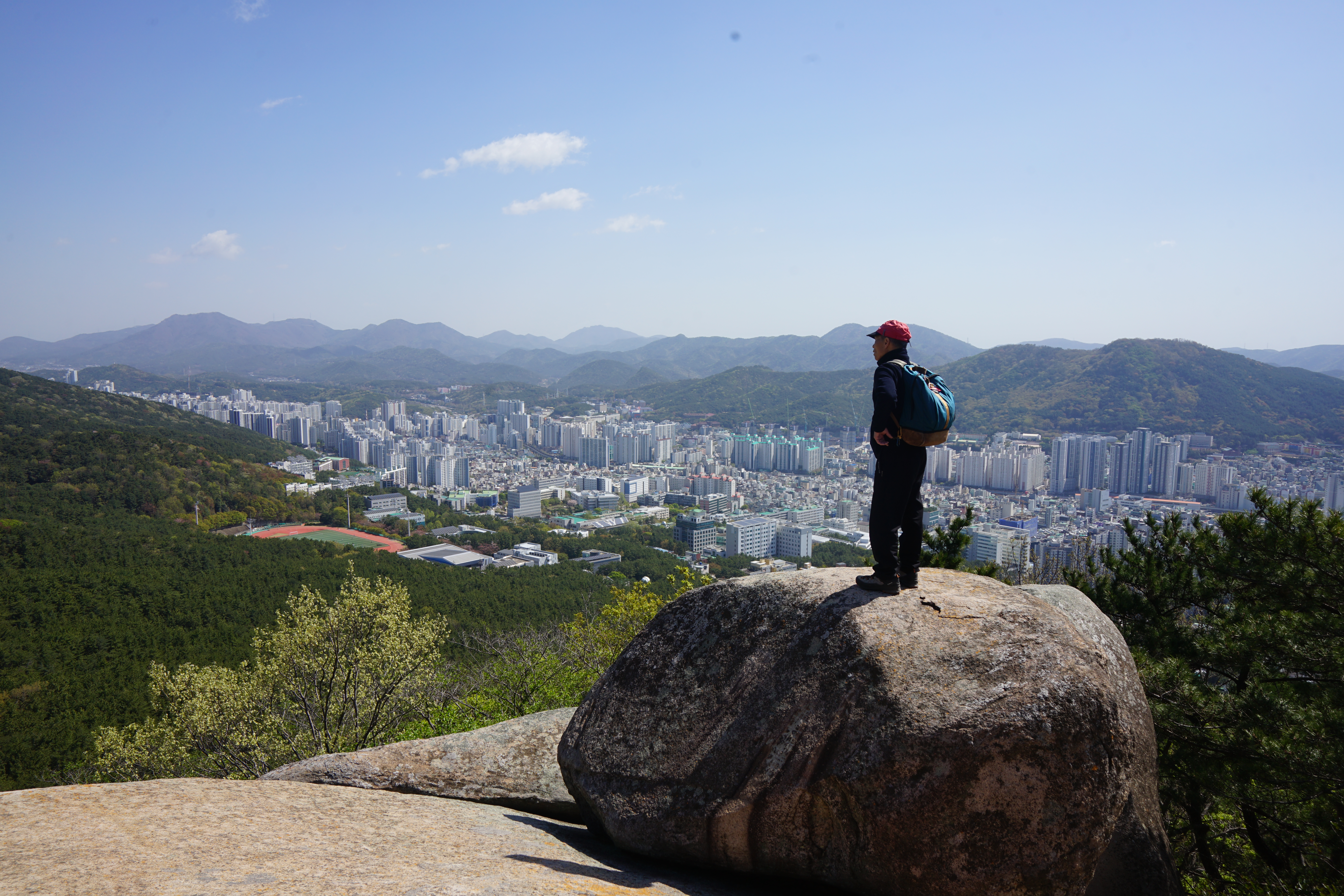 바위를 오르거나 위험한 구간은 안전하게 우회하는 길도 있습니다. 또한 바위에 걸린 로프를 잡고 내려갔다 다시 올라가면 암반 전망대가 나오고 암릉을 우회해도 전망대에 올라 조망을 즐길 수 있습니다. 전망대에 서면 철마산에서 시계방향으로 거문산 달음산 아홉산 개좌산 운봉산 일광산 윤산 장산 센텀시티 광안대교 금련산 등 더 높은 가을 하늘에 멋진 풍광이 펼쳐지며 발아래는 부산대 캠퍼스와 금정구 동래구의 수많은 아파트 단지가 펼쳐집니다.