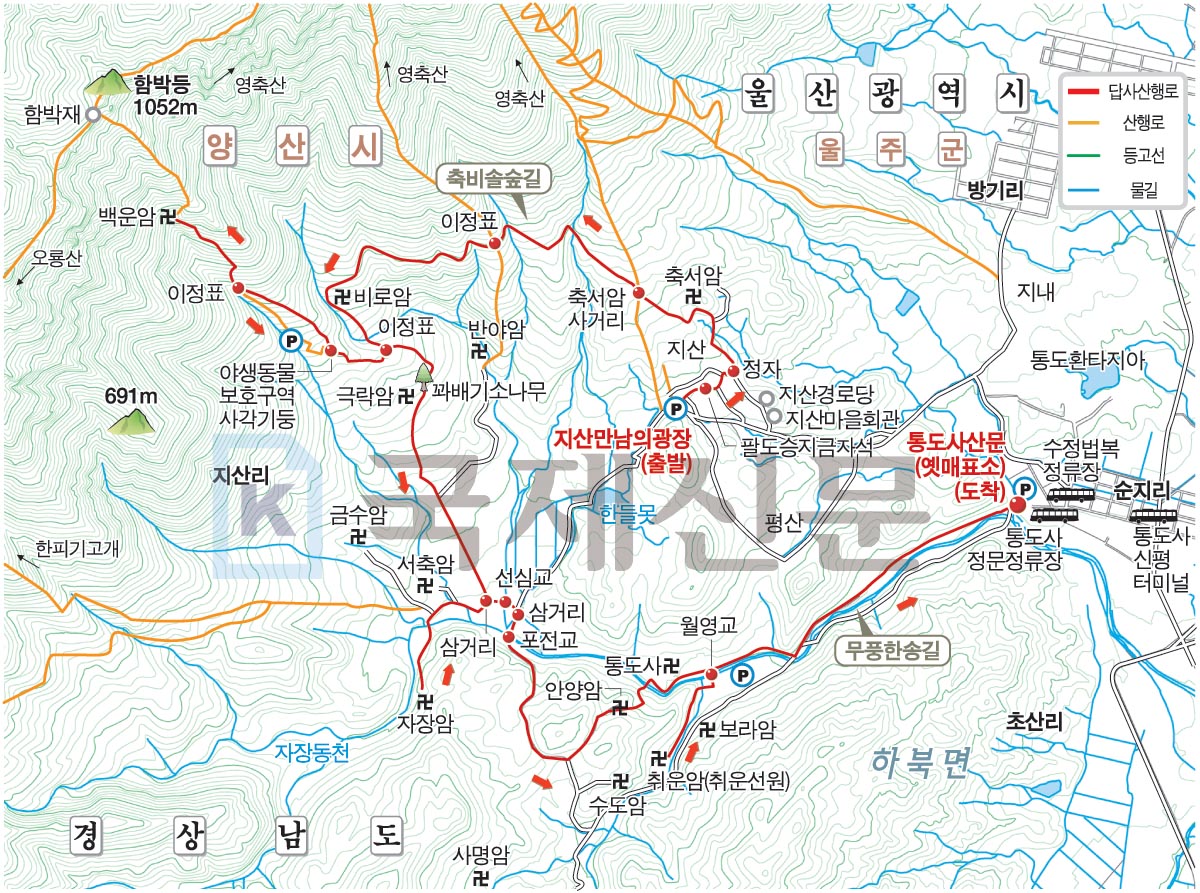 함박산 산행 경로는 다음과 같습니다. 오방동 복지회관 옆 마을공동 주차장~전봇대 굴 바위 갈림길~밀성 박씨 오방 가족 묘원~정상, 탕건바위·굴바위 갈림길~굴 바위~굴바위 아래 갈림길~주 능선 삼거리~386봉~탕건(애기)바위~장군바위 갈림길~장군바위~장군바위 갈림길~함박산 정상~능선 이탈~약수터~굴바위·광제사 갈림길~광제사를 거쳐 오방마을 공동 주차장에 되돌아오는 원점 회귀 코스입니다. 산행 거리는 약 4.2㎞이며, 2시간 30분 안팎 걸립니다.