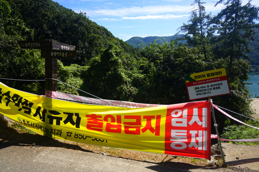 노자산은 조선 시대에 나무를 함부로 못 베게 했던 봉산에 지정되어 숲이 울창합니다. 그 때문인지 멸종위기 동식물이 많이 서식하는데, 노자산 동쪽 사면인 학동리 동백숲(천연기념물 제233호)은 희귀한 새인 멸종위기 야생동물 2급인 팔색조(천연기념물 제204호)의 번식지로 알려져 있습니다.